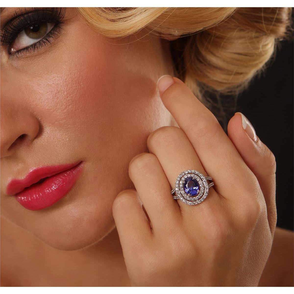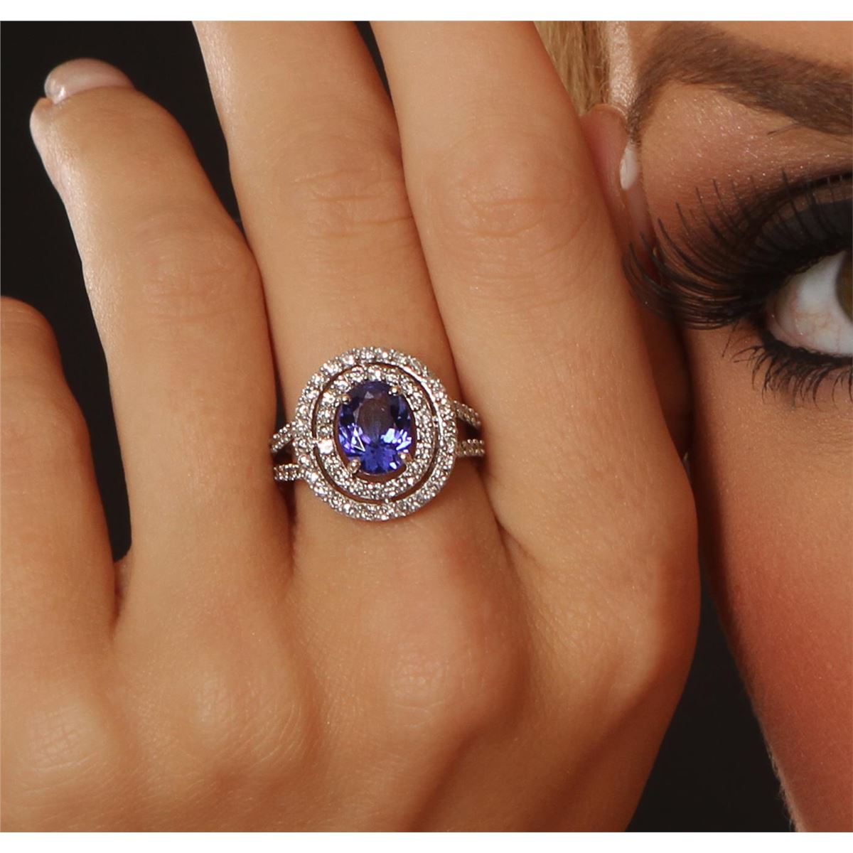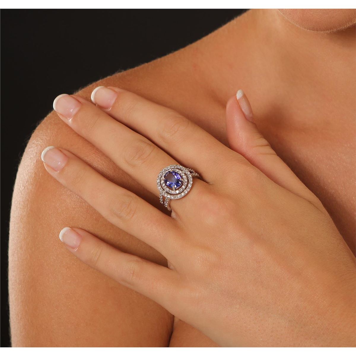 One polished, stamped, and electronically tested solid 14KT White Gold ring mounted with: 1 genuine tanzanite center stone weighing 1.82 carats and 65 genuine round diamonds weighing 0.95 carats. This item weighs 4.9 grams, condition is new, excellent workmanship. AIGL Appraised at $4,635.00.