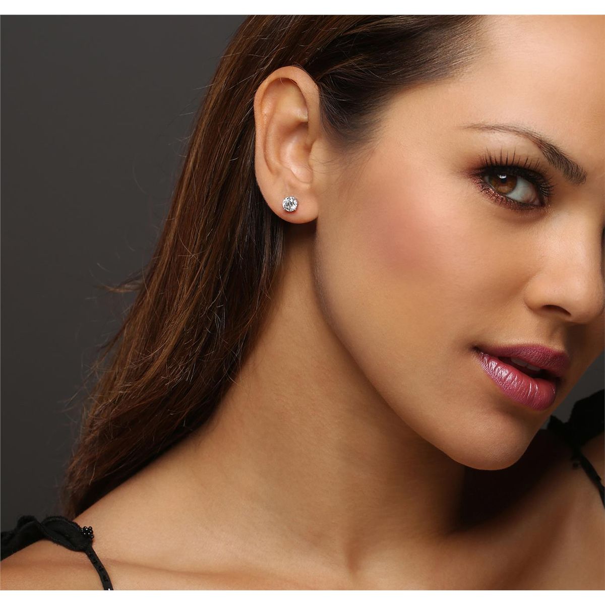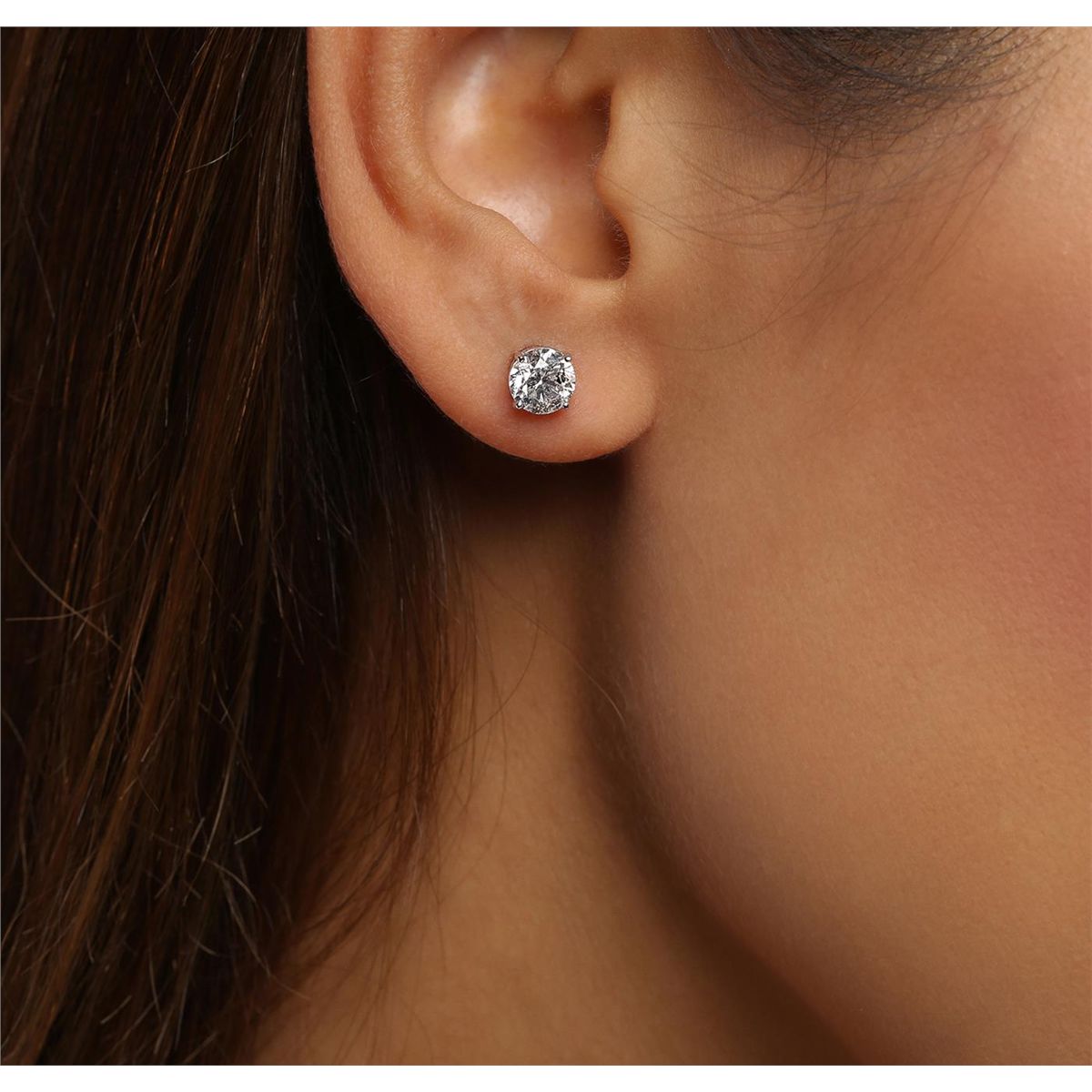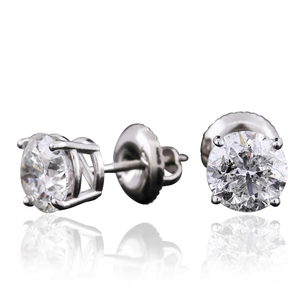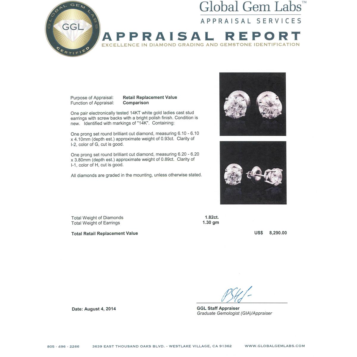 One pair electronically tested 14KT white gold ladies cast stud earrings with screw backs with a bright polish finish. Condition is new. Identified with markings of "14K". Containing: One prong set round brilliant cut diamond, measuring 6.10 - 6.10 x 4.10mm (depth est.) approximate weight of 0.93ct. Clarity: I-2. Color: G, Cut is Good. One prong set round brilliant cut diamond, measuring 6.20 - 6.20 x 3.80mm (depth est.) approximate weight of 0.89ct. Clarity: I-1. Color: H, Cut is Good. All diamonds are graded in the mounting, unless otherwise stated. Total Weight of Diamonds 1.82ct. Total Weight of Earrings 1.30 grams.