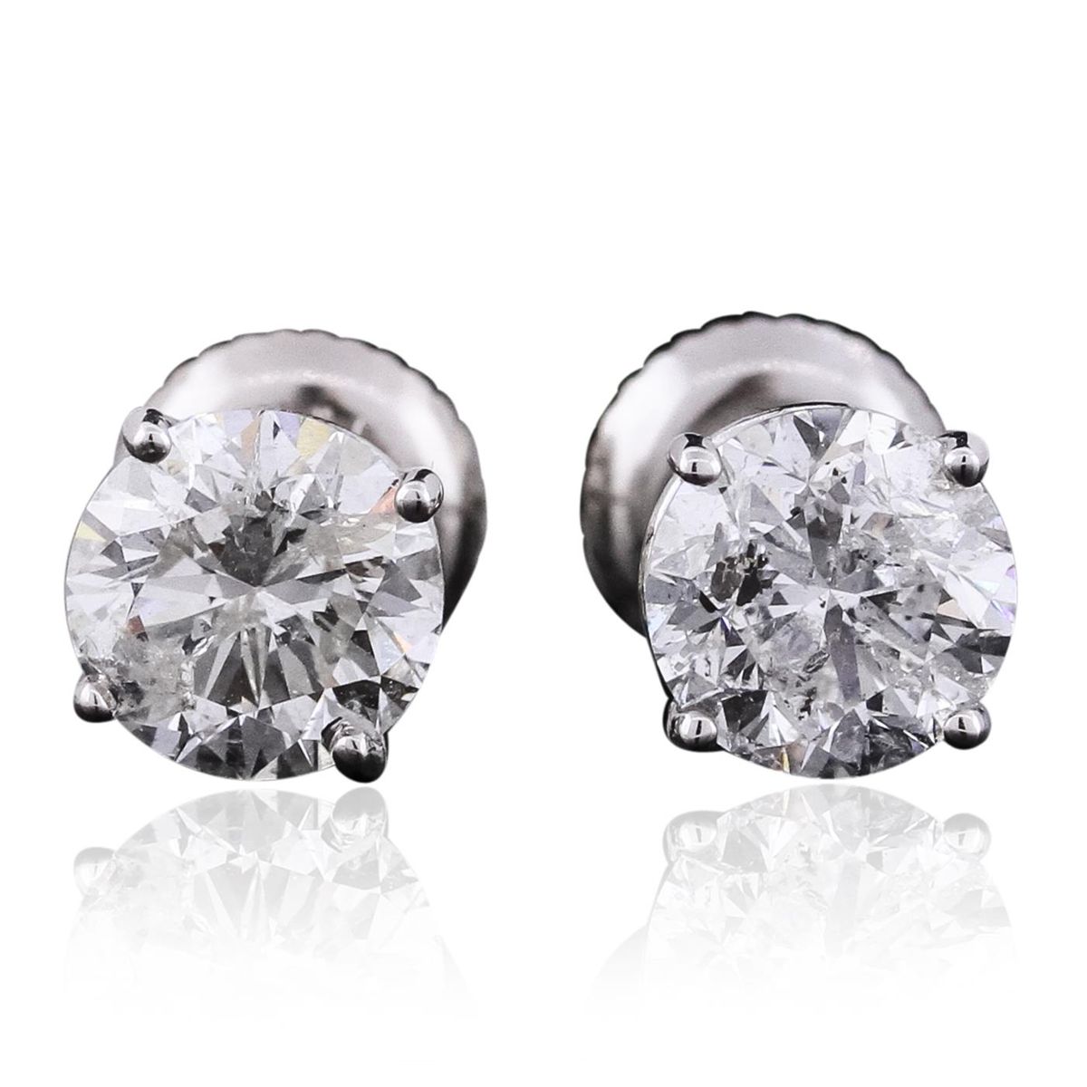 One pair electronically tested 14KT white gold ladies cast stud earrings with screw backs with a bright polish finish. Condition is new. Identified with markings of "14K". Containing: One prong set round brilliant cut diamond, measuring 6.10 - 6.10 x 4.10mm (depth est.) approximate weight of 0.93ct. Clarity: I-2. Color: G, Cut is Good. One prong set round brilliant cut diamond, measuring 6.20 - 6.20 x 3.80mm (depth est.) approximate weight of 0.89ct. Clarity: I-1. Color: H, Cut is Good. All diamonds are graded in the mounting, unless otherwise stated. Total Weight of Diamonds 1.82ct. Total Weight of Earrings 1.30 grams. GGL Appraised at $8,290.00.