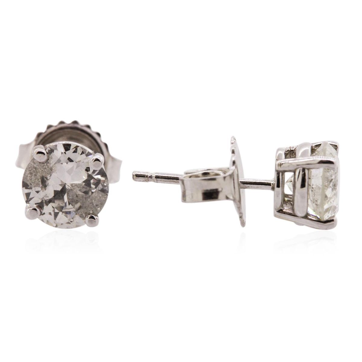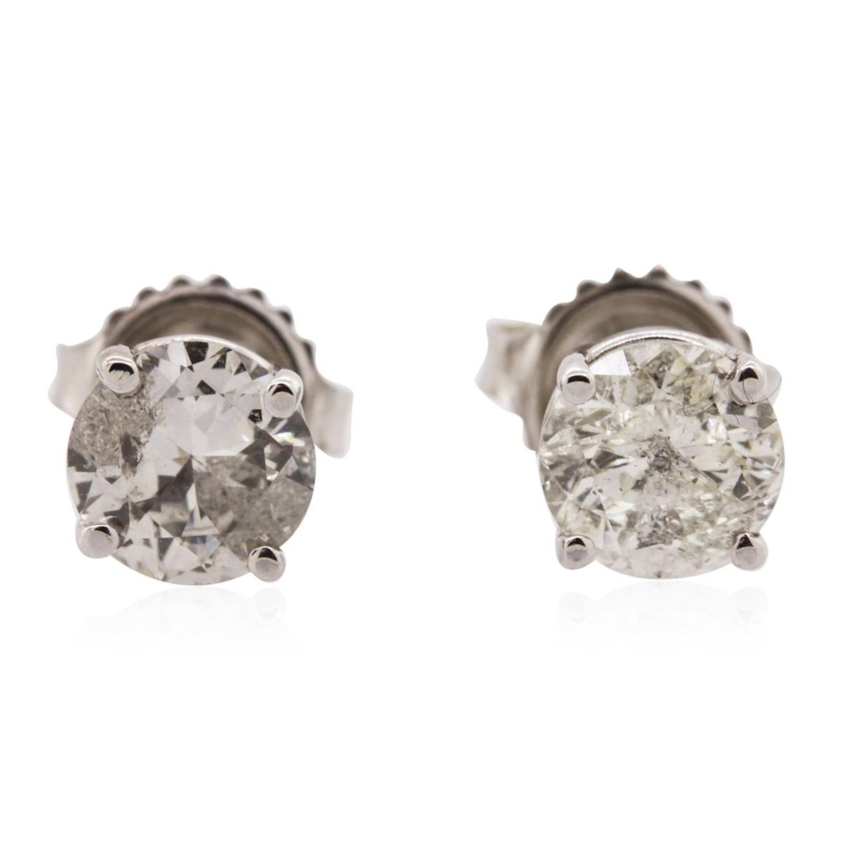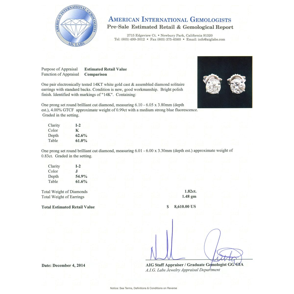 One pair electronically tested 14KT white gold cast & assembled diamond solitaire earrings with standard backs. Bright polish finish. Identified with markings of "14K". Condition is new, good workmanship. Containing: One prong set round brilliant cut diamond, measuring 6.10 - 6.05 x 3.80mm (depth est.), 4.00.%. GTCF approximate weight of 0.99ct with a medium strong blue fluorescence. Graded in the setting. Clarity: I-2. Color: 62.6%. Table 61.0%. One prong set round brilliant cut diamond, measuring 6.01 - 6.00 x 3.30mm (depth est.) approximate weight of 0.83ct. Graded in the setting. Clarity: I-2. Color: 54.9%. Table 61.6%. Total Weight of Diamonds 1.82ct. Total Weight of Earrings 1.48 grams. AIG Appraised at $8,610.00.