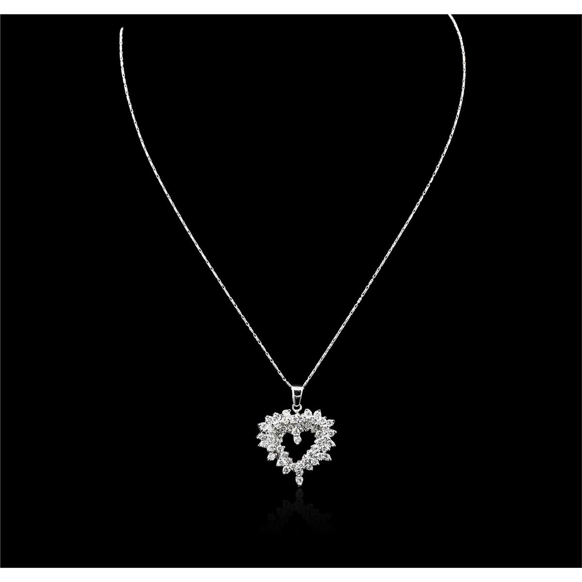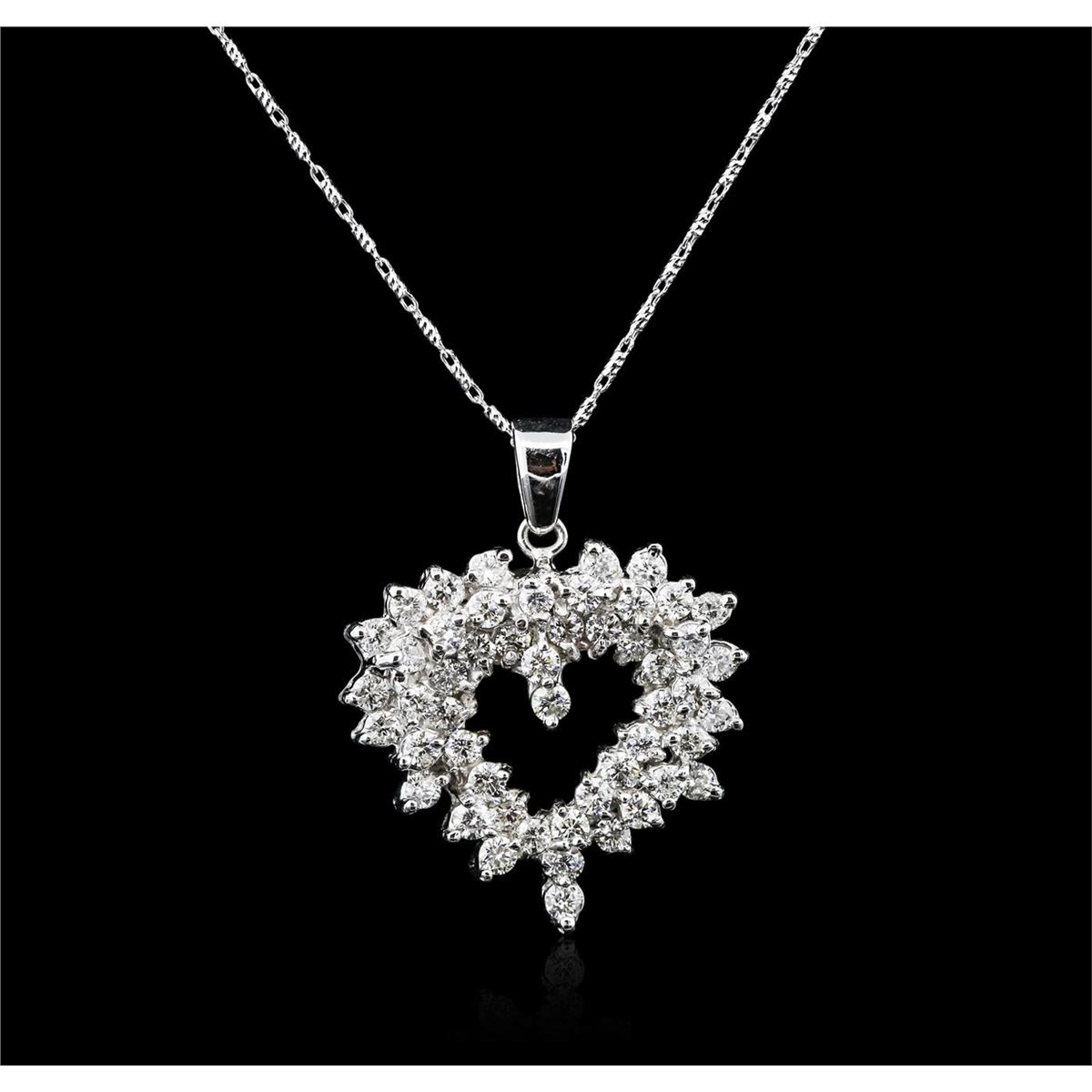One electronically tested 14KT white gold ladies combination cast & assembled diamond pendant & chain 18.0" long, fancy link with a lobster claw clasp with a bright polish finish. Identified with markings of "14K". Condition is new. Containing: Forty-Four prong set round brilliant cut diamonds, measuring 2.50 - 2.00 x 1.35mm (depth est.) approximate total weight of 44 Stones = 1.83ct. Clarity: SI-2 to I-1. Color: J - K, Cut is Good. All diamonds are graded in the mounting, unless otherwise stated. Total Weight of Diamonds 1.83ct. Total Weight of Pendant & Chain 12.80 grams. GGL Appraised at $7,875.00.