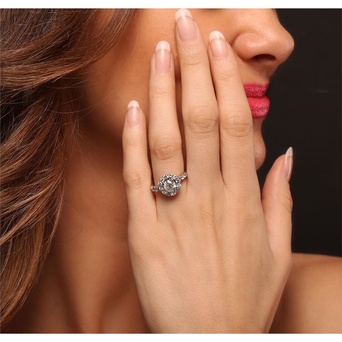 One electronically tested 14KT white gold ladies cast diamond unity ring with a bright polish finish. Condition is new, good workmanship. The featured diamond is set within a diamond bezel supported by diamond set shoulders, completed by a two and one-half millimeter wide band. Identified with markings of "585". Containing: One prong set round brilliant cut diamond, measuring 6.15 - 6.10 x 4.10mm (depth est.), 5.00.%. GTCF approximate weight of 1.10ct. Graded in the setting. Clarity: I-2. Color: JDepth 66.9%. Table 57.1%. Eighteen prong set round brilliant cut diamonds, measuring 2.50 - 1.80 x 1.29mm (depth est.) approximate. Total Weight of 18 Stones = 0.73ct. Graded in the setting. Clarity: I-1 to I-2. Color: I - K. Total Weight of Diamonds 1.83ct. Total Weight of Ring 3.96 grams. AIG Appraised at $10,635.00.