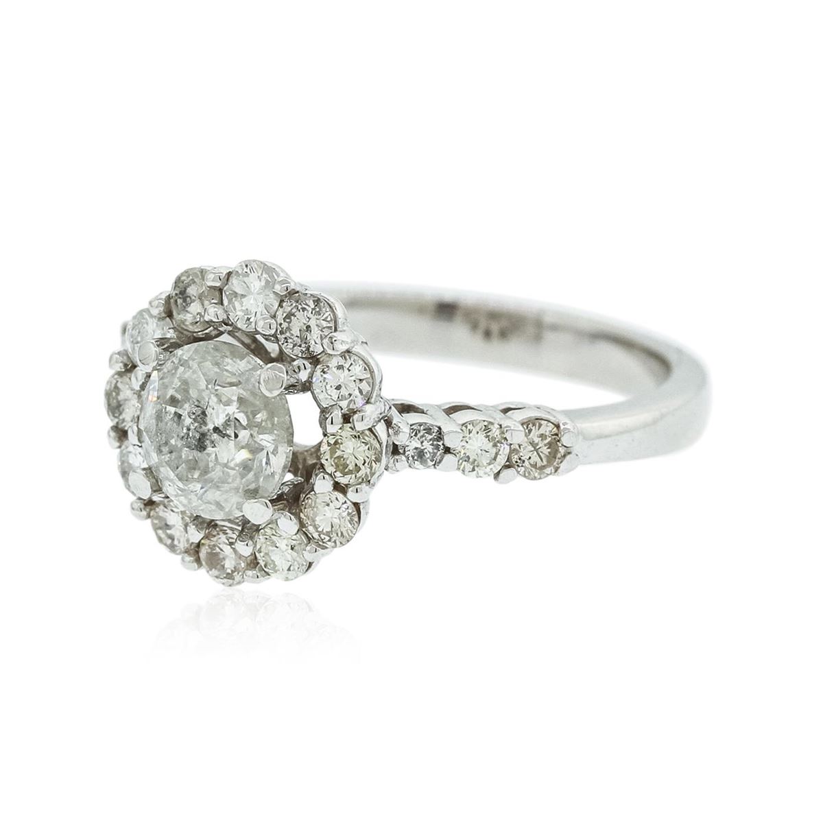 One electronically tested 14KT white gold ladies cast diamond unity ring with a bright polish finish. Condition is new, good workmanship. The featured diamond is set within a diamond bezel supported by diamond set shoulders, completed by a two and one-half millimeter wide band. Identified with markings of "585". Containing: One prong set round brilliant cut diamond, measuring 6.15 - 6.10 x 4.10mm (depth est.), 5.00.%. GTCF approximate weight of 1.10ct. Graded in the setting. Clarity: I-2. Color: JDepth 66.9%. Table 57.1%. Eighteen prong set round brilliant cut diamonds, measuring 2.50 - 1.80 x 1.29mm (depth est.) approximate. Total Weight of 18 Stones = 0.73ct. Graded in the setting. Clarity: I-1 to I-2. Color: I - K. Total Weight of Diamonds 1.83ct. Total Weight of Ring 3.96 grams. AIG Appraised at $10,635.00.