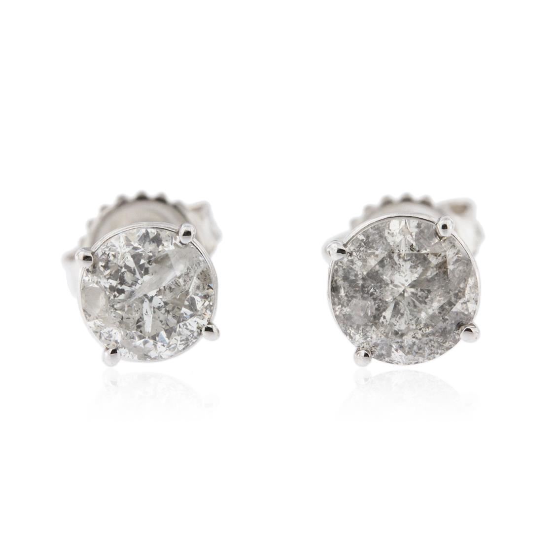 One pair electronically tested 14KT white gold ladies cast diamond stud earrings with friction posts with a bright polish finish. Condition is new. Containing: One prong set round brilliant cut diamond, measuring 6.60 - 6.55 x 3.95mm (depth est.) approximate weight of 1.04ct. Clarity: I-3. Color: I, Cut is Good. One prong set round brilliant cut diamond, measuring 5.99 - 5.99 x 3.59mm (depth est.) approximate weight of 0.79ct. Clarity: I-3. Color: I, Cut is Good. All diamonds are graded in the mounting, unless otherwise stated. Total Weight of Diamonds 1.83ct. Total Weight of Stud Earrings 1.50 grams. GGL Appraised at $5,335.00.