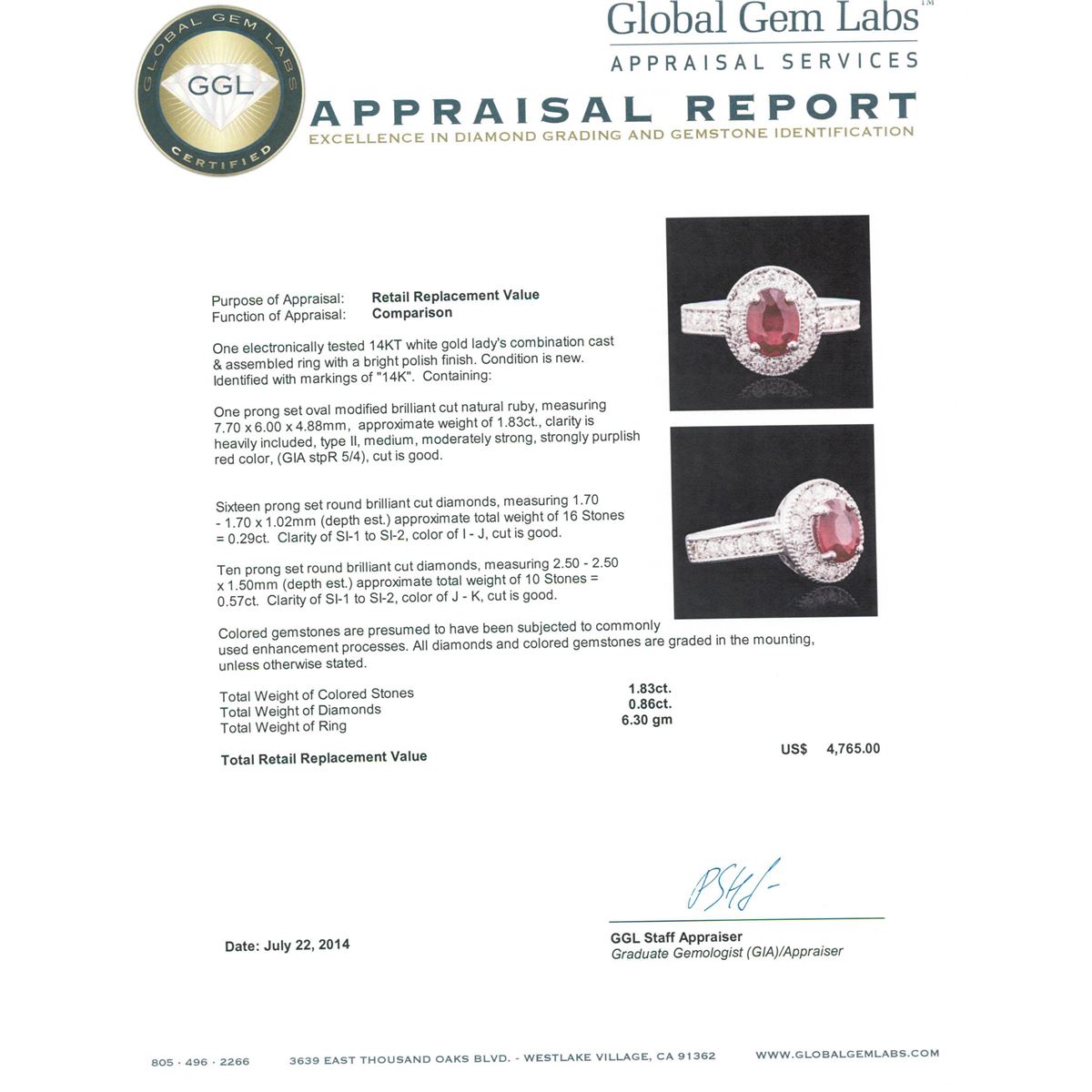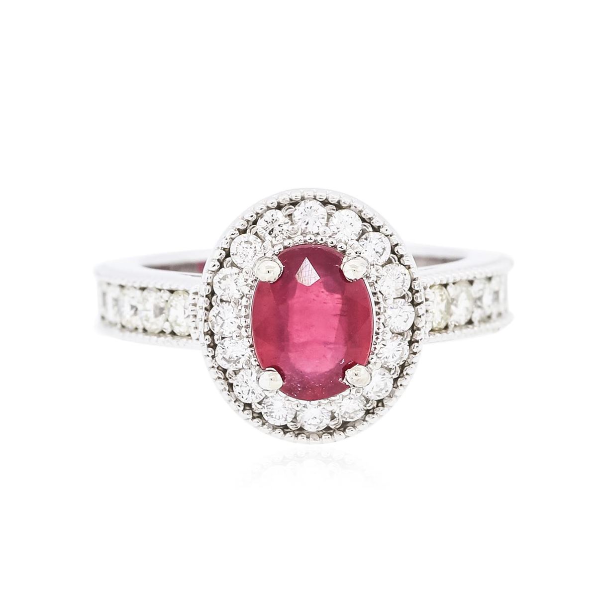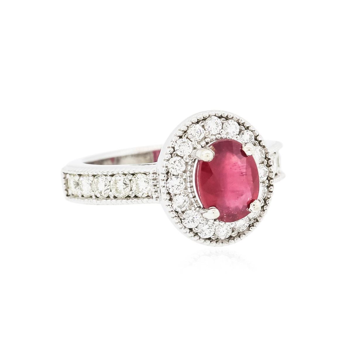 One electronically tested 14KT white gold ladies combination cast & assembled ring with a bright polish finish. Condition is new. Identified with markings of "14K". Containing: One prong set oval modified brilliant cut natural ruby, measuring 7.70 x 6.00 x 4.88mm, approximate weight of 1.83ct., clarity is heavily included, type II, medium, moderately strong, strongly purplish red color, (GIA stpR 5/4), cut is good. Sixteen prong set round brilliant cut diamonds, measuring 1.70 - 1.70 x 1.02mm (depth est.) approximate total weight of 16 Stones = 0.29ct. Clarity: SI-1 to SI-2. Color: I - J, Cut is Good. Ten prong set round brilliant cut diamonds, measuring 2.50 - 2.50 x 1.50mm (depth est.) approximate total weight of 10 Stones = 0.57ct. Clarity: SI-1 to SI-2. Color: J - K, Cut is Good. Colored gemstones are presumed to have been subjected to commonly used enhancement processes. All diamonds and colored gemstones are graded in the mounting, unless otherwise stated. Total Weight of Colored Stones 1.83ct. Total Weight of Diamonds 0.86ct. Total Weight of Ring 6.30 grams. GGL Appraised at $4,765.00.