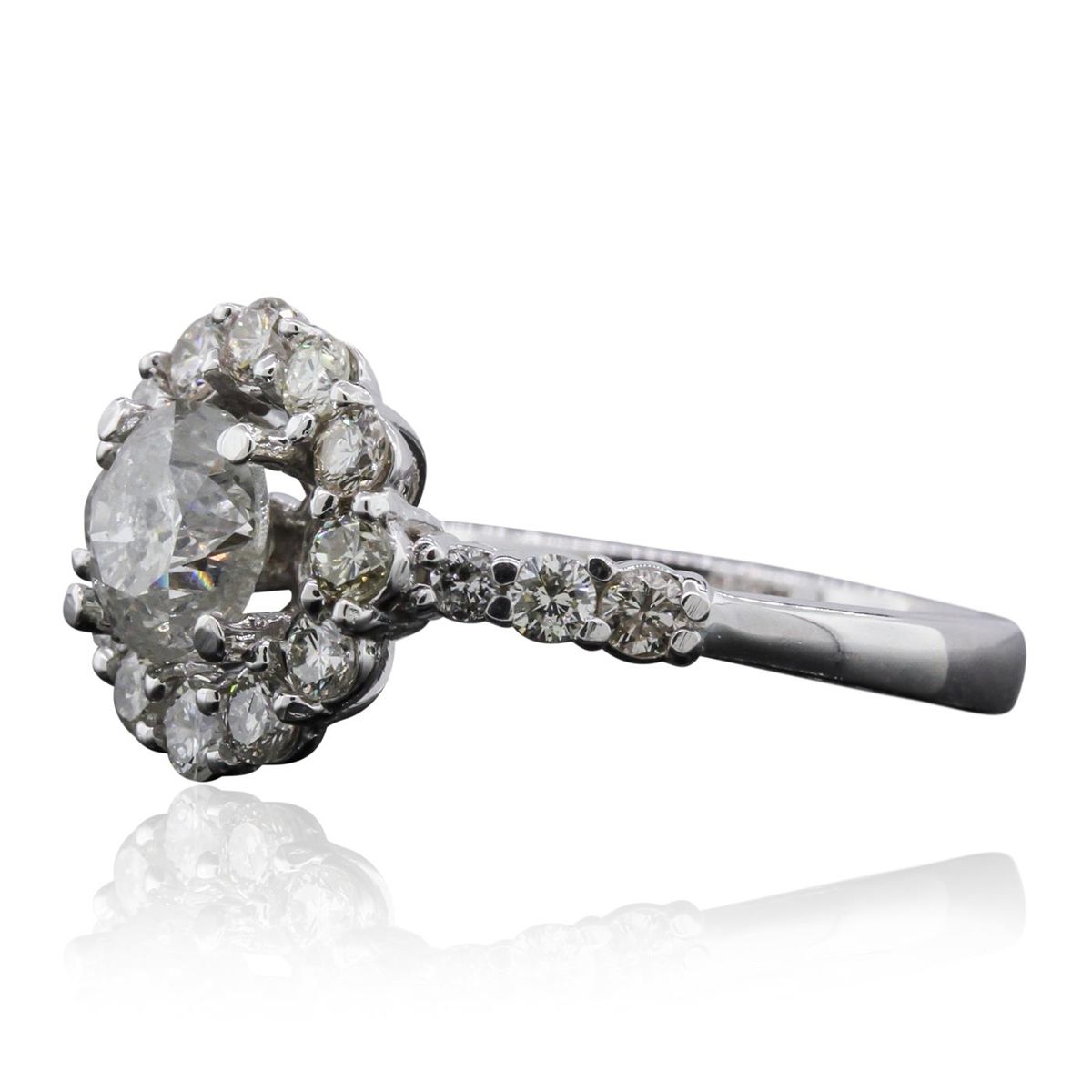 One electronically tested 14KT white gold ladies cast diamond unity ring with a bright polish finish. Condition is new, good workmanship. The featured diamond is set within a diamond bezel supported by diamond set shoulders, completed by a two and one-half millimeter wide band. Identified with markings of "585". Containing: One prong set round brilliant cut diamond, measuring 6.15 - 6.10 x 4.10mm (depth est.), 5.00.%. GTCF approximate weight of 1.10ct. Graded in the setting. Clarity: I-2. Color: JDepth 66.9%. Table 57.1%. Eighteen prong set round brilliant cut diamonds, measuring 2.50 - 1.80 x 1.29mm (depth est.) approximate. Total Weight of 18 Stones = 0.73ct. Graded in the setting. Clarity: I-1 to I-2. Color: I - K. Total Weight of Diamonds 1.83ct. Total Weight of Ring 3.96 grams. AIG Appraised at $10,635.00.