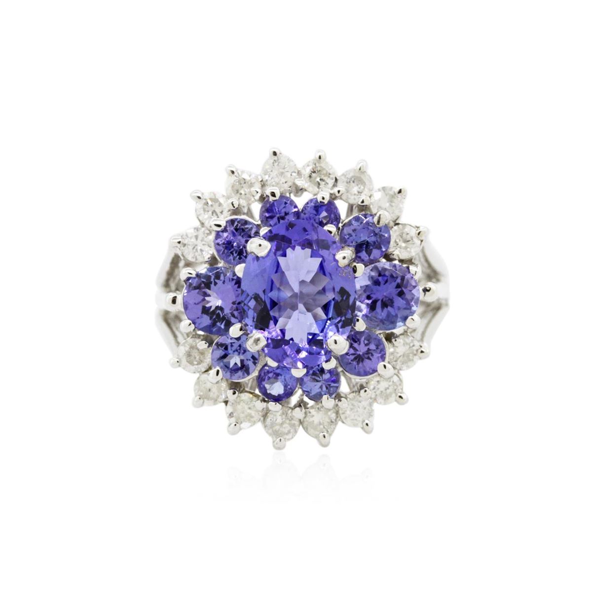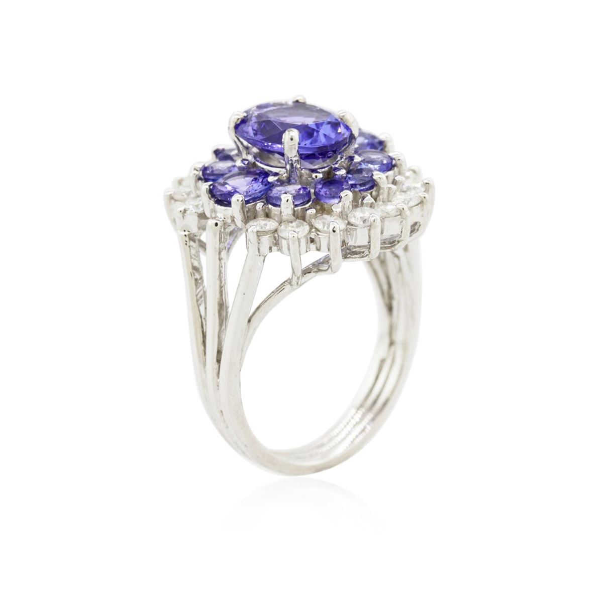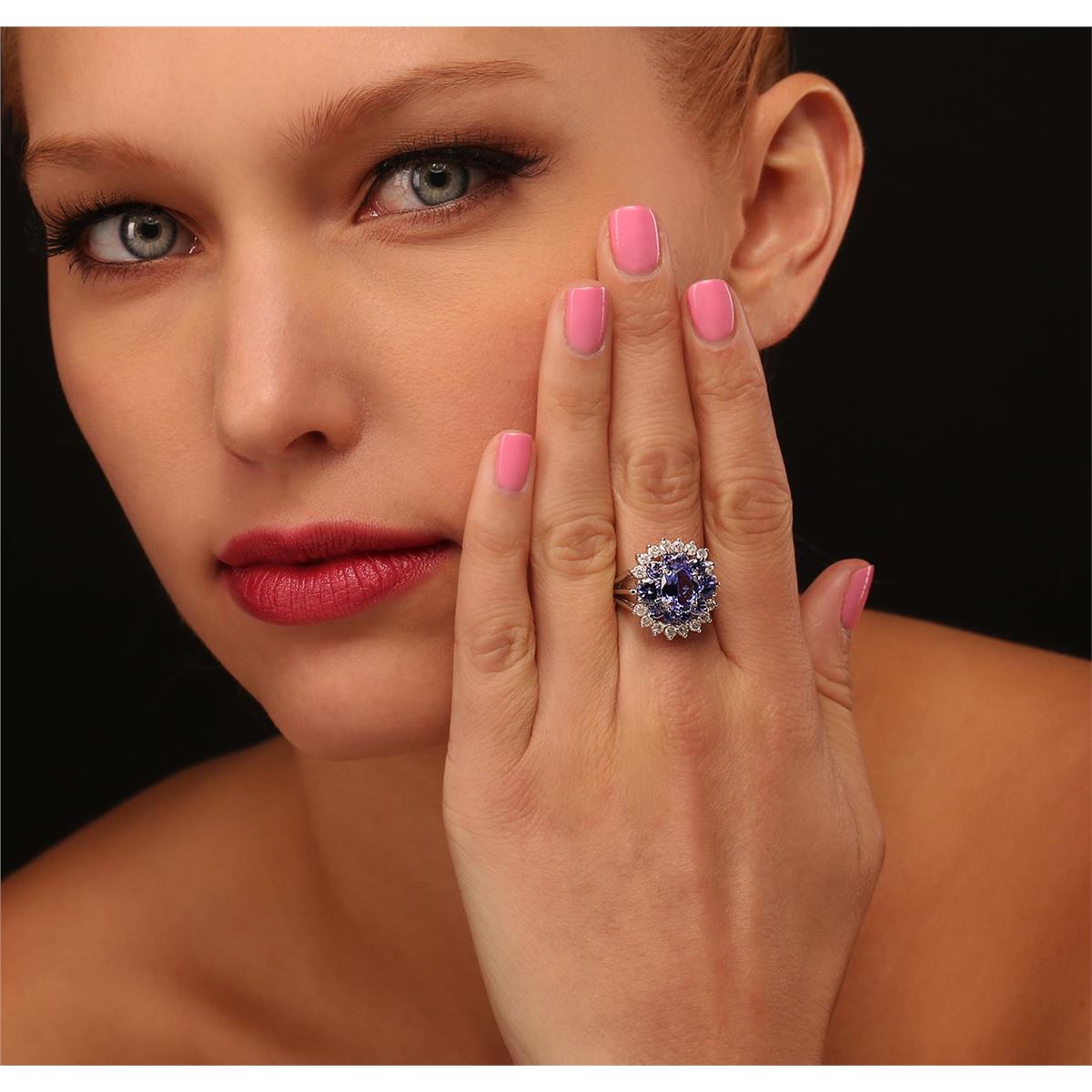 One electronically tested 14KT white gold Ladies combination cast & assembled ring with a bright polish finish. Condition is new. Identified with markings of "14K". Containing: One prong set oval modified brilliant cut natural tanzanite, measuring 9.30 x 7.30 x 3.98mm, approximate weight of 1.84ct., clarity is eye clean, type I, medium light, very slightly grayish, violet color, (GIA V 4/3), cut is good. Sixteen prong set round brilliant cut diamonds, measuring 2.30 - 2.30 x 1.38mm (depth est.) approximate. Total Weight of 16 Stones = 0.71ct. Clarity: I-1 to I-2. Color: I - J, Cut is Good. Ten prong set round modified brilliant cut natural tanzanites, measuring 4.30 - 3.00 x 2.37 mm, approximate. Total Weight of 2.90ct., clarity is eye clean, type I, medium, moderately strong, violet color, (GIA V 5/4), cut is very good. Colored gemstones are presumed to have been subjected to commonly used color/clarity enhancement processes. Total Weight of Colored Stones 4.74ct. Total Weight of Diamonds 0.71ct. Total Weight of Ring 7.70 grams. GGL Appraised at $10,715.00.