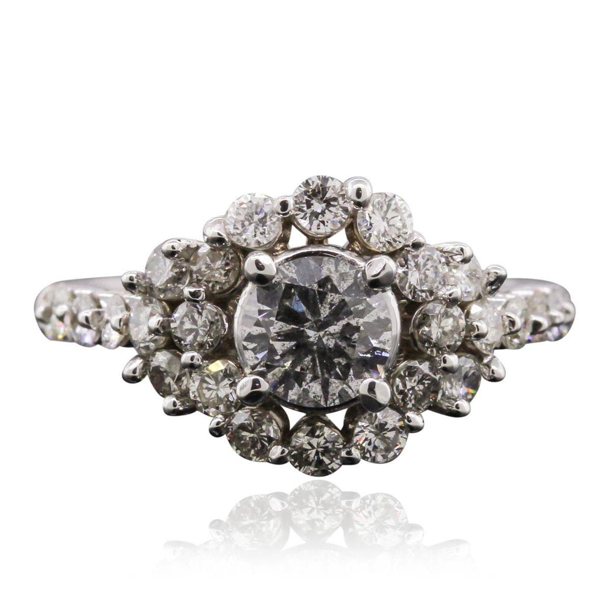 One electronically tested 14KT white gold ladies cast diamond ring with a bright polish finish. Condition is new, good workmanship. The featured diamond is set within a stylized diamond bezel supported by diamond set shoulders, completed by a two millimeter wide band. Identified with markings of "K14". Containing: One prong set round brilliant cut diamond, measuring 5.60 - 5.50 x 3.50mm (depth est.) approximate weight of 0.74ct. Faint secondary color throughout. Graded in the setting. Clarity: SI-3. Color: 63.1%. Table 64.0%. Twenty-Six prong set round brilliant cut diamonds, measuring 2.20 - 2.10 x 1.29mm (depth est.) approximate. Total Weight of 26 Stones = 1.10ct. Graded in the setting. Clarity: SI-1 to I-1. Color: H - J. Total Weight of Diamonds 1.84ct. Total Weight of Ring 4.62 grams. AIG Appraised at $8,980.00.