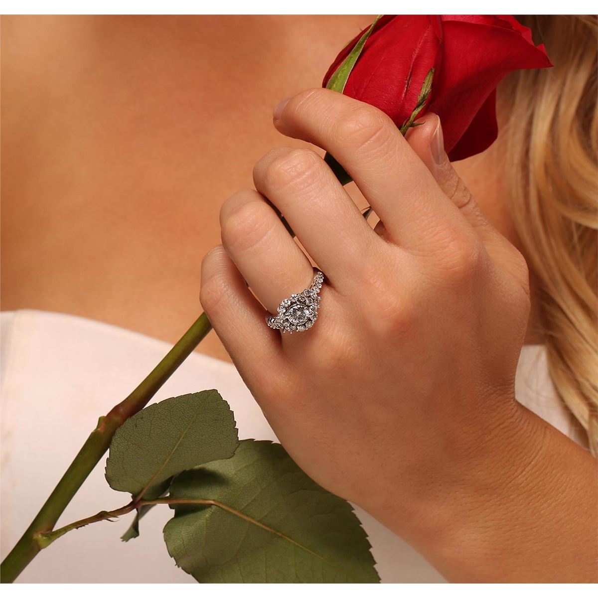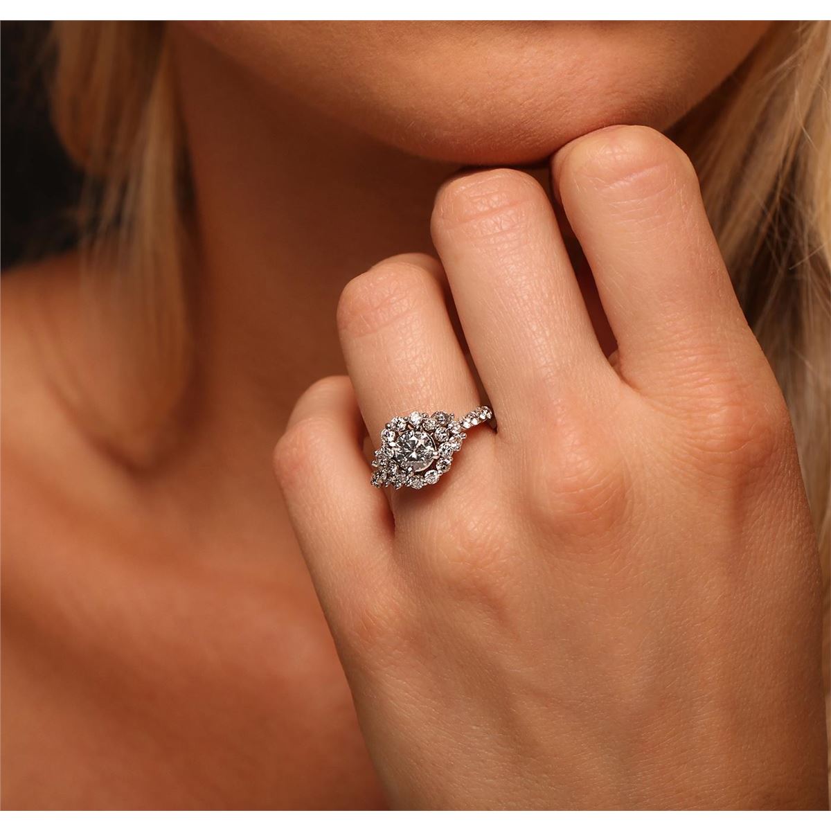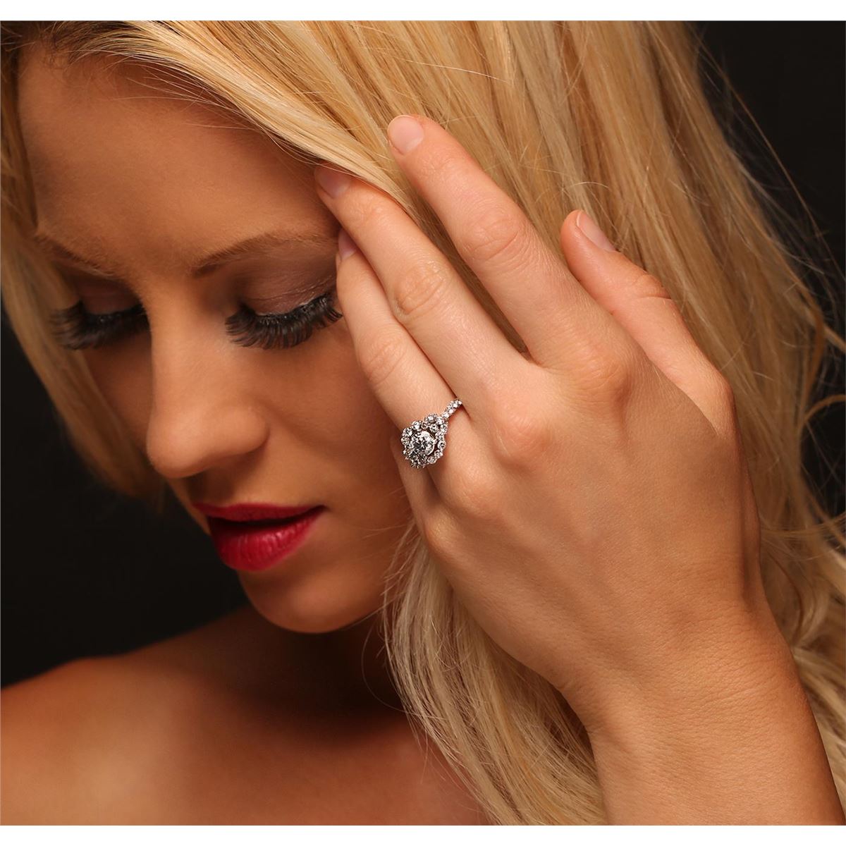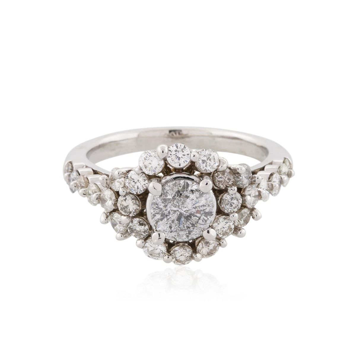 One electronically tested 14KT white gold ladies cast diamond ring with a bright polish finish. Condition is new, good workmanship. The featured diamond is set within a stylized diamond bezel supported by diamond set shoulders, completed by a two millimeter wide band. Identified with markings of "K14". Containing: One prong set round brilliant cut diamond, measuring 5.60 - 5.50 x 3.50mm (depth est.) approximate weight of 0.74ct. Faint secondary color throughout. Graded in the setting. Clarity: SI-3. Color: 63.1%. Table 64.0%. Twenty-Six prong set round brilliant cut diamonds, measuring 2.20 - 2.10 x 1.29mm (depth est.) approximate. Total Weight of 26 Stones = 1.10ct. Graded in the setting. Clarity: SI-1 to I-1. Color: H - J. Total Weight of Diamonds 1.84ct. Total Weight of Ring 4.62 grams. AIG Appraised at $8,980.00.