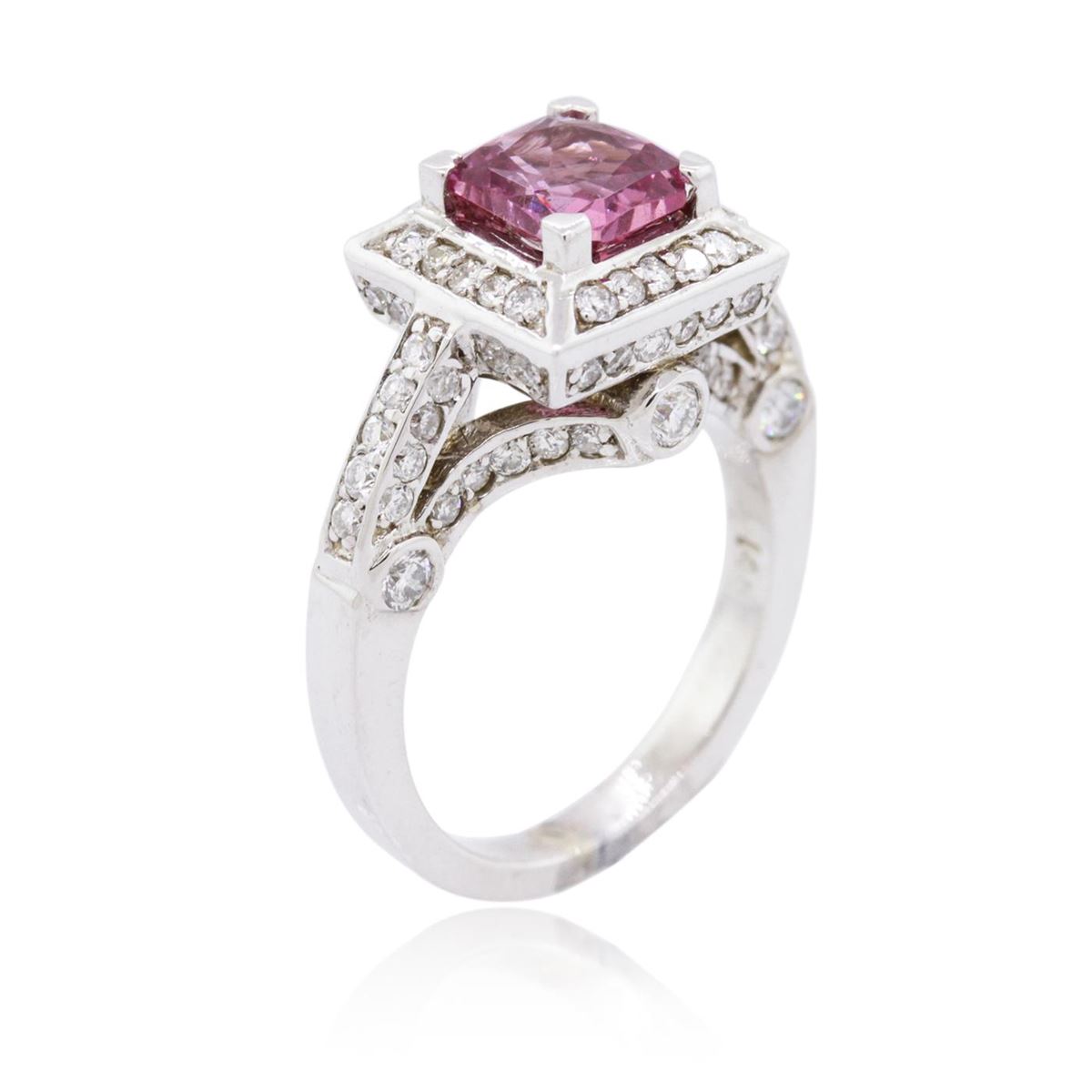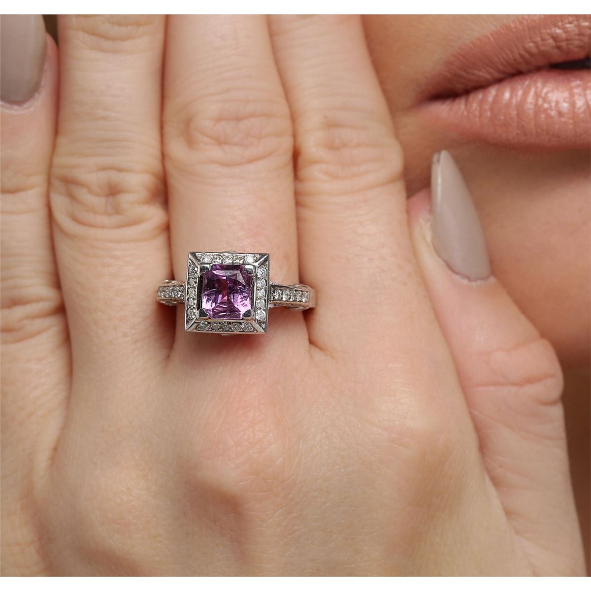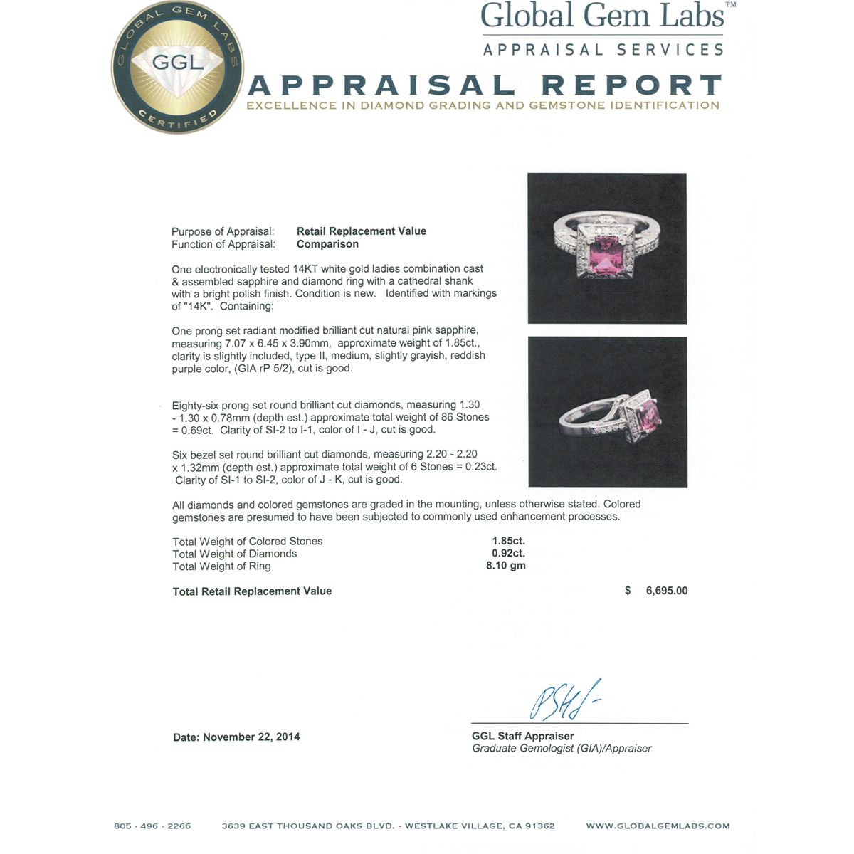 One electronically tested 14KT white gold ladies combination cast & assembled sapphire and diamond ring with a cathedral shank with a bright polish finish. Identified with markings of "14K". Condition is new. Containing: One prong set radiant modified brilliant cut natural pink sapphire, measuring 7.07 x 6.45 x 3.90mm, approximate weight of 1.85ct., clarity is slightly included, type II, medium, slightly grayish, reddish purple color, (GIA rP 5/2), cut is good. Eighty-Six prong set round brilliant cut diamonds, measuring 1.30 - 1.30 x 0.78mm (depth est.) approximate total weight of 86 Stones = 0.69ct. Clarity: SI-2 to I-1. Color: I - J, Cut is Good. Six bezel set round brilliant cut diamonds, measuring 2.20 - 2.20 x 1.32mm (depth est.) approximate total weight of 6 Stones = 0.23ct. Clarity: SI-1 to SI-2. Color: J - K, Cut is Good. All diamonds and colored gemstones are graded in the mounting, unless otherwise stated. Colored gemstones are presumed to have been subjected to commonly used enhancement processes. Total Weight of Colored Stones 1.85ct. Total Weight of Diamonds 0.92ct. Total Weight of Ring 8.10 grams. GGL Appraised at $6,695.00.
