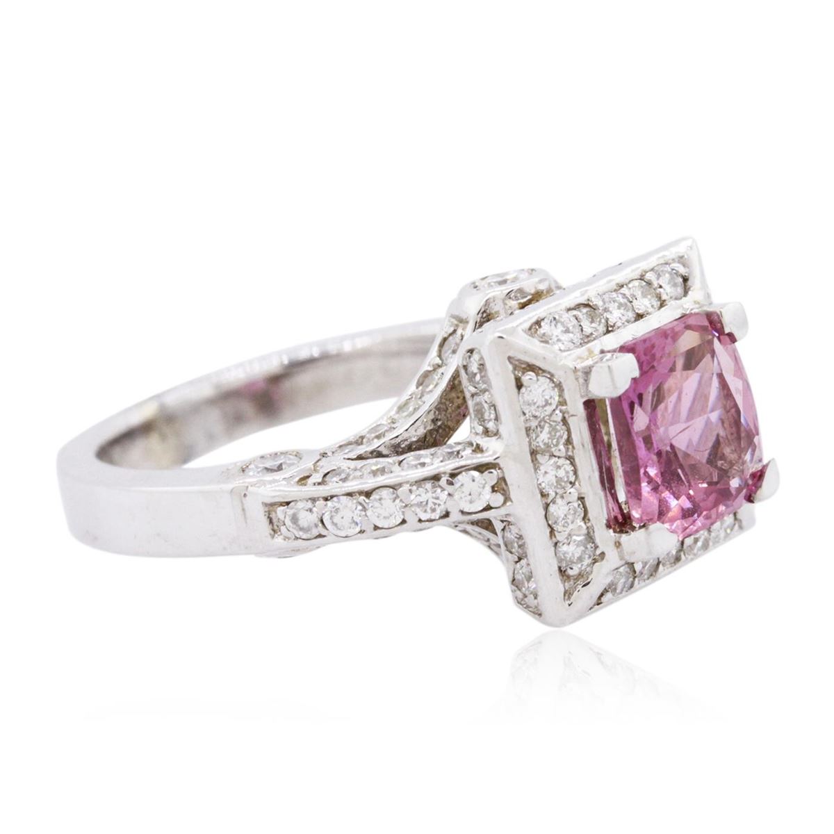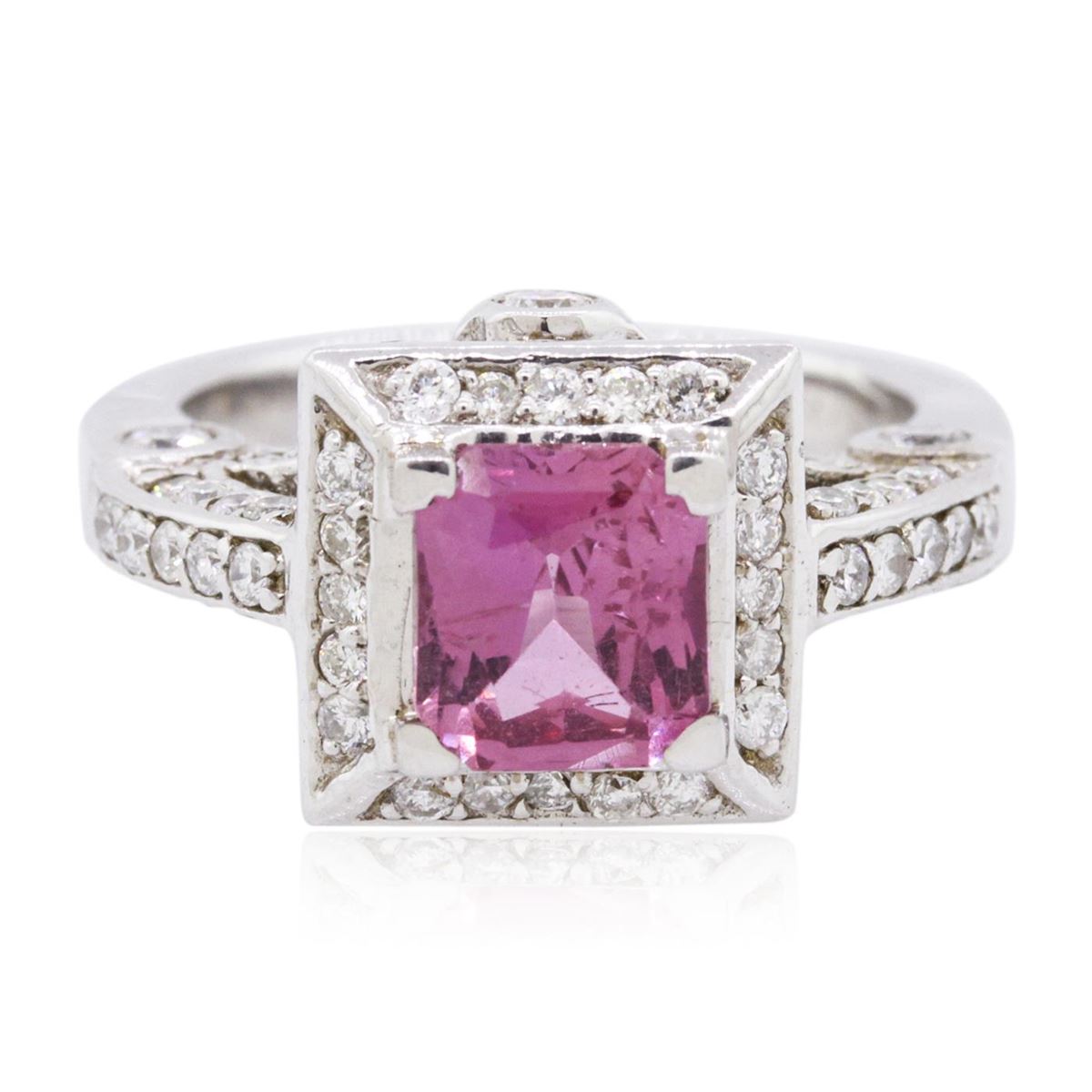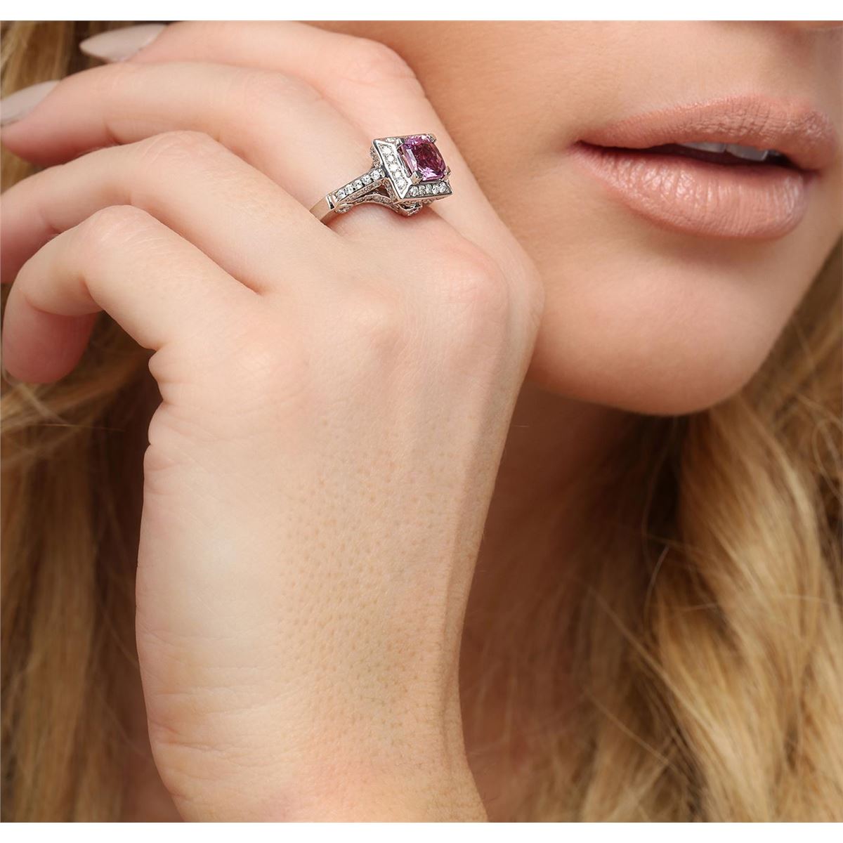 One electronically tested 14KT white gold ladies combination cast & assembled sapphire and diamond ring with a cathedral shank with a bright polish finish. Identified with markings of "14K". Condition is new. Containing: One prong set radiant modified brilliant cut natural pink sapphire, measuring 7.07 x 6.45 x 3.90mm, approximate weight of 1.85ct., clarity is slightly included, type II, medium, slightly grayish, reddish purple color, (GIA rP 5/2), cut is good. Eighty-Six prong set round brilliant cut diamonds, measuring 1.30 - 1.30 x 0.78mm (depth est.) approximate total weight of 86 Stones = 0.69ct. Clarity: SI-2 to I-1. Color: I - J, Cut is Good. Six bezel set round brilliant cut diamonds, measuring 2.20 - 2.20 x 1.32mm (depth est.) approximate total weight of 6 Stones = 0.23ct. Clarity: SI-1 to SI-2. Color: J - K, Cut is Good. All diamonds and colored gemstones are graded in the mounting, unless otherwise stated. Colored gemstones are presumed to have been subjected to commonly used enhancement processes. Total Weight of Colored Stones 1.85ct. Total Weight of Diamonds 0.92ct. Total Weight of Ring 8.10 grams. GGL Appraised at $6,695.00.