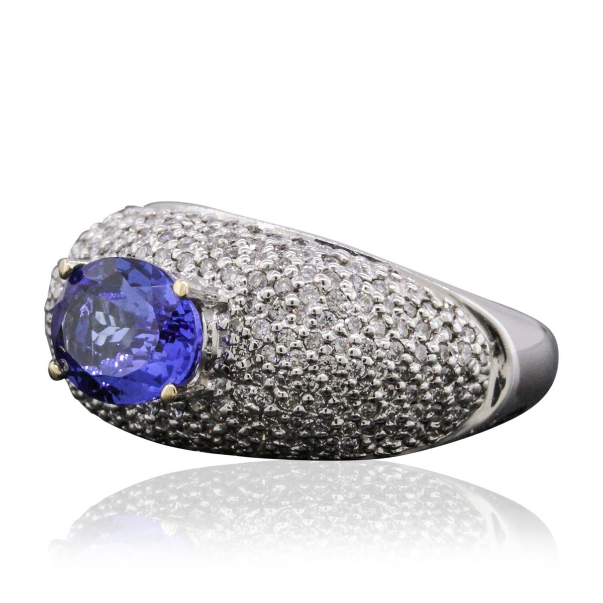 One electronically tested 14KT white gold ladies combination cast & assembled tanzanite and diamond ring with a flat shank with rounded edges with a bright polish finish. Identified with markings of "14K". Condition is new. Containing: One prong set oval modified brilliant cut natural tanzanite, measuring 8.83 x 6.87 x 4.47mm, approximate weight of 1.85ct., clarity is eye clean, type I, medium, moderately strong, bluish violet color, (GIA bV 5/4), cut is very good. One Hundred Eighty pave' set round brilliant cut diamonds, measuring 1.10 - 1.10 x 0.66mm (depth est.) approximate total weight of 180 Stones = 0.86ct. Clarity: SI-2 to I-1. Color: I - J, Cut is Good. Colored gemstones are presumed to have been subjected to commonly used enhancement processes. All diamonds and colored gemstones are graded in the mounting, unless otherwise stated. Total Weight of Colored Stones 1.85ct. Total Weight of Diamonds 0.86ct. Total Weight of Ring 11.20 grams. GGL Appraised at $9,925.00.