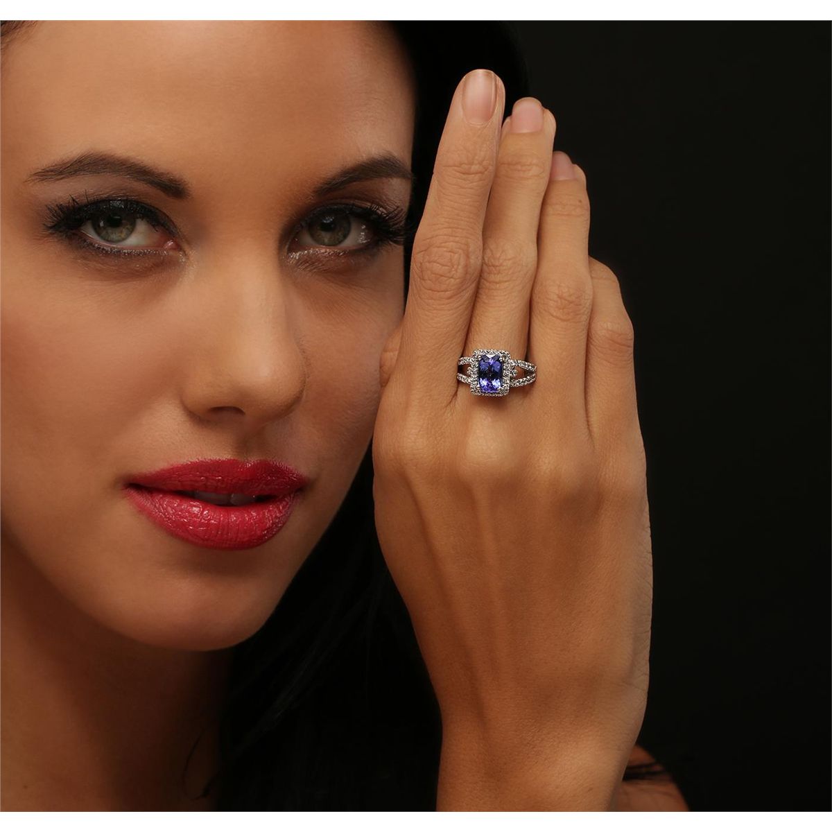 One electronically tested 14KT white gold Ladies combination cast & assembled ring with a bright polish finish. Condition is new. Identified with markings of "14K". Containing: One prong set rectangular cushion modified brilliant cut natural tanzanite, measuring 9.19 x 5.93 x 4.32mm, approximate. Total Weight of 1.85ct., clarity is eye clean, type I, medium light, moderately strong, bluish violet color, (GIA bV 4/4), cut is good. Fifty-Eight prong set round brilliant cut diamonds, measuring 1.20 - 1.20 x 0.72mm (depth est.) approximate. Total Weight of 58 Stones = 0.37ct. Clarity: I-1 to I-2. Color: I - J, Cut is Good. Colored gemstones are presumed to have been subjected to commonly used enhancement processes. All diamonds and colored gemstones are graded in the mounting, unless otherwise stated. Total Weight of Colored Stones 1.85ct. Total Weight of Diamonds 0.37ct. Total Weight of Ring 6.10 grams. GGL Appraised at $5,260.00.