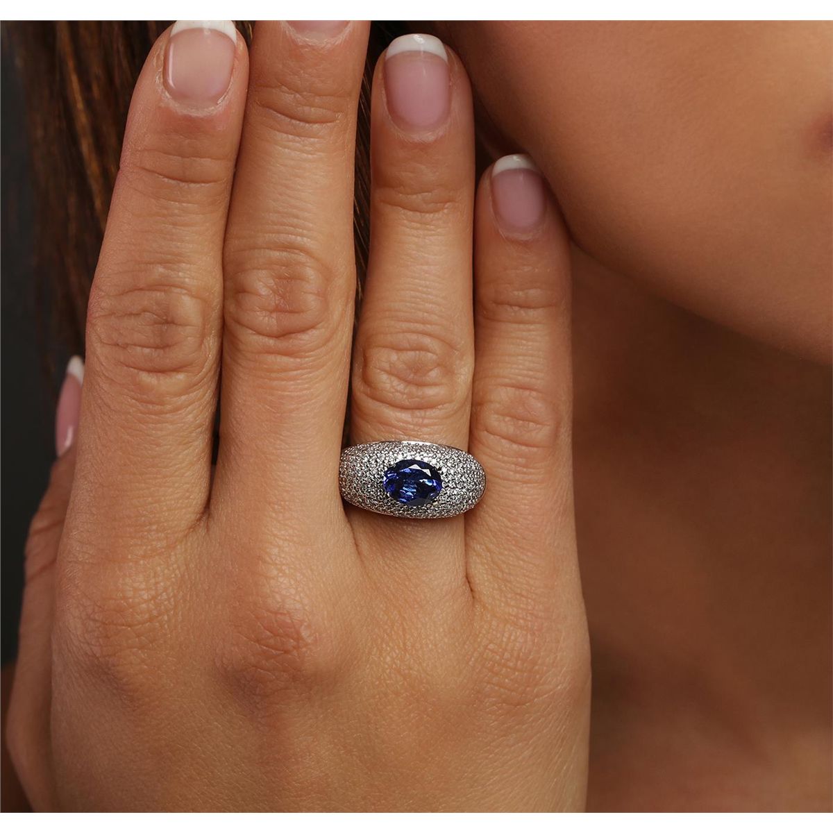 One electronically tested 14KT white gold ladies combination cast & assembled tanzanite and diamond ring with a flat shank with rounded edges with a bright polish finish. Identified with markings of "14K". Condition is new. Containing: One prong set oval modified brilliant cut natural tanzanite, measuring 8.83 x 6.87 x 4.47mm, approximate weight of 1.85ct., clarity is eye clean, type I, medium, moderately strong, bluish violet color, (GIA bV 5/4), cut is very good. One Hundred Eighty pave' set round brilliant cut diamonds, measuring 1.10 - 1.10 x 0.66mm (depth est.) approximate total weight of 180 Stones = 0.86ct. Clarity: SI-2 to I-1. Color: I - J, Cut is Good. Colored gemstones are presumed to have been subjected to commonly used enhancement processes. All diamonds and colored gemstones are graded in the mounting, unless otherwise stated. Total Weight of Colored Stones 1.85ct. Total Weight of Diamonds 0.86ct. Total Weight of Ring 11.20 grams. GGL Appraised at $9,925.00.
