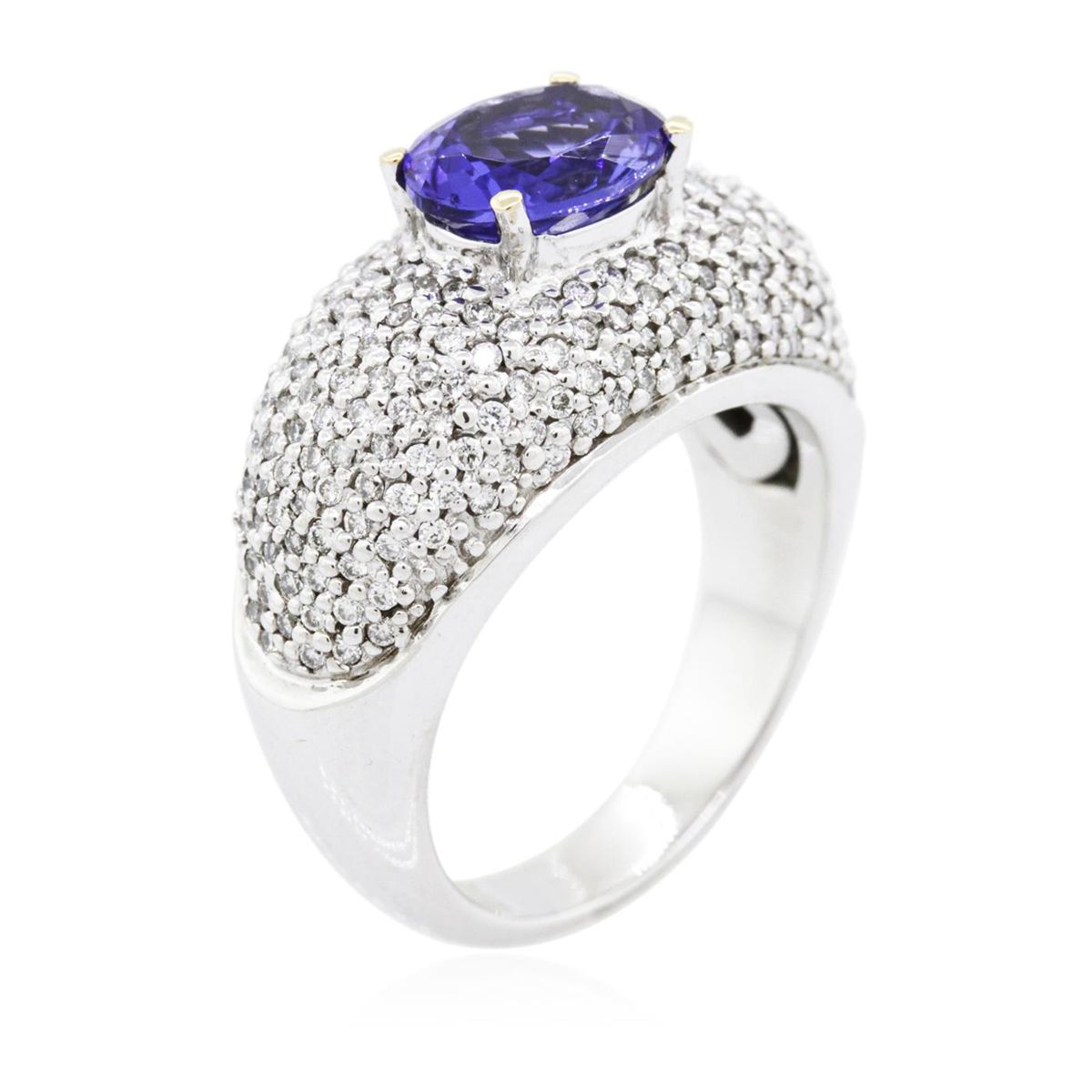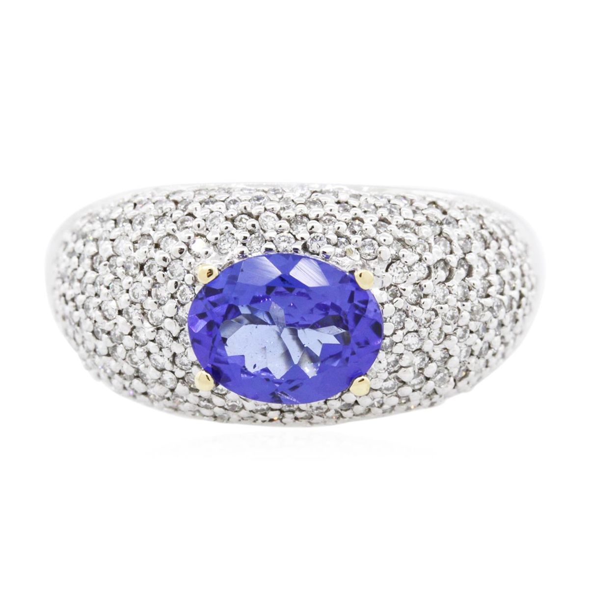 One electronically tested 14KT white gold ladies combination cast & assembled tanzanite and diamond ring with a flat shank with rounded edges with a bright polish finish. Identified with markings of "14K". Condition is new. Containing: One prong set oval modified brilliant cut natural tanzanite, measuring 8.83 x 6.87 x 4.47mm, approximate weight of 1.85ct., clarity is eye clean, type I, medium, moderately strong, bluish violet color, (GIA bV 5/4), cut is very good. One Hundred Eighty pave' set round brilliant cut diamonds, measuring 1.10 - 1.10 x 0.66mm (depth est.) approximate total weight of 180 Stones = 0.86ct. Clarity: SI-2 to I-1. Color: I - J, Cut is Good. Colored gemstones are presumed to have been subjected to commonly used enhancement processes. All diamonds and colored gemstones are graded in the mounting, unless otherwise stated. Total Weight of Colored Stones 1.85ct. Total Weight of Diamonds 0.86ct. Total Weight of Ring 11.20 grams. GGL Appraised at $9,925.00.