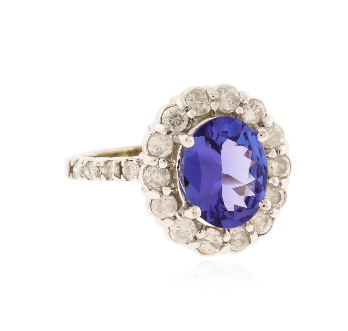 One electronically tested 14KT white gold ladies cast tanzanite and diamond ring with a bright polish finish. The featured tanzanite is set within a diamond bezel, supported by diamond set shoulders and completed by a one and one-half millimeter wide band. Identified with markings of "K14". Condition is new, good workmanship. Containing: One prong set oval mixed cut natural tanzanite, measuring 9.55 x 7.55 x 3.80mm, approximate weight of 1.86ct., clarity is eye clean, type I, medium, very slightly grayish, bluish violet color, (GIA bV 5/3), cut is good. Transmitting light with no distortion, transparent. Graded in the setting.Tanzanite is a very rare gemstone that is only found in the country of Tanzania. Originally discovered in 1967. Tiffany & Company, named the stone Tanzanite. It is found in the Usumburu Mountains that border the Umba Valley of northern Tanzania. Tanzanite occurs in gray, brown, violet, blue, reddish-purple, & green. The gem is interesting because of its exceptional pleochroism. Rotated in different directions a tanzanite will exhibit multiple changes of color. Tanzanite has a low tolerance to ultrasonic cleaning, and should not be cleaned using this method. Twenty-Two prong set round brilliant cut diamonds, measuring 2.40 - 1.70 x 1.23mm (depth est.) approximate total weight of 22 Stones = 0.84ct. Graded in the setting. Clarity: I-1 to I-3. Color: G - I. Total Weight of Colored Stones 1.86ct. Total Weight of Diamonds 0.84ct. Total Weight of Ring 4.50 grams. AIG Appraised at $5,700.00.