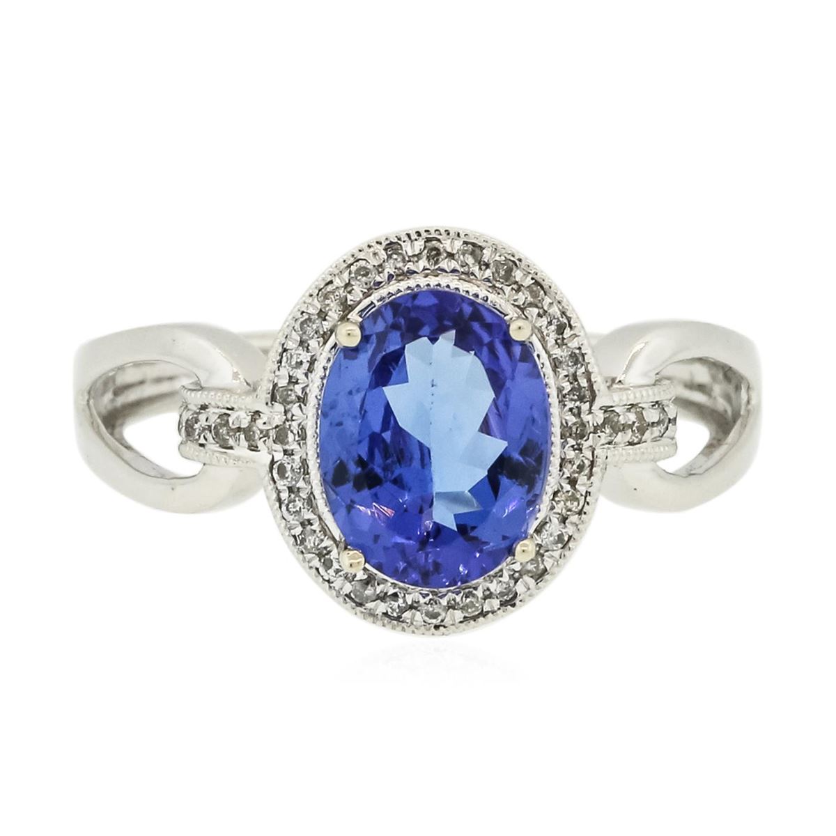 One electronically tested 14KT white gold ladies combination cast & assembled tanzanite and diamond ring with a split shank with a bright polish finish. Identified with markings of "14K". Condition is new. Containing: One prong set oval modified brilliant cut natural tanzanite, measuring 8.85 x 6.91 x 4.46mm, approximate weight of 1.86ct., clarity is eye clean, type I, medium, moderately strong, bluish violet color, (GIA bV 5/4), cut is good. Thirty-Six prong set round brilliant cut diamonds, measuring 1.20 - 1.20 x 0.72mm (depth est.) approximate total weight of 36 Stones = 0.23ct. Clarity: I-1 to I-2. Color: J - K, Cut is Good. Colored gemstones are presumed to have been subjected to commonly used enhancement processes. All diamonds and colored gemstones are graded in the mounting, unless otherwise stated. Total Weight of Colored Stones 1.86ct. Total Weight of Diamonds 0.23ct. Total Weight of Ring 3.60 grams. GGL Appraised at $4,645.00.