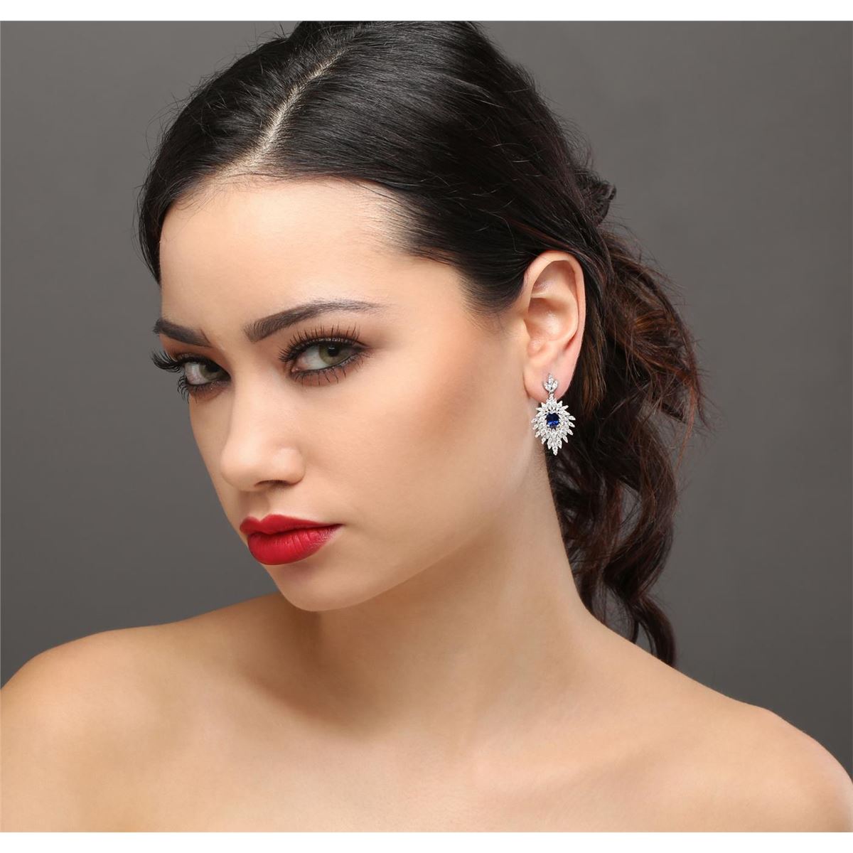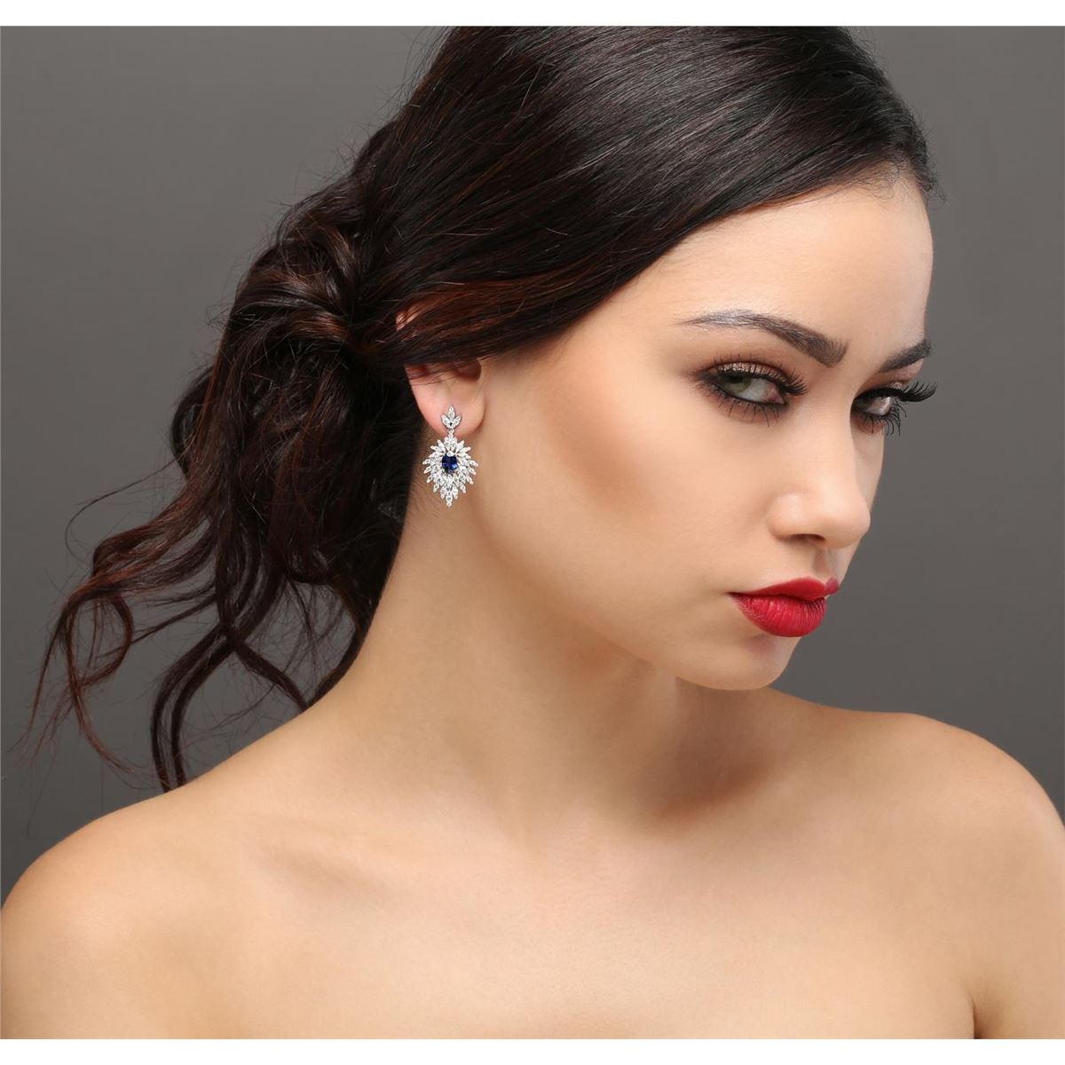One pair electronically tested 14KT white gold ladies combination cast & assembled sapphire and diamond earrings with friction posts with a bright polish finish. Identified with markings of "585". Condition is new. Containing: Two prong set oval modified brilliant cut natural blue sapphires, measuring 6.94 x 5.05 x 3.17mm, approximate total weight of 1.86ct., clarity is eye clean, type II, medium light, moderately strong, blue color, (GIA B 4/4), cut is good. Thirty-Two prong set round brilliant cut diamonds, measuring 2.00 - 2.00 x 1.20mm (depth est.) approximate total weight of 32 Stones = 0.93ct. Clarity: I-1. Color: I - J, Cut is Good. Sixty-Four prong set round brilliant cut diamonds, measuring 1.50 - 1.50 x 0.90mm (depth est.) approximate total weight of 64 Stones = 0.79ct. Clarity: SI-2 to I-1. Color: I - J, Cut is Good. All diamonds are graded in the mounting, unless otherwise stated. Total Weight of Colored Stones 1.86ct. Total Weight of Diamonds 1.72ct. Total Weight of Earrings 9.50 grams. GGL Appraised at $6,870.00.