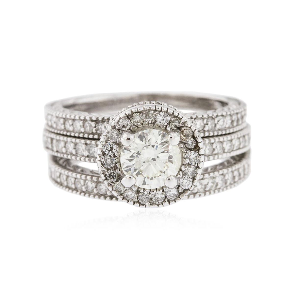 One electronically tested 14KT White Gold ladies cast and assembled diamond wedding set. Condition is new, good workmanship. The wedding set includes a diamond engagement ring and two matching diamond wedding bands. The engagement ring features a diamond set within a diamond bezel and supported by a diamond set under gallery and shoulders. The set is completed by two matching diamond wedding bands. Each ring is completed by a two millimeter wide patterned band. Bright polish finish with milgrain detailing throughout. Identified with markings of "14K". Containing: One prong set round brilliant cut diamond, measuring 5.75 -5.74 x 3.50mm (depth est) approximate weight of 0.80ct with a medium blue fluorescence. Graded in the setting. Clarity I-1 Color K Depth 60.9% Table 59.1%. Ninety-seven bead and prong set round brilliant cut diamonds, measuring 1.50 - 1.30 x 0.84mm (depth est) approximate total weight of 97 stones = 1.07ct. The color grade reflects the entire range of color for this group. Graded in the setting. Clarity SI-1 to I-1. Color G-J. Total weight of diamonds 1.87ct. Total weight of wedding set 8.81 grams. AIG Appraised at $10,355.00.