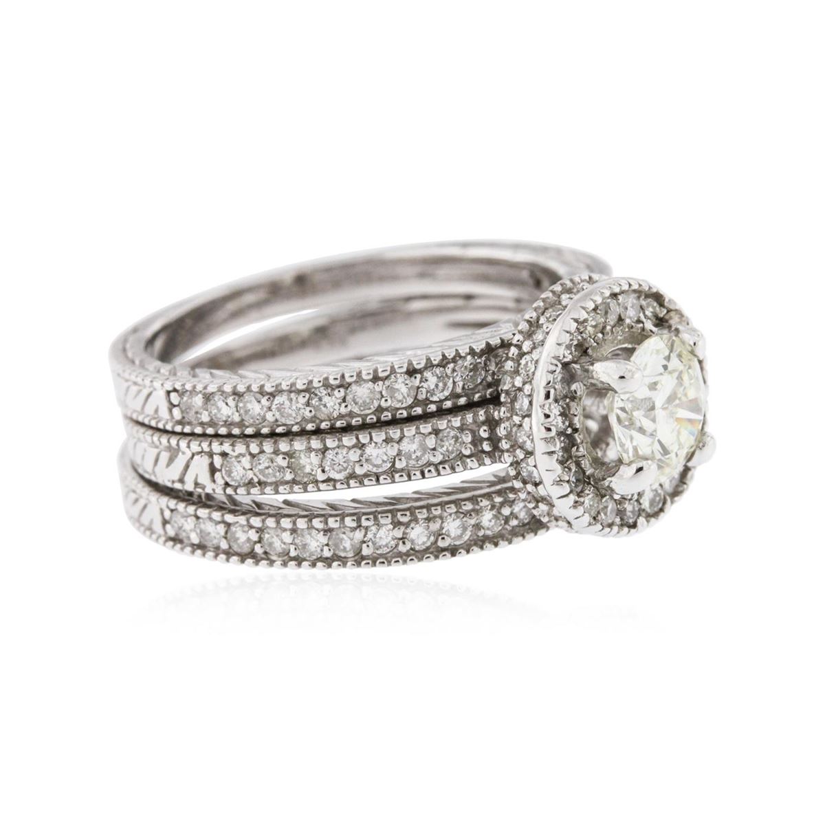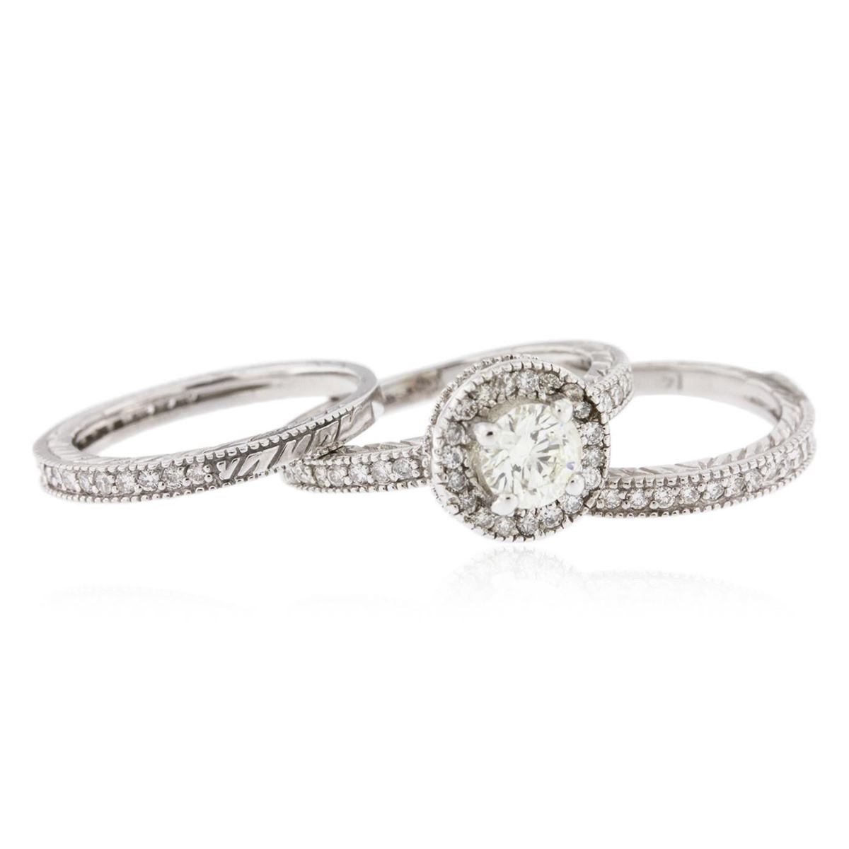 One electronically tested 14KT White Gold ladies cast and assembled diamond wedding set. Condition is new, good workmanship. The wedding set includes a diamond engagement ring and two matching diamond wedding bands. The engagement ring features a diamond set within a diamond bezel and supported by a diamond set under gallery and shoulders. The set is completed by two matching diamond wedding bands. Each ring is completed by a two millimeter wide patterned band. Bright polish finish with milgrain detailing throughout. Identified with markings of "14K". Containing: One prong set round brilliant cut diamond, measuring 5.75 -5.74 x 3.50mm (depth est) approximate weight of 0.80ct with a medium blue fluorescence. Graded in the setting. Clarity I-1 Color K Depth 60.9% Table 59.1%. Ninety-seven bead and prong set round brilliant cut diamonds, measuring 1.50 - 1.30 x 0.84mm (depth est) approximate total weight of 97 stones = 1.07ct. The color grade reflects the entire range of color for this group. Graded in the setting. Clarity SI-1 to I-1. Color G-J. Total weight of diamonds 1.87ct. Total weight of wedding set 8.81 grams. AIG Appraised at $10,355.00.