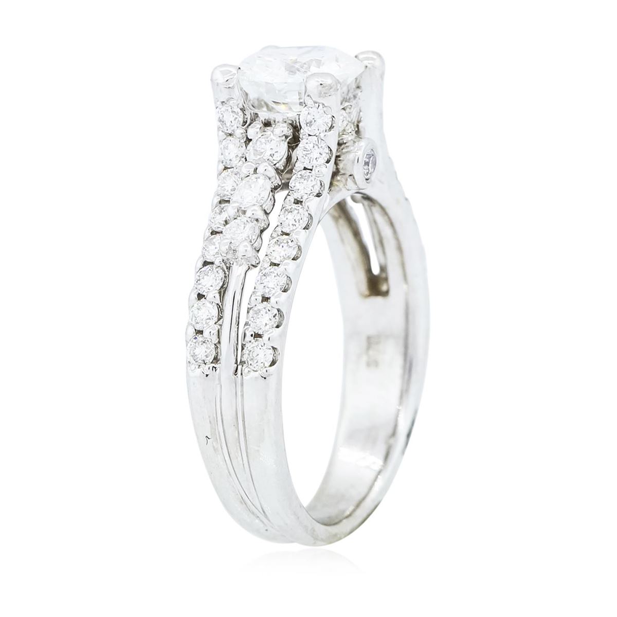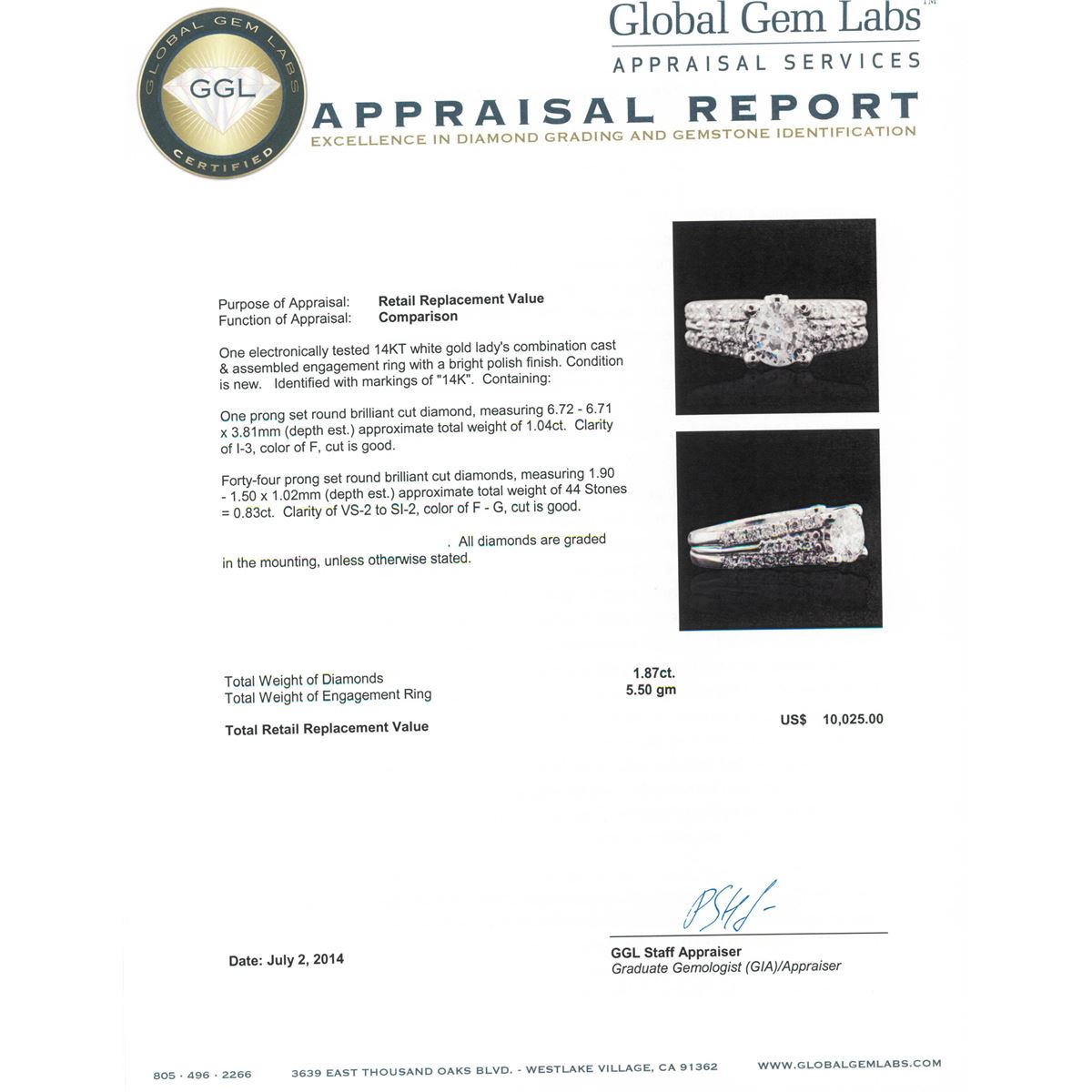 One electronically tested 14KT white gold Ladies combination cast & assembled engagement ring with a bright polish finish. Condition is new. Identified with markings of "14K". Containing: One prong set round brilliant cut diamond, measuring 6.72 - 6.71 x 3.81mm (depth est.) approximate. Total Weight of 1.04ct. Clarity: I-3. Color: F, Cut is Good. Forty-Four prong set round brilliant cut diamonds, measuring 1.90 - 1.50 x 1.02mm (depth est.) approximate. Total Weight of 44 Stones = 0.83ct. Clarity: VS-2 to SI-2. Color: F - G, Cut is Good. EGL USA GEM ID# US 911348427D. All diamonds are graded in the mounting, unless otherwise stated. Total Weight of Diamonds 1.87ct. Total Weight of Engagement Ring 5.50 grams. GGL Appraised at $10,025.00.