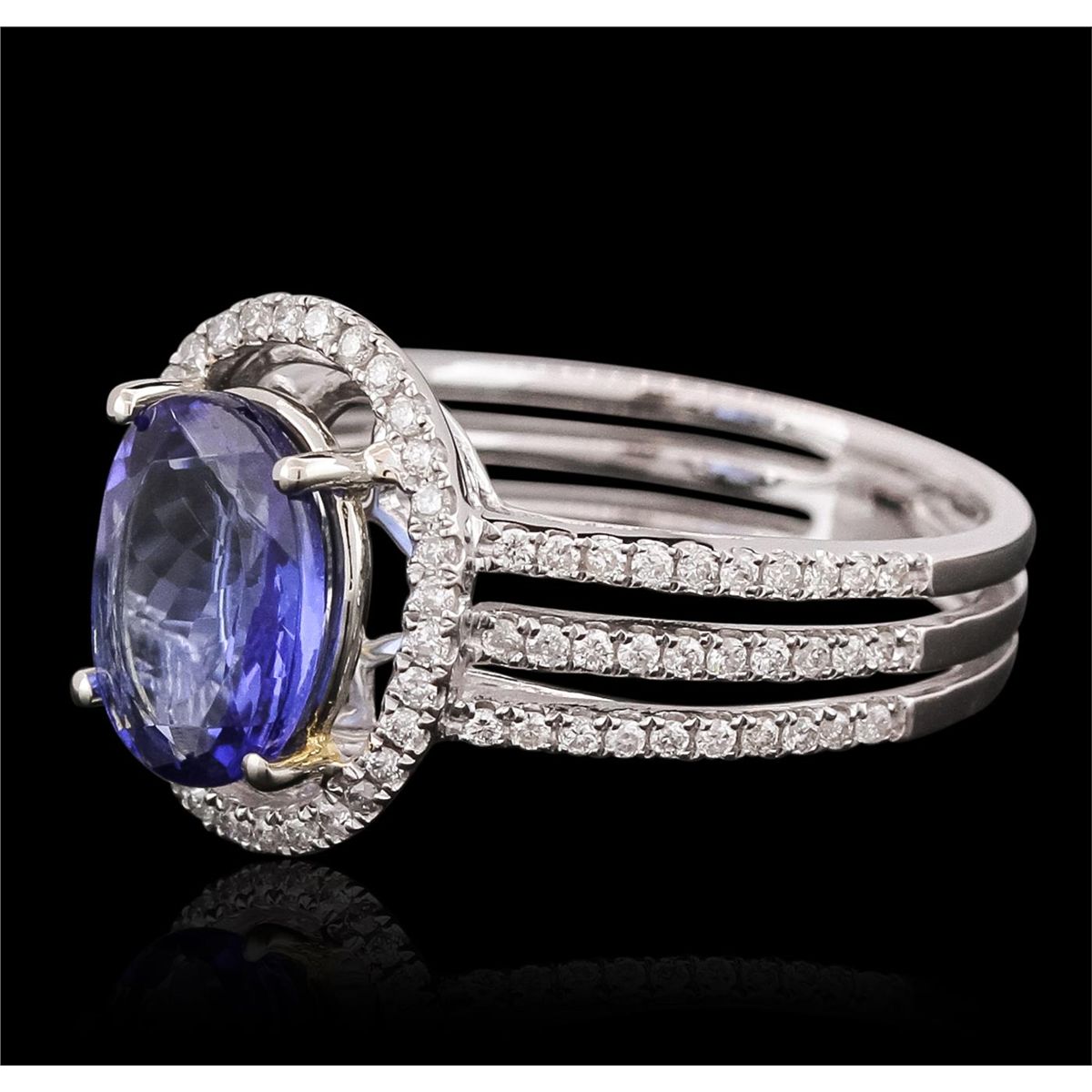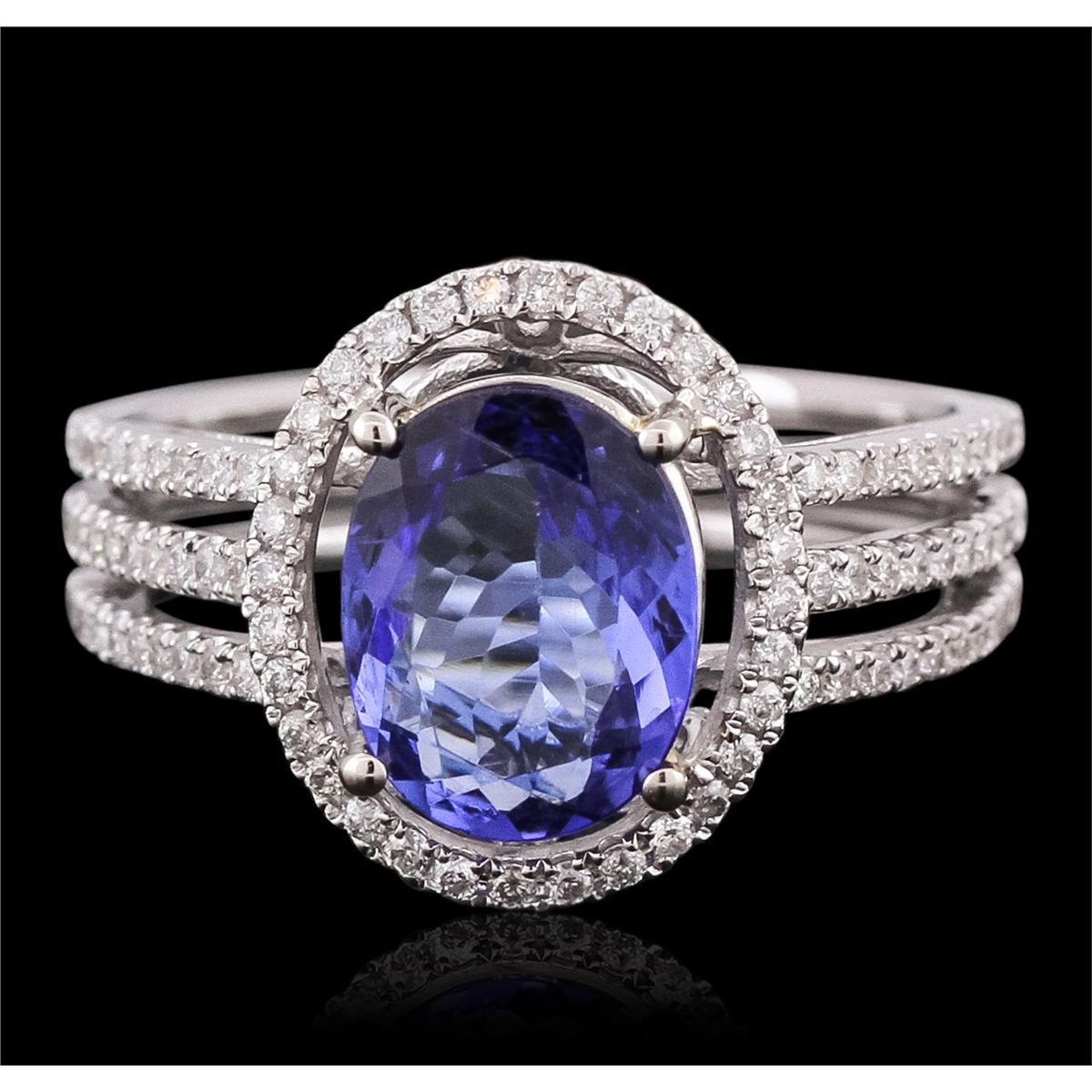 One electronically tested 14KT white gold ladies combination cast & assembled ring with a bright polish finish. Identified with markings of "14K". Condition is new. Containing: One prong set oval modified brilliant cut natural tanzanite, measuring 9.65 x 7.46 x 3.81mm, approximate weight of 1.87ct., clarity is eye clean, type I, medium light, very slightly grayish, violet color, (GIA V 4/3), cut is good. Ninety-One prong set round brilliant cut diamonds, measuring 1.10 - 1.10 x 0.66mm (depth est.) approximate total weight of 91 Stones = 0.44ct. Clarity: I-1 to I-2. Color: I - J, Cut is Good. Colored gemstones are presumed to have been subjected to commonly used enhancement processes. All diamonds and colored gemstones are graded in the mounting, unless otherwise stated. Total Weight of Colored Stones 1.87ct. Total Weight of Diamonds 0.44ct. Total Weight of Ring 4.70 grams. GGL Appraised at $5,520.00.