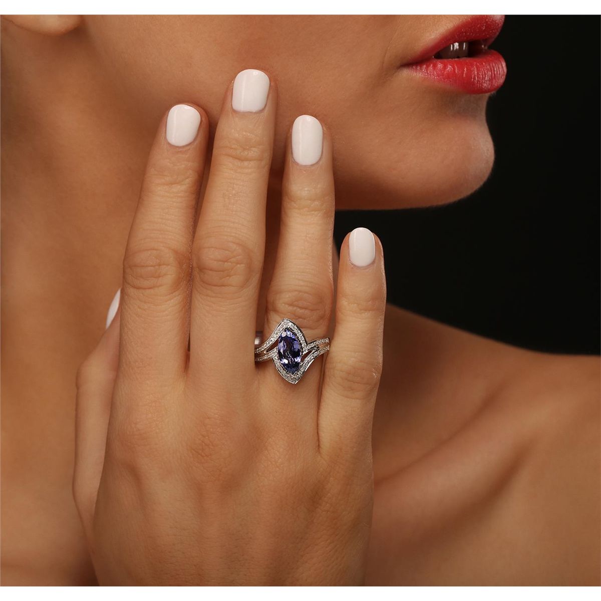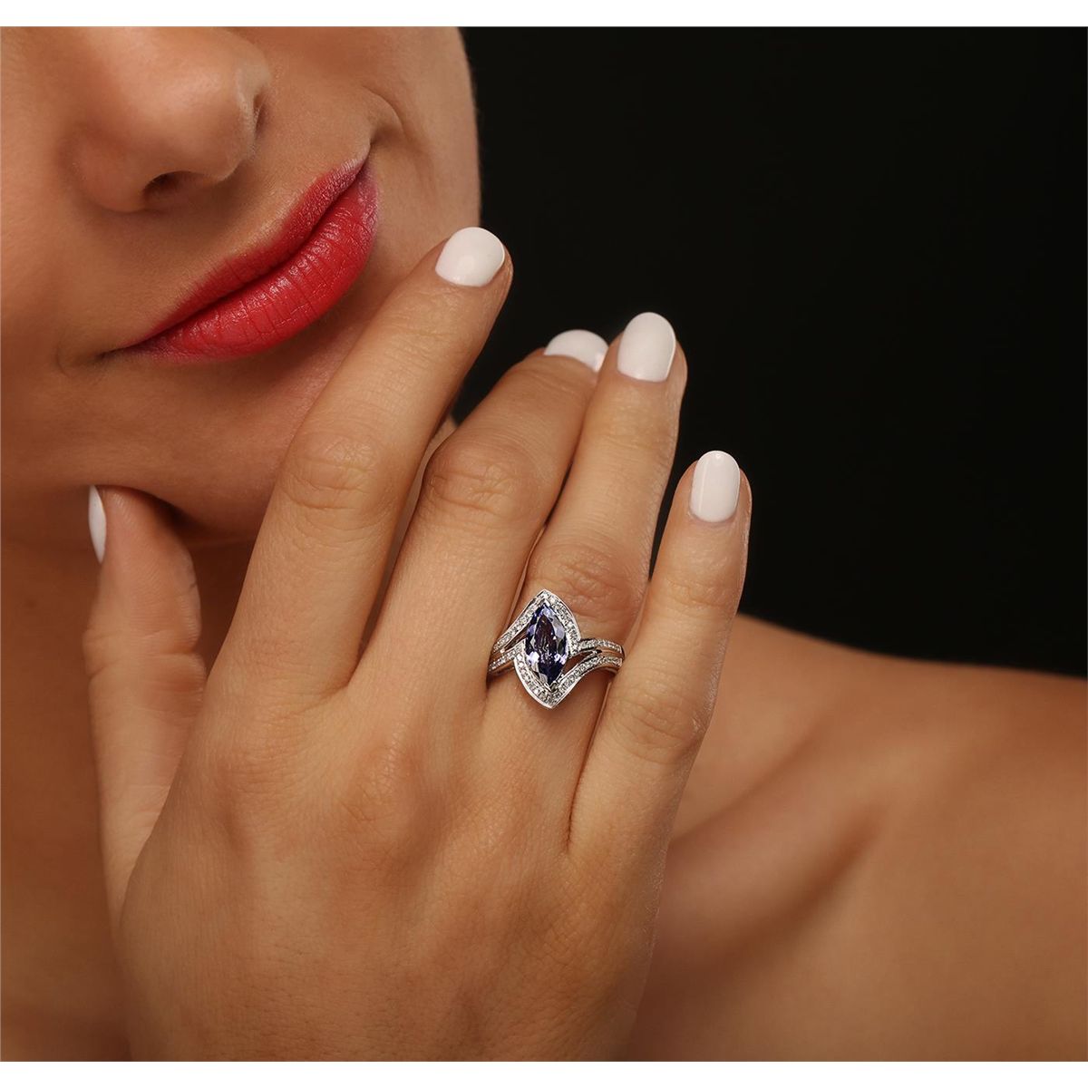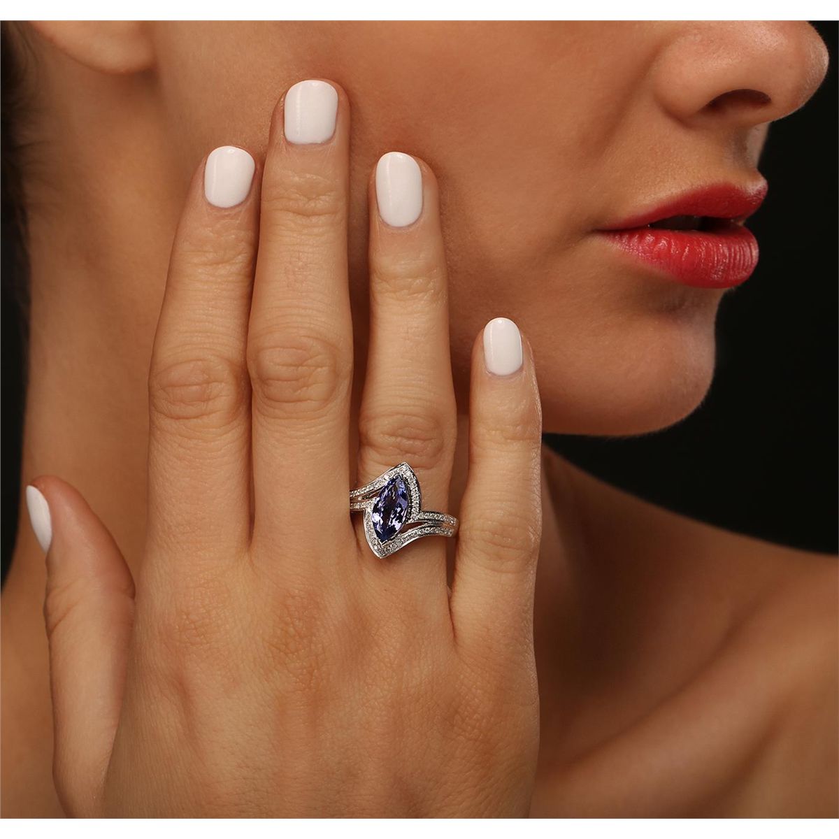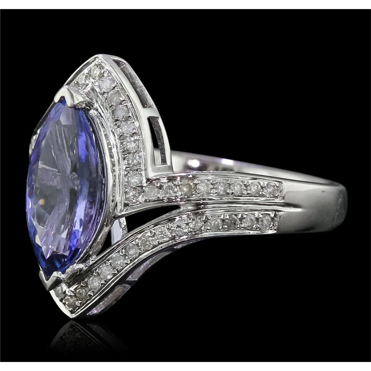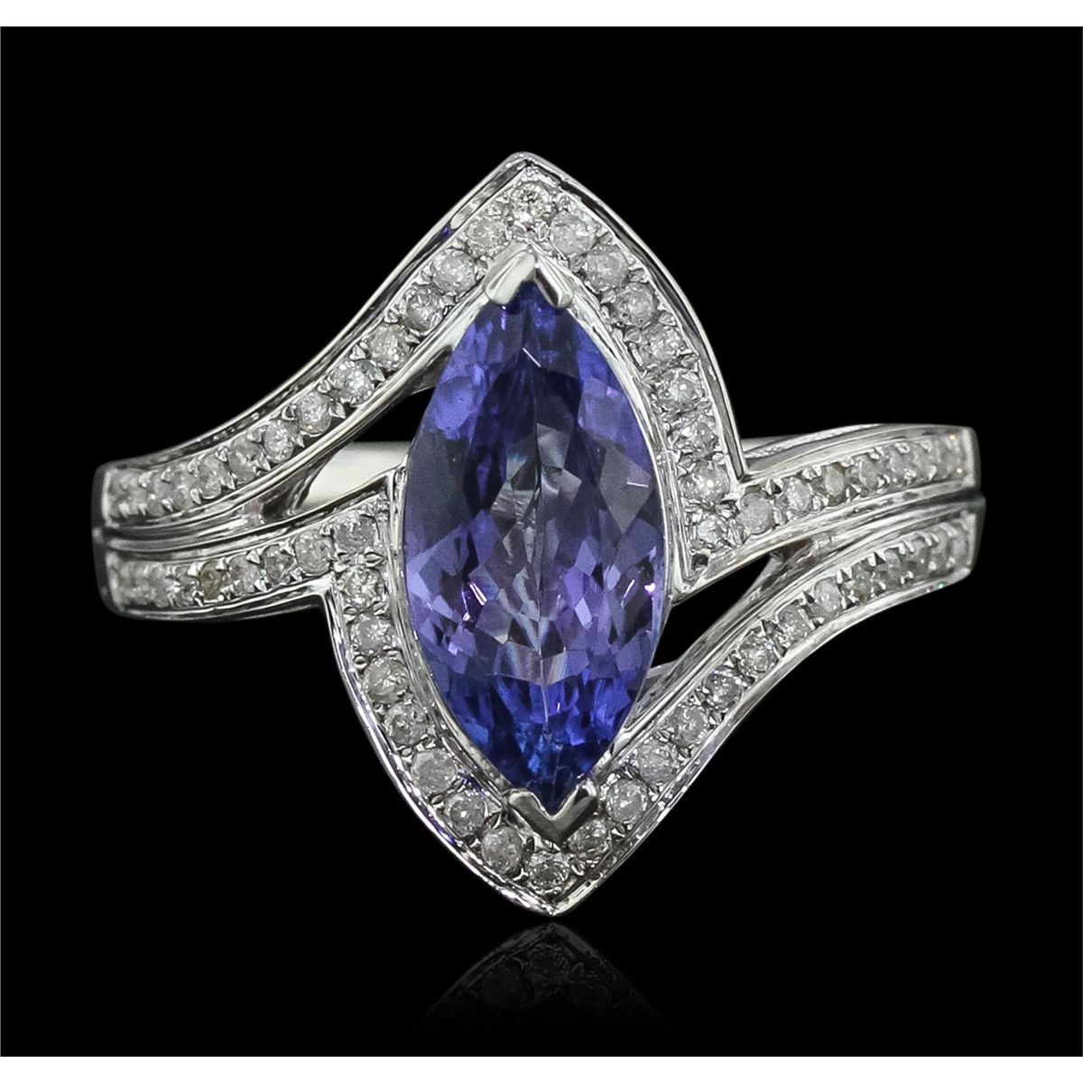 One electronically tested 14KT white gold Ladies combination cast & assembled ring with a bright polish finish. Condition is new. Identified with markings of "14K". Containing: One prong set marquise modified brilliant cut natural tanzanite, measuring 12.40 x 5.90 x 4.01mm, approximate weight of 1.87ct., clarity is eye clean, type I, medium, moderately strong, violet color, (GIA V 5/4), cut is good. Colored gemstones are presumed to have been subjected to commonly used color/clarity enhancement processes. Sixty prong set round brilliant cut diamonds, measuring 1.00 - 1.00 x 0.60mm (depth est.) approximate. Total Weight of 60 Stones = 0.28ct. Clarity: I-1 to I-2. Color: H - I, Cut is Good. Total Weight of Colored Stones 1.87ct. Total Weight of Diamonds 0.28ct. Total Weight of Ring 4.50 grams. GGL Appraised at $4,710.00.