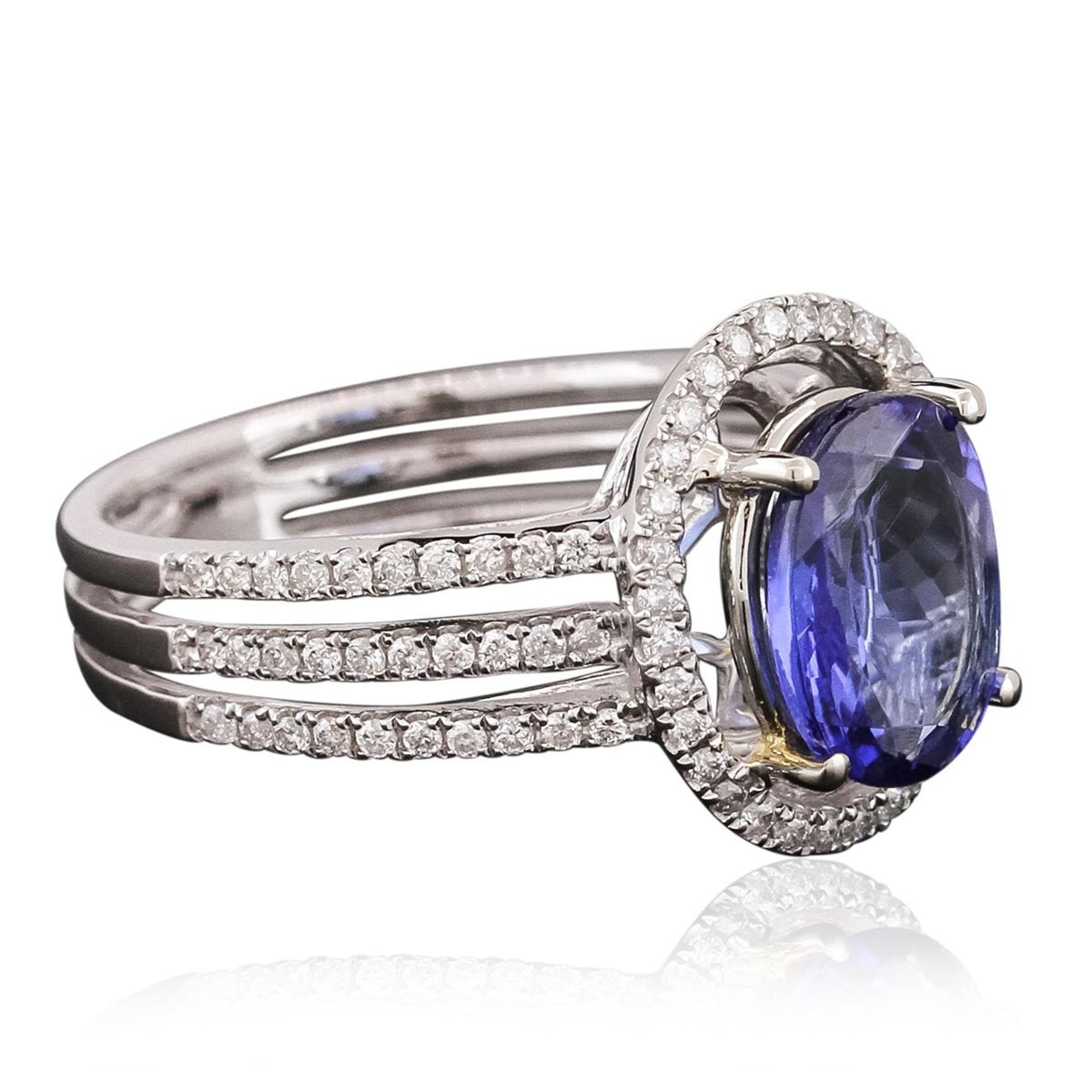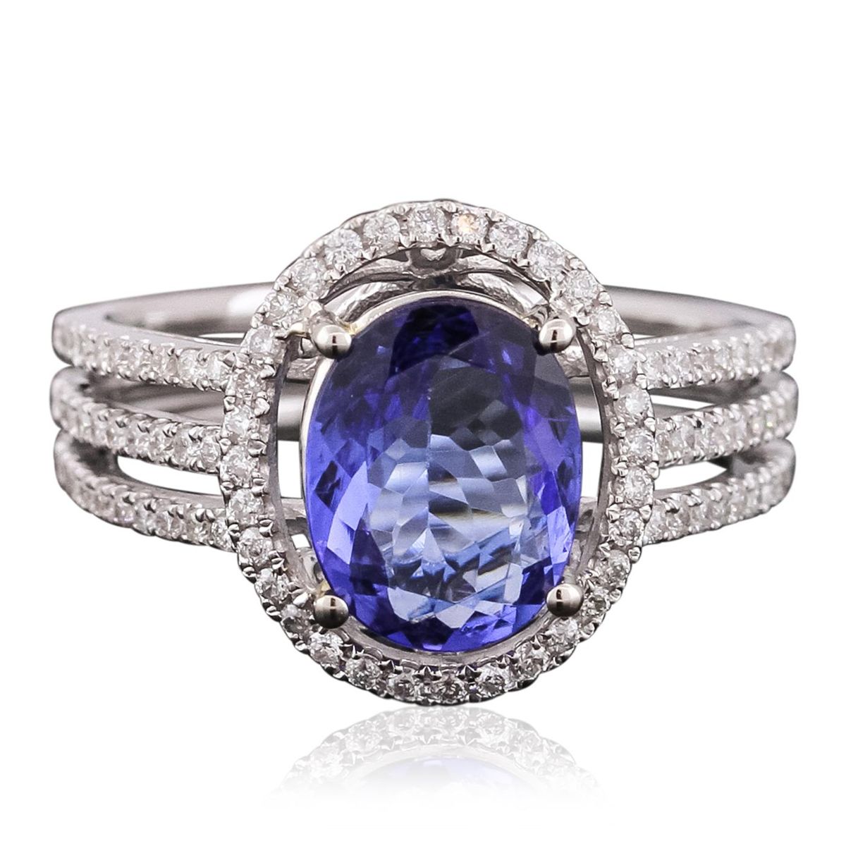 One electronically tested 14KT white gold ladies combination cast & assembled ring with a bright polish finish. Identified with markings of "14K". Condition is new. Containing: One prong set oval modified brilliant cut natural tanzanite, measuring 9.65 x 7.46 x 3.81mm, approximate weight of 1.87ct., clarity is eye clean, type I, medium light, very slightly grayish, violet color, (GIA V 4/3), cut is good. Ninety-One prong set round brilliant cut diamonds, measuring 1.10 - 1.10 x 0.66mm (depth est.) approximate total weight of 91 Stones = 0.44ct. Clarity: I-1 to I-2. Color: I - J, Cut is Good. Colored gemstones are presumed to have been subjected to commonly used enhancement processes. All diamonds and colored gemstones are graded in the mounting, unless otherwise stated. Total Weight of Colored Stones 1.87ct. Total Weight of Diamonds 0.44ct. Total Weight of Ring 4.70 grams. GGL Appraised at $5,520.00.