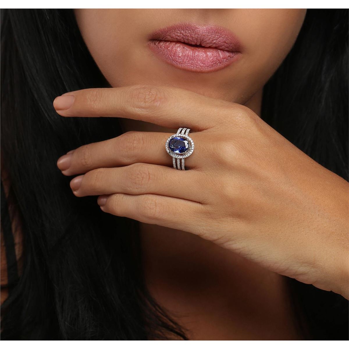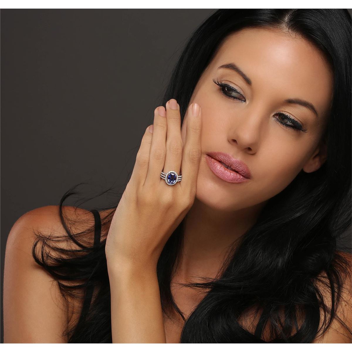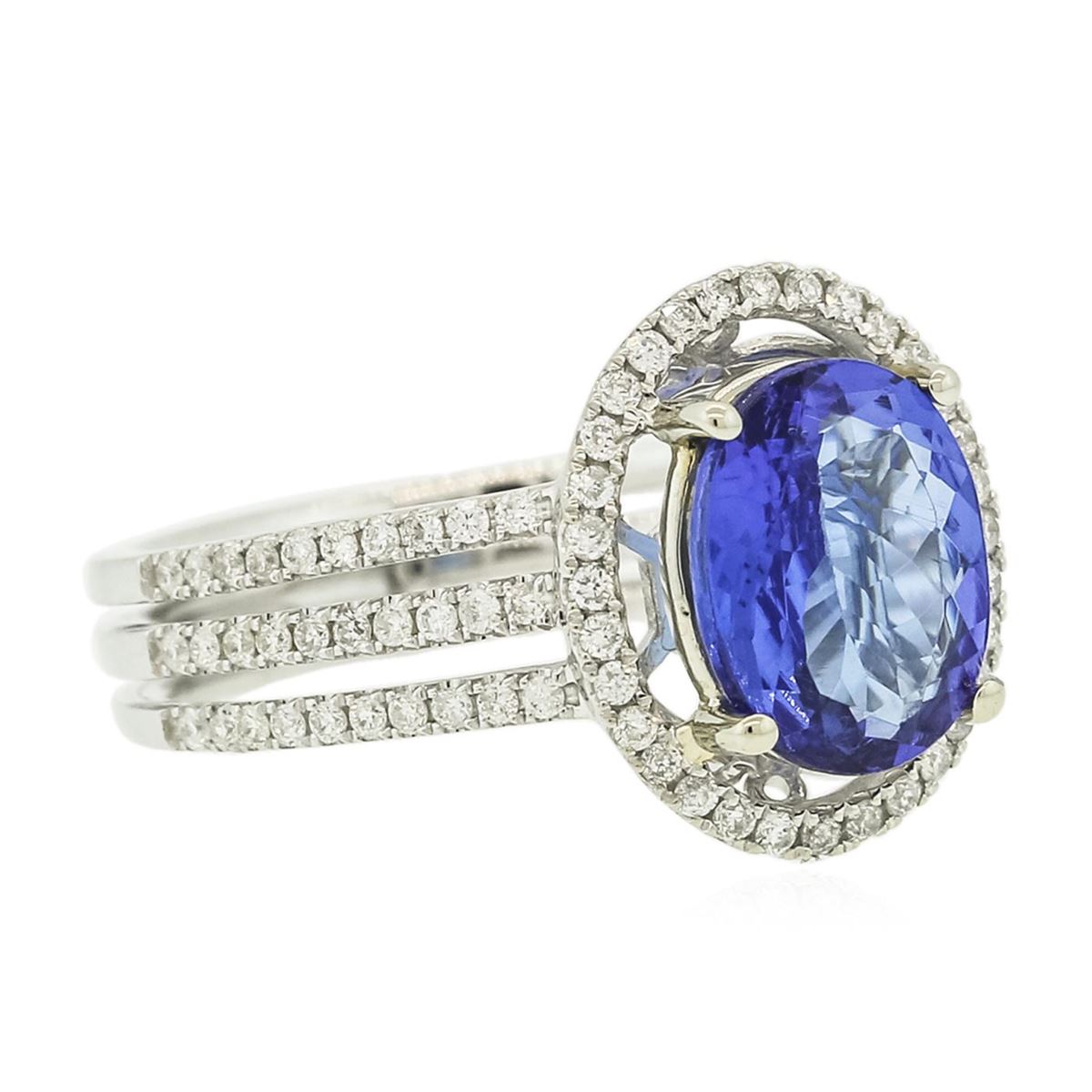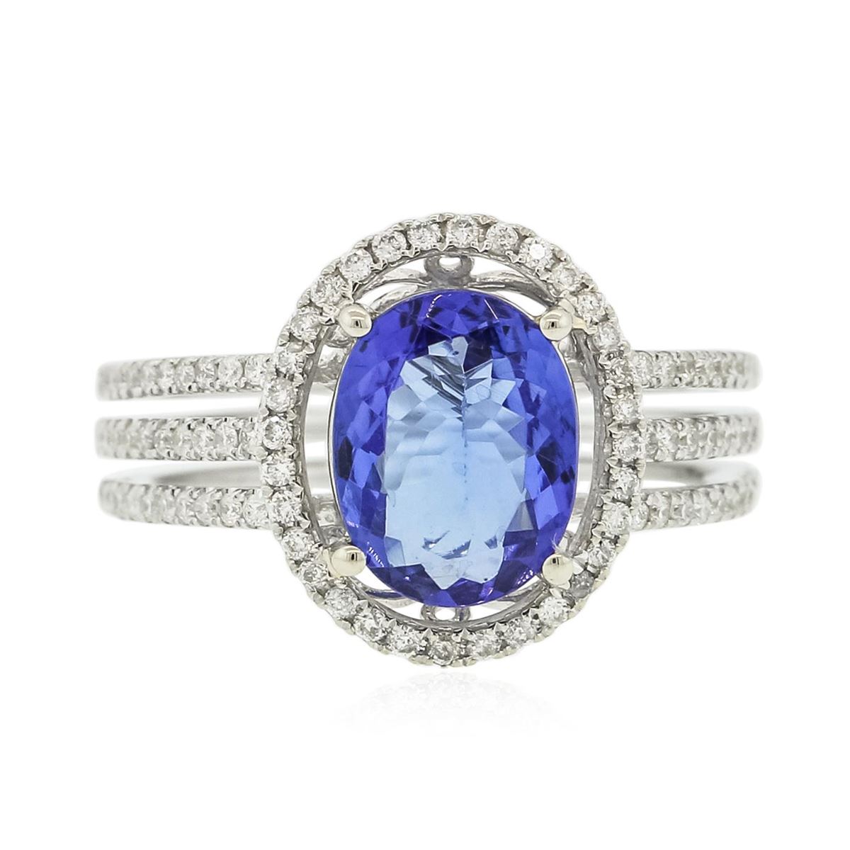 One electronically tested 14KT white gold ladies combination cast & assembled ring with a bright polish finish. Identified with markings of "14K". Condition is new. Containing: One prong set oval modified brilliant cut natural tanzanite, measuring 9.65 x 7.46 x 3.81mm, approximate weight of 1.87ct., clarity is eye clean, type I, medium light, very slightly grayish, violet color, (GIA V 4/3), cut is good. Ninety-One prong set round brilliant cut diamonds, measuring 1.10 - 1.10 x 0.66mm (depth est.) approximate total weight of 91 Stones = 0.44ct. Clarity: I-1 to I-2. Color: I - J, Cut is Good. Colored gemstones are presumed to have been subjected to commonly used enhancement processes. All diamonds and colored gemstones are graded in the mounting, unless otherwise stated. Total Weight of Colored Stones 1.87ct. Total Weight of Diamonds 0.44ct. Total Weight of Ring 4.70 grams. GGL Appraised at $5,520.00.