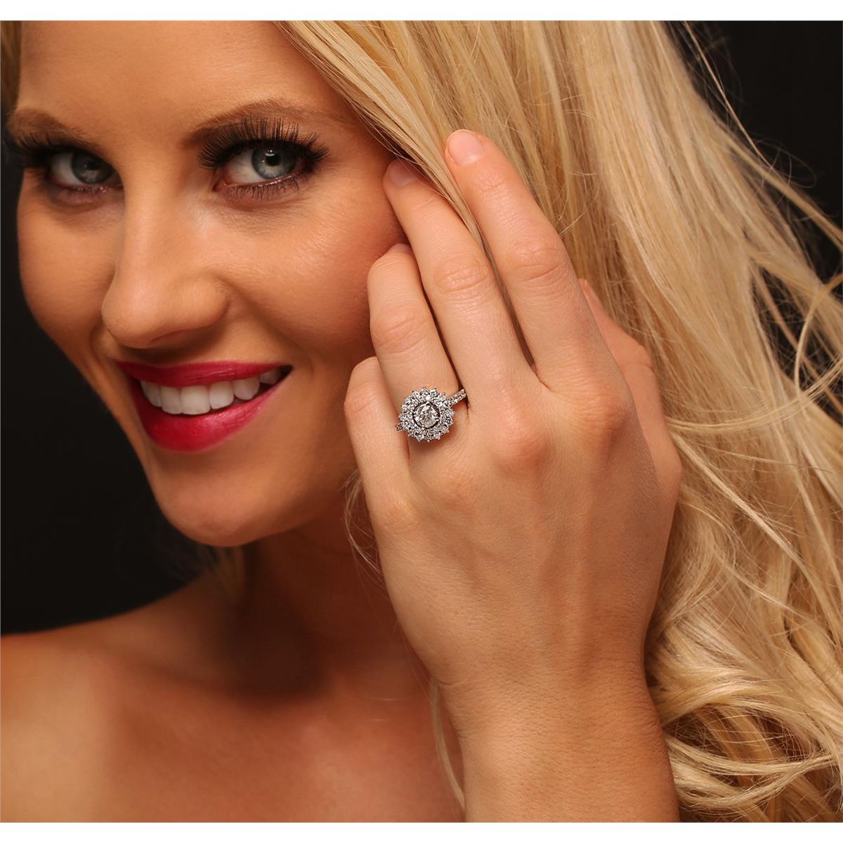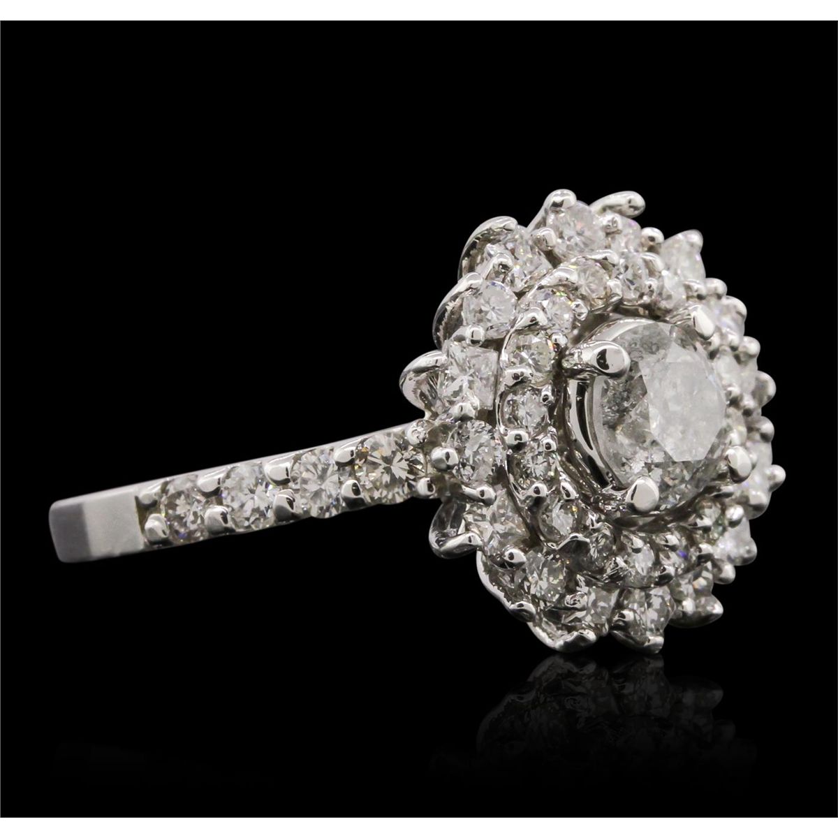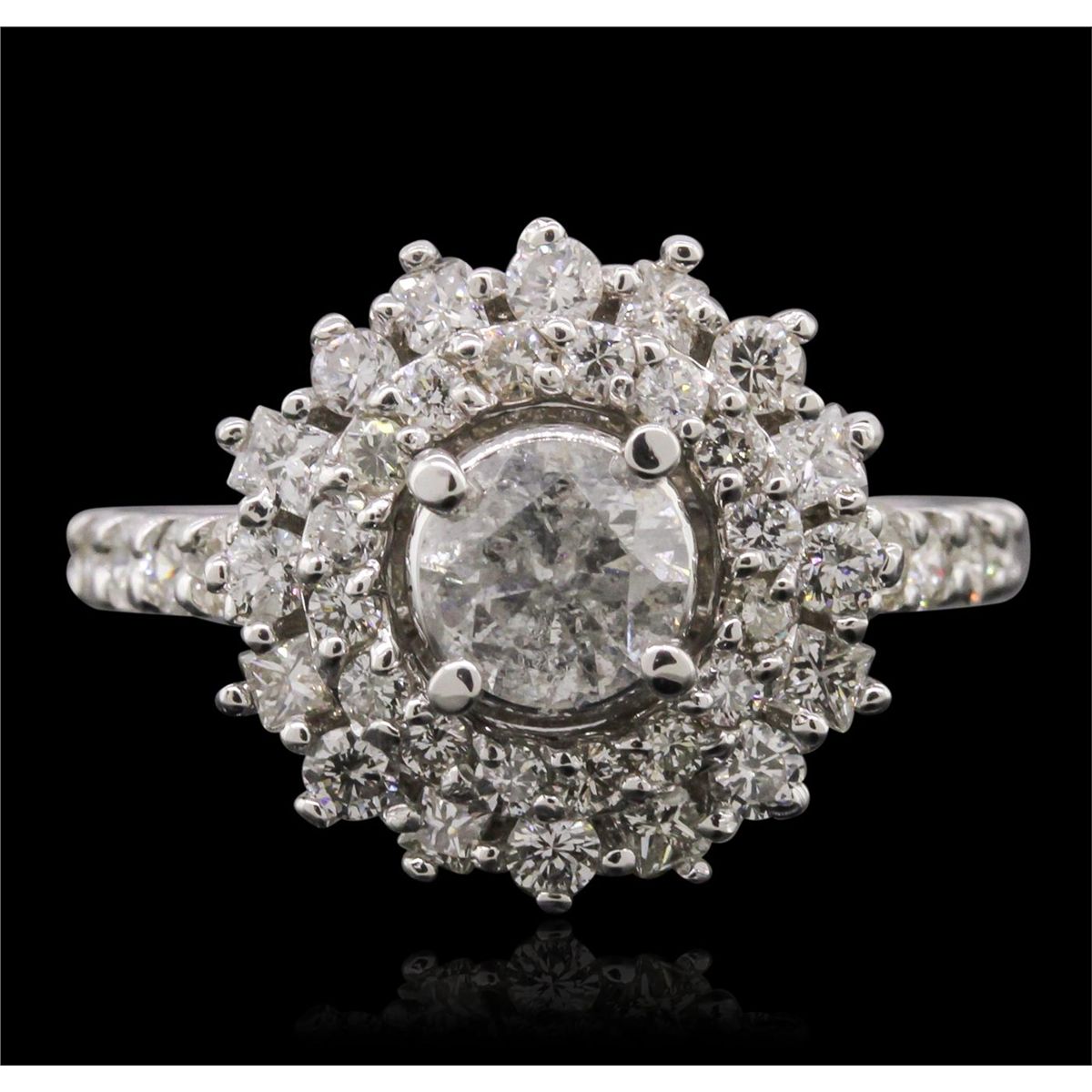 One electronically tested 14KT white gold ladies cast diamond ring with a bright polish finish. Condition is new, good workmanship. The featured diamond is set within a two tiered diamond bezel supported by diamond set shoulders, completed by a two millimeter wide band. Identified with markings of "K14". Containing: One prong set round brilliant cut diamond, measuring 5.60 - 5.50 x 3.35mm (depth est.), 10.00.%. GTCF approximate weight of 0.77ct with a strong blue fluorescence. Naturally occurring internal & external characteristics are present, including iridescence. Graded in the setting. Clarity: I-2. Color: 60.4%. Table 61.3%. Forty prong set round brilliant and princess cut diamonds approximate. Total Weight of 40 Stones = 1.10ct. Graded in the setting. Clarity: SI-1 to I-1. Color: H - J. Total Weight of Diamonds 1.87ct. Total Weight of Ring 4.59 grams. AIG Appraised at $7,690.00.