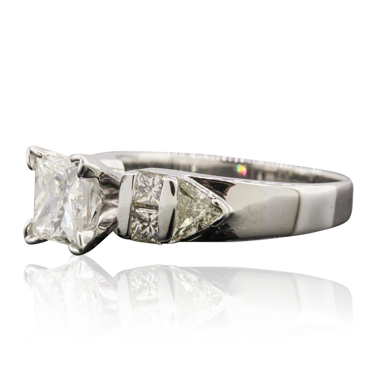 One electronically tested 14KT white gold ladies combination cast & assembled engagement ring with a bright polish finish. Condition is very good. Identified with markings of "14KP". Containing: One prong set princess cut diamond, measuring 6.00 x 5.50 x 4.13mm (depth est.) approximate weight of 1.12ct. Clarity: SI-2. Color: J, Cut is Good. Clarity: the stone has been enhanced. Four channel set princess cut diamonds, measuring 2.30 x 2.30 x 1.73mm (depth est.) approximate. Total Weight of 4 Stones = 0.30ct. Clarity: VS-2. Color: L - M, Cut is Good. Two prong set triangle brilliant cut diamonds, measuring 4.00 x 4.00 x 2.48mm (depth est.) approximate. Total Weight of 2 Stones = 0.45ct. Clarity: SI-2. Color: L - M, Cut is Good. All diamonds are graded in the mounting, unless otherwise stated. Total Weight of Diamonds 1.87ct. Total Weight of Ring 4.30 grams. GGL Appraised at $15,675.00.V189