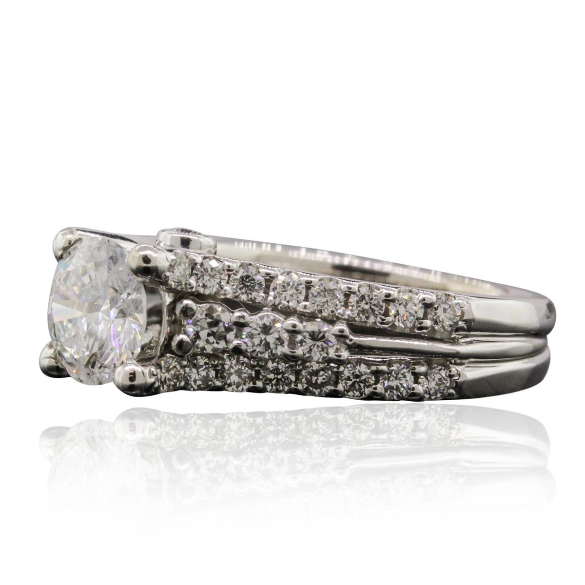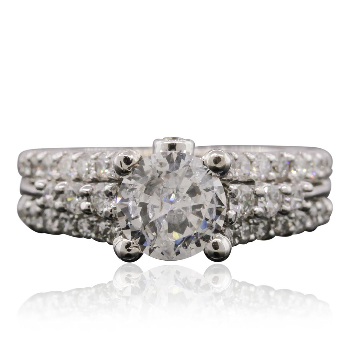 One electronically tested 14KT white gold Ladies combination cast & assembled engagement ring with a bright polish finish. Condition is new. Identified with markings of "14K". Containing: One prong set round brilliant cut diamond, measuring 6.72 - 6.71 x 3.81mm (depth est.) approximate. Total Weight of 1.04ct. Clarity: I-3. Color: F, Cut is Good. Forty-Four prong set round brilliant cut diamonds, measuring 1.90 - 1.50 x 1.02mm (depth est.) approximate. Total Weight of 44 Stones = 0.83ct. Clarity: VS-2 to SI-2. Color: F - G, Cut is Good. EGL USA GEM ID# US 911348427D. All diamonds are graded in the mounting, unless otherwise stated. Total Weight of Diamonds 1.87ct. Total Weight of Engagement Ring 5.50 grams. GGL Appraised at $10,025.00.