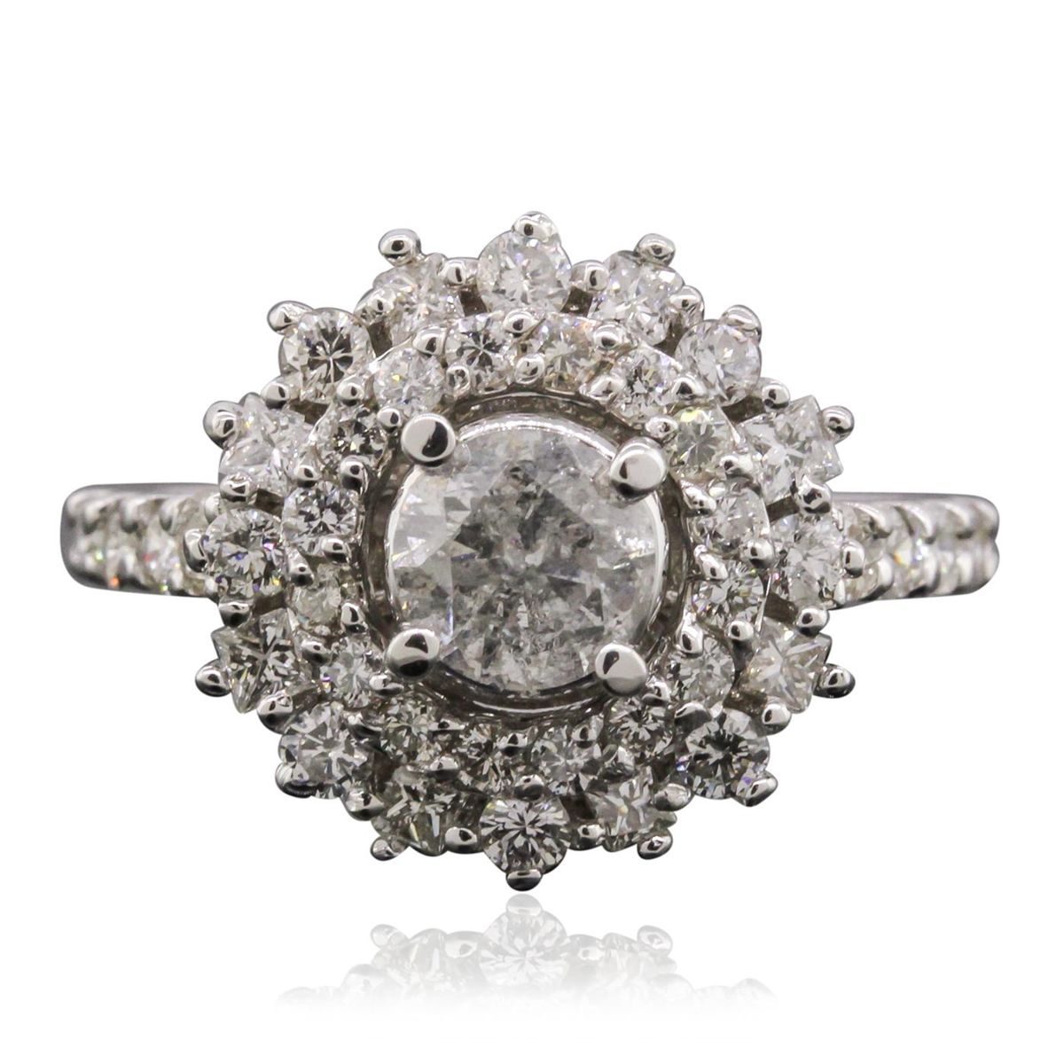 One electronically tested 14KT white gold ladies cast diamond ring with a bright polish finish. Condition is new, good workmanship. The featured diamond is set within a two tiered diamond bezel supported by diamond set shoulders, completed by a two millimeter wide band. Identified with markings of "K14". Containing: One prong set round brilliant cut diamond, measuring 5.60 - 5.50 x 3.35mm (depth est.), 10.00.%. GTCF approximate weight of 0.77ct with a strong blue fluorescence. Naturally occurring internal & external characteristics are present, including iridescence. Graded in the setting. Clarity: I-2. Color: 60.4%. Table 61.3%. Forty prong set round brilliant and princess cut diamonds approximate. Total Weight of 40 Stones = 1.10ct. Graded in the setting. Clarity: SI-1 to I-1. Color: H - J. Total Weight of Diamonds 1.87ct. Total Weight of Ring 4.59 grams. AIG Appraised at $7,690.00.