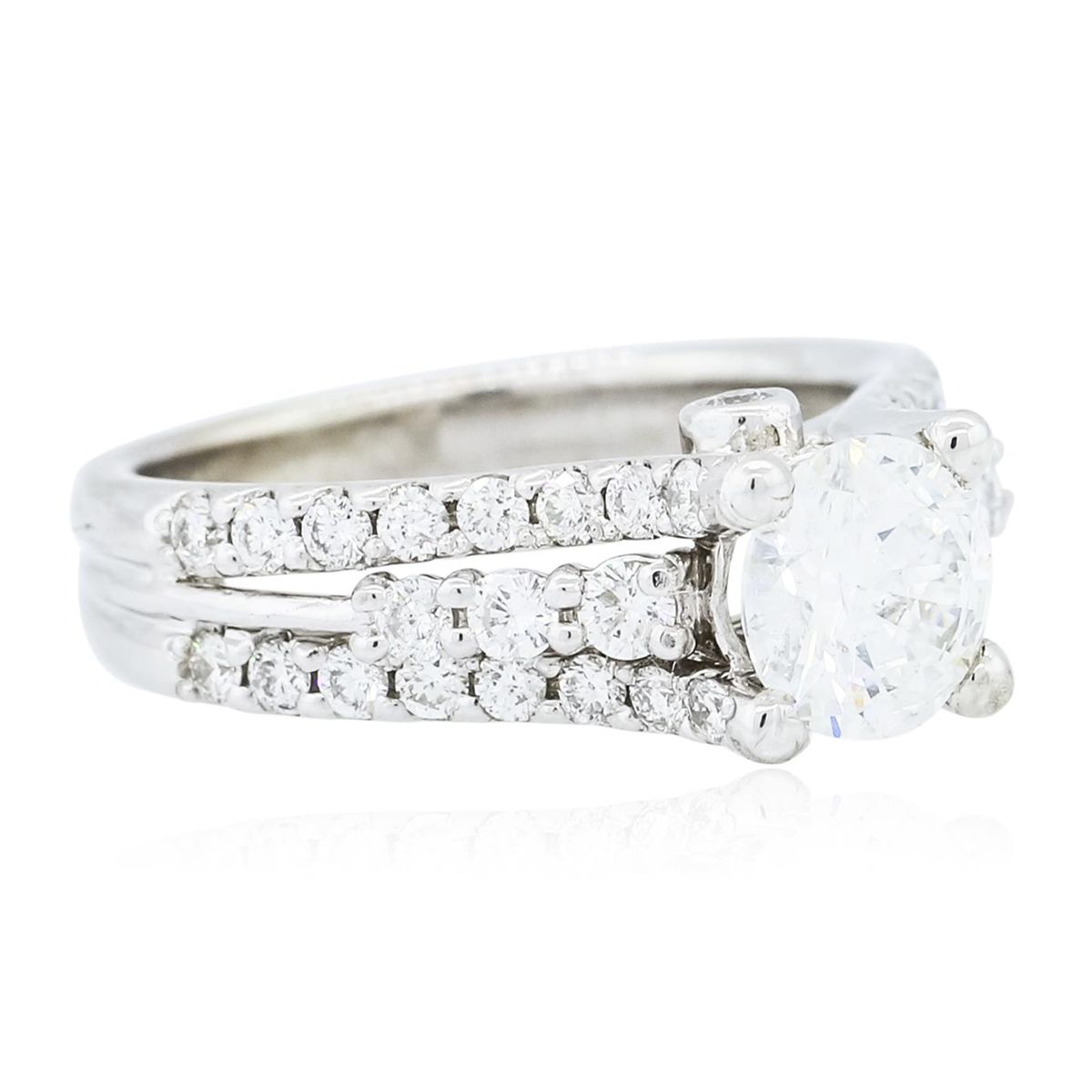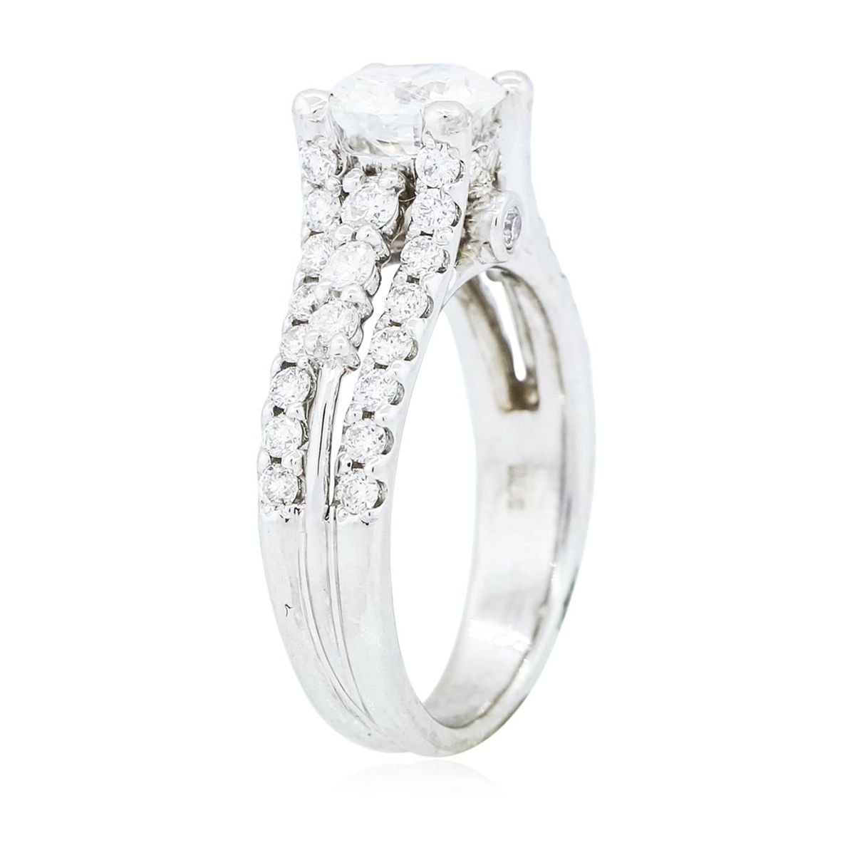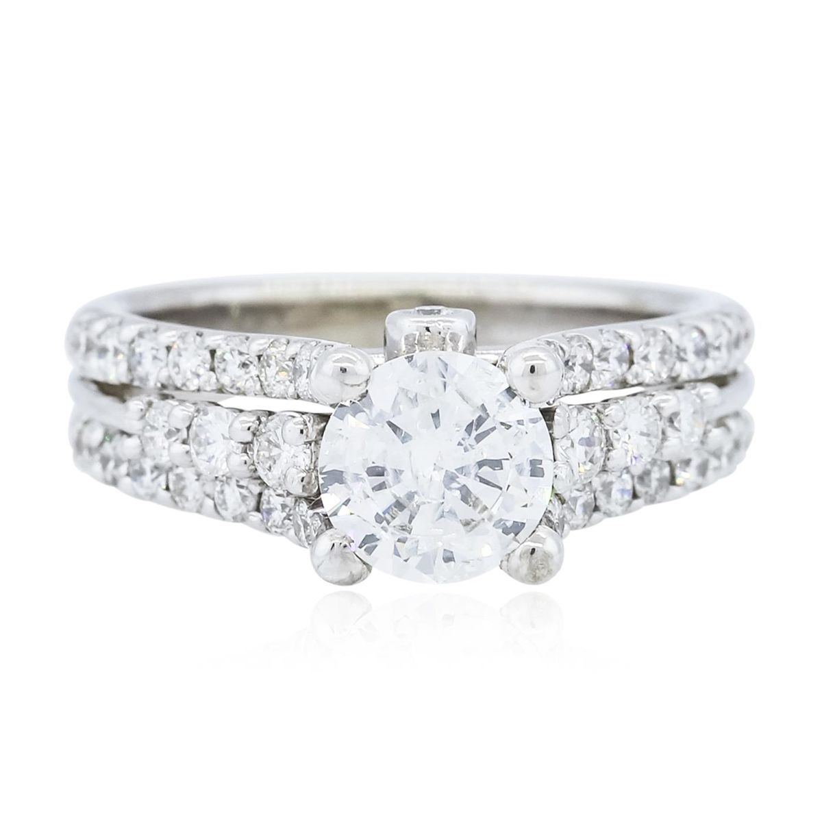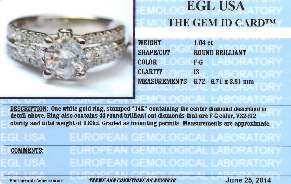 One electronically tested 14KT white gold Ladies combination cast & assembled engagement ring with a bright polish finish. Condition is new. Identified with markings of "14K". Containing: One prong set round brilliant cut diamond, measuring 6.72 - 6.71 x 3.81mm (depth est.) approximate. Total Weight of 1.04ct. Clarity: I-3. Color: F, Cut is Good. Forty-Four prong set round brilliant cut diamonds, measuring 1.90 - 1.50 x 1.02mm (depth est.) approximate. Total Weight of 44 Stones = 0.83ct. Clarity: VS-2 to SI-2. Color: F - G, Cut is Good. EGL USA GEM ID# US 911348427D. All diamonds are graded in the mounting, unless otherwise stated. Total Weight of Diamonds 1.87ct. Total Weight of Engagement Ring 5.50 grams. GGL Appraised at $10,025.00.