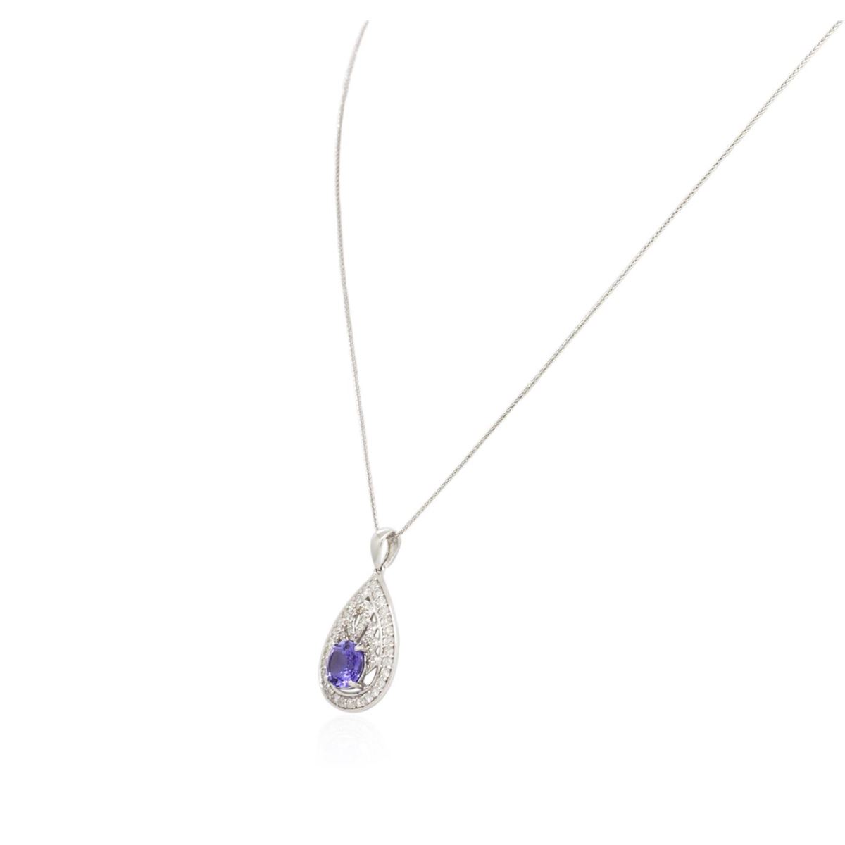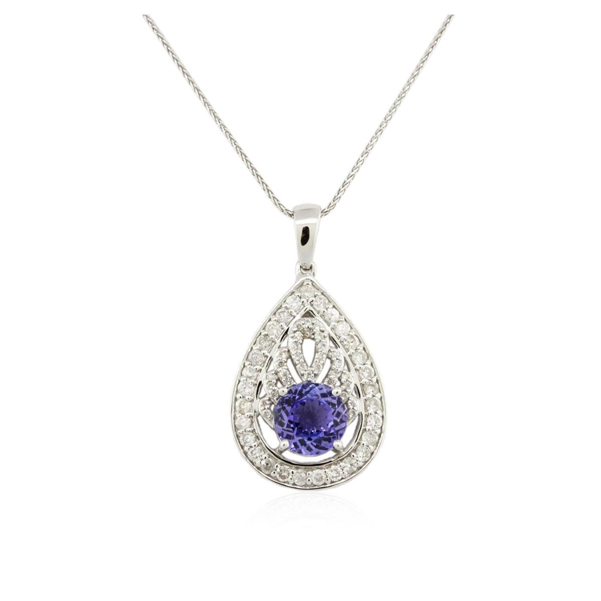 One electronically tested 14KT white gold Ladies combination cast & assembled pendant & chain 17.0" long, medium fancy link with a lobster claw clasp with a bright polish finish. Condition is new. Identified with markings of "14K". Containing: One prong set round round modified brilliant cut natural tanzanite, measuring 7.80 - 7.80 x 4.60 mm, approximate. Total Weight of 1.88ct., clarity is eye clean, type I, medium light, very slightly grayish, violet color, (GIA V 4/3), cut is good. Colored gemstones are presumed to have been subjected to commonly used color/clarity enhancement processes. Sixty prong set round brilliant cut diamonds, measuring 1.70 - 1.70 x 1.02mm (depth est.) approximate. Total Weight of 60 Stones = 1.07ct. Clarity: SI-2 to I-2. Color: I - J, Cut is Good. Total Weight of Colored Stones 1.88ct. Total Weight of Diamonds 1.07ct. Total Weight of Pendant & Chain 5.20 grams. GGL Appraised at $6,770.00.