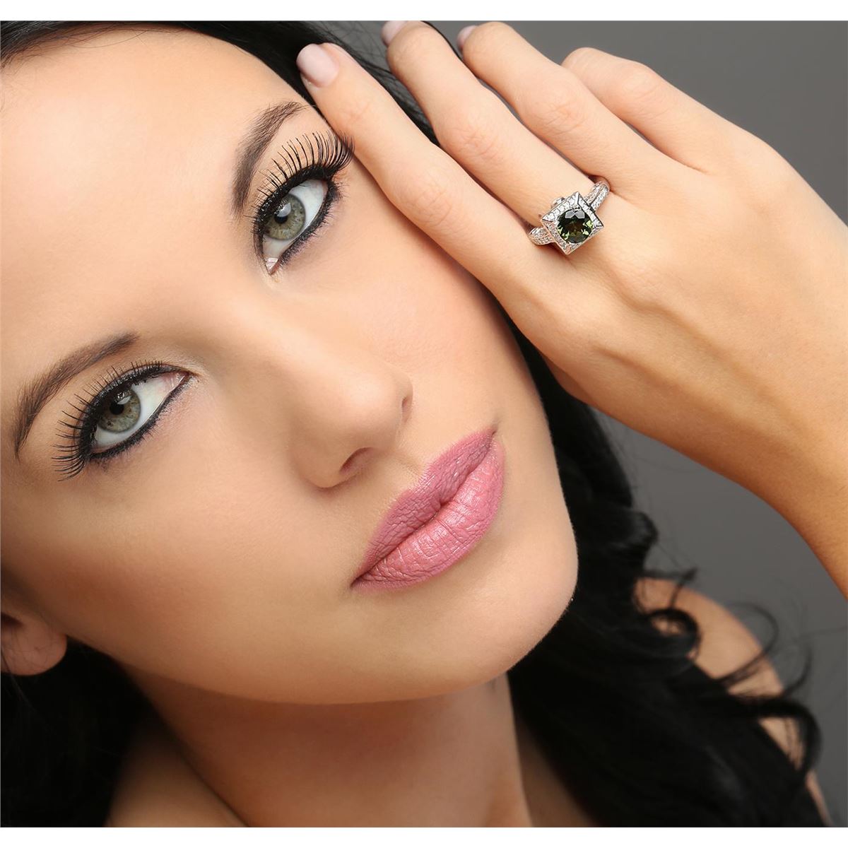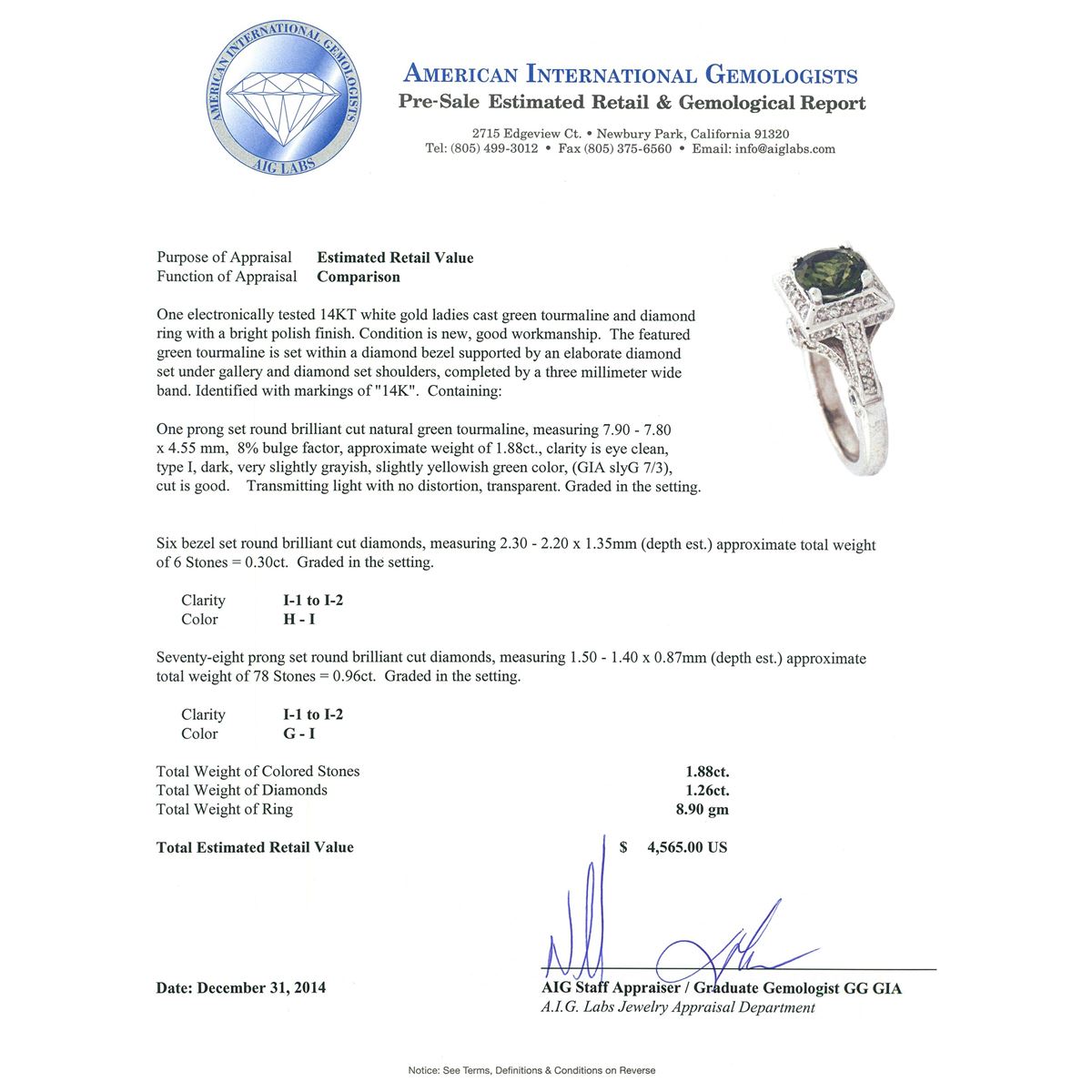 One electronically tested 14KT white gold ladies cast green tourmaline and diamond ring with a bright polish finish. The featured green tourmaline is set within a diamond bezel supported by an elaborate diamond set under gallery and diamond set shoulders, completed by a three millimeter wide band. Identified with markings of "14K". Condition is new, good workmanship. Containing: One prong set round brilliant cut natural green tourmaline, measuring 7.90 - 7.80 x 4.55 mm, 8% bulge factor, approximate weight of 1.88ct., clarity is eye clean, type I, dark, very slightly grayish, slightly yellowish green color, (GIA slyG 7/3), cut is good. Transmitting light with no distortion, transparent. Graded in the setting. Six bezel set round brilliant cut diamonds, measuring 2.30 - 2.20 x 1.35mm (depth est.) approximate total weight of 6 Stones = 0.30ct. Graded in the setting. Clarity: I-1 to I-2. Color: H - I Seventy-Eight prong set round brilliant cut diamonds, measuring 1.50 - 1.40 x 0.87mm (depth est.) approximate total weight of 78 Stones = 0.96ct. Graded in the setting. Clarity: I-1 to I-2. Color: G - I. Total Weight of Colored Stones 1.88ct. Total Weight of Diamonds 1.26ct. Total Weight of Ring 8.90 grams. AIG Appraised at $4,565.00.