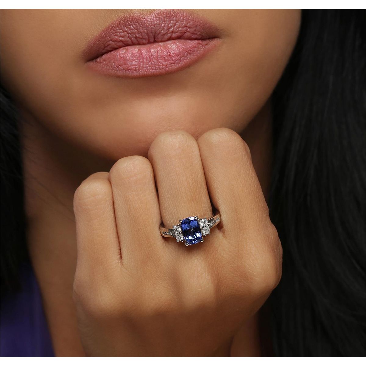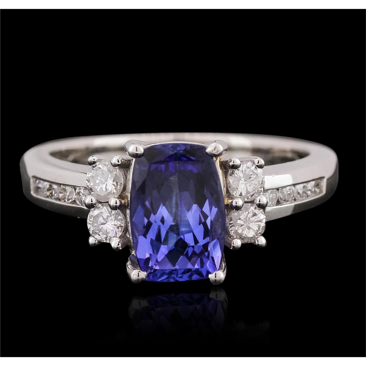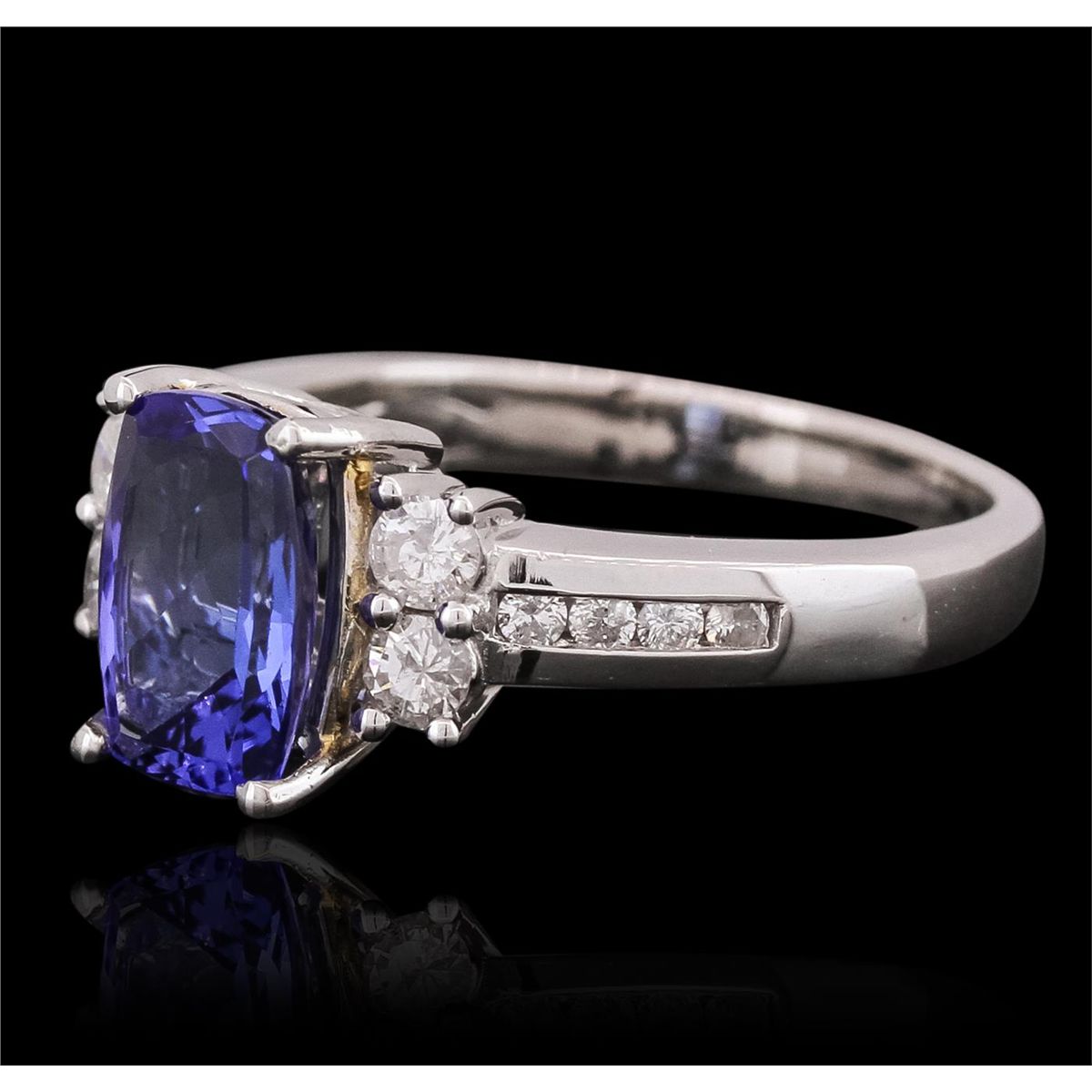 One electronically tested 14KT white gold ladies cast tanzanite and diamond ring with a bright polish finish. The featured tanzanite is accented by diamond duos on either side supported by diamond set shoulders, completed by a two and one-half millimeter wide band. Identified with markings of "14K". Condition is new, good workmanship. Containing: One prong set rectangular cushion mixed cut natural tanzanite, measuring 9.10 x 6.15 x 3.95mm, 8% bulge factor, approximate weight of 1.88ct., clarity is eye clean, type I, medium dark, very slightly grayish, violetish blue color, (GIA vB 6/3), cut is good. Transmitting light with no distortion, transparent. Graded in the setting. Tanzanite is a very rare gemstone that is only found in the country of Tanzania. Originally discovered in 1967. Tiffany & Company, named the stone Tanzanite. It is found in the Usumburu Mountains that border the Umba Valley of northern Tanzania. Tanzanite occurs in gray, brown, violet, blue, reddish-purple, & green. The gem is interesting because of its exceptional pleochroism. Rotated in different directions a tanzanite will exhibit multiple changes of color. Tanzanite has a low tolerance to ultrasonic cleaning, and should not be cleaned using this method. Four prong set round brilliant cut diamonds, measuring 2.70 - 2.60 x 1.59mm (depth est.) approximate total weight of 4 Stones = 0.37ct. Graded in the setting. Clarity: SI-2 to I-1. Color: H - I Eight channel set round brilliant cut diamonds, measuring 1.70 - 1.60 x 0.99mm (depth est.) approximate total weight of 8 Stones = 0.23ct. Graded in the setting. Clarity: SI-2 to I-1. Color: H - J. Total Weight of Colored Stones 1.88ct. Total Weight of Diamonds 0.60ct. Total Weight of Ring 4.42 grams. AIG Appraised at $6,170.00.