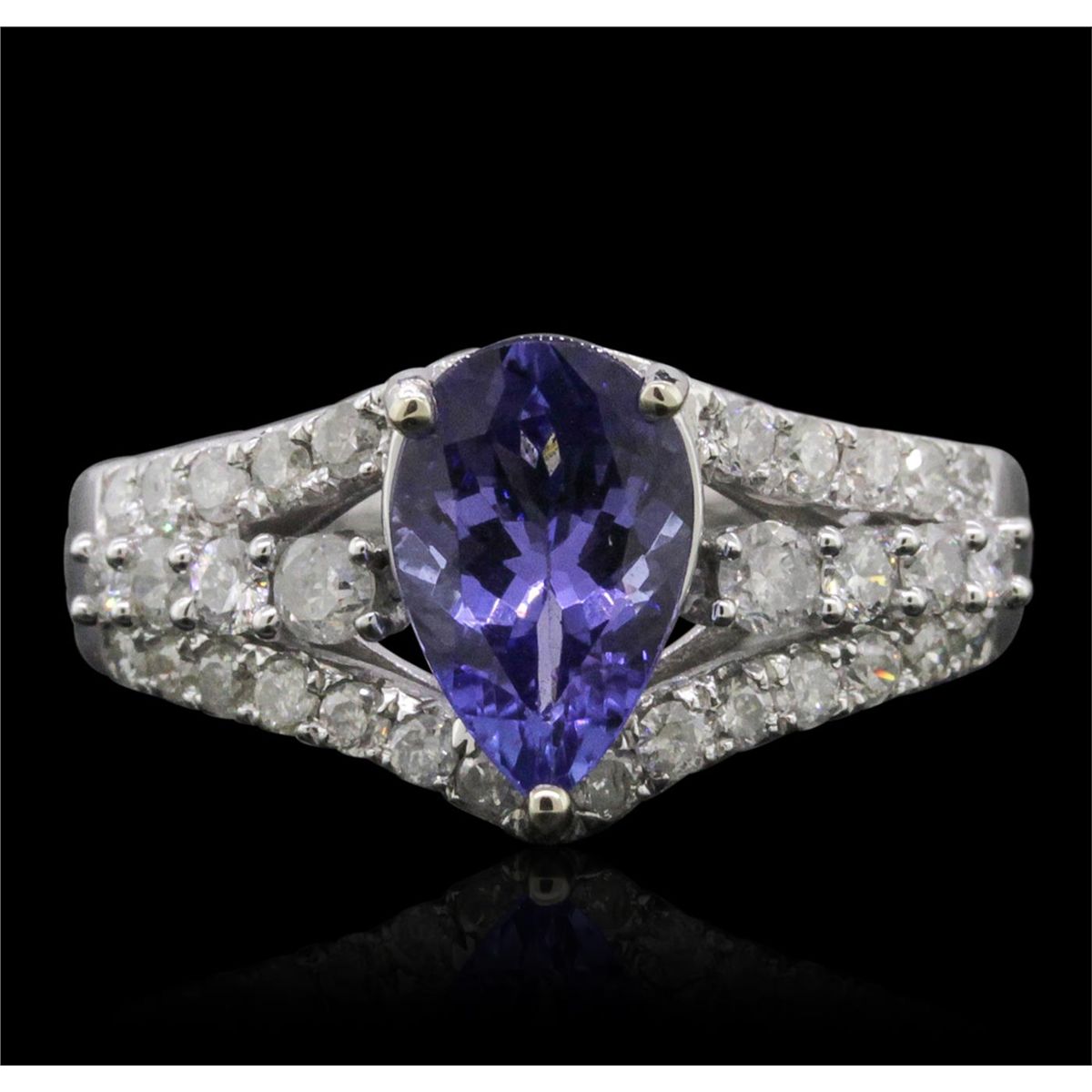 One electronically tested 14KT white gold ladies combination cast & assembled tanzanite and diamond ring with a split shank with a bright polish finish. Identified with markings of "14K". Condition is new. Containing: One prong set pear modified brilliant cut natural tanzanite, measuring 10.51 x 6.32 x 4.22mm, approximate weight of 1.88ct., clarity is eye clean, type I, medium, very slightly grayish, violet color, (GIA V 5/3), cut is good. Thirty-Two prong set round brilliant cut diamonds, measuring 2.10 - 1.50 x 1.08mm (depth est.) approximate total weight of 32 Stones = 0.50ct. Clarity: I-1 to I-2. Color: I - J, Cut is Good. Colored gemstones are presumed to have been subjected to commonly used enhancement processes. All diamonds and colored gemstones are graded in the mounting, unless otherwise stated. Total Weight of Colored Stones 1.88ct. Total Weight of Diamonds 0.50ct. Total Weight of Ring 4.70 grams. GGL Appraised at $5,140.00. GGL Appraised at $2,315.00.