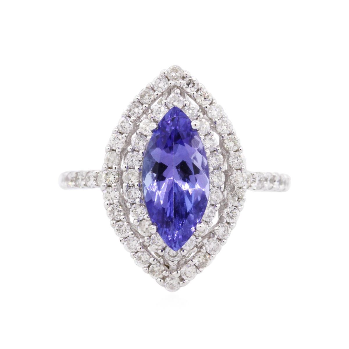 One electronically tested 14KT white gold ladies cast tanzanite and diamond ring with a Bright polish finish. The featured tanzanite is set within two tiered diamond bezels supported by a diamond set under gallery and diamond set shoulders, completed by a one and one-half millimeter wide band. Trademark is Orianne. Identified with markings of "14KT". Condition is new, good workmanship. Containing: One prong set marquise brilliant cut natural tanzanite, measuring 12.20 x 5.70 x 4.00mm, 6% bulge factor, approximate weight of 1.88ct., clarity is eye clean, type I, medium dark, very slightly grayish, bluish violet color, (GIA bV 6/3), cut is good. Transmitting light with no distortion, transparent. Graded in the setting. Tanzanite is a very rare gemstone that is only found in the country of Tanzania. Originally discovered in 1967. Tiffany & Company, named the stone Tanzanite. It is found in the Usumburu Mountains that border the Umba Valley of northern Tanzania. Tanzanite occurs in gray, brown, violet, blue, reddish-purple, & green. The gem is interesting because of its exceptional pleochroism. Rotated in different directions a tanzanite will exhibit multiple changes of color. Tanzanite has a low tolerance to ultrasonic cleaning, and should not be cleaned using this method. Ninety-Six prong set round brilliant cut diamonds, measuring 1.50 - 1.10 x 0.78mm (depth est.) approximate total weight of 96 Stones = 0.85ct. Graded in the setting. Clarity: SI-1 to I-1. Color: G - I. Total Weight of Colored Stones 1.88ct. Total Weight of Diamonds 0.85ct. Total Weight of Ring 4.01 grams. AIG Appraised at $7,215.00.
