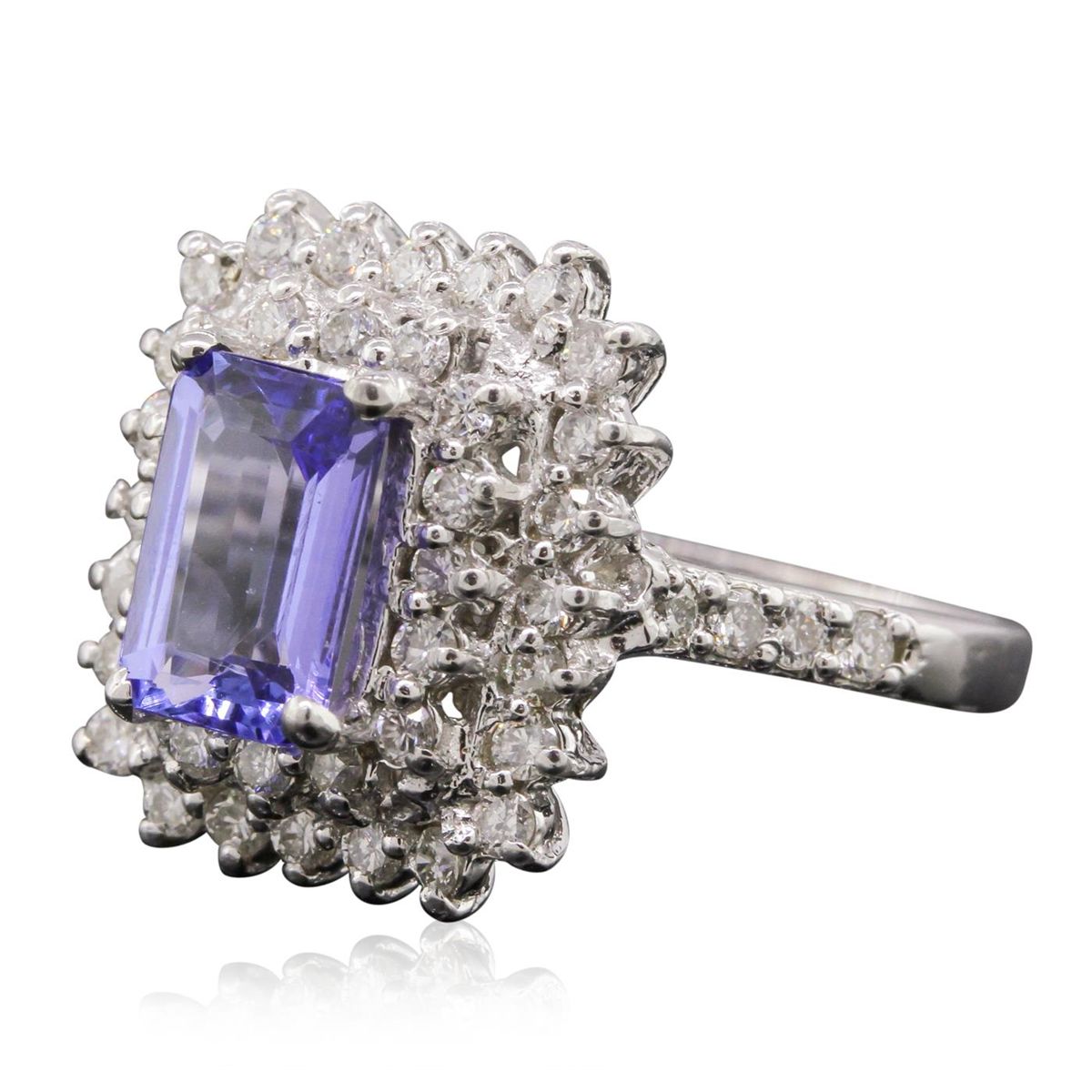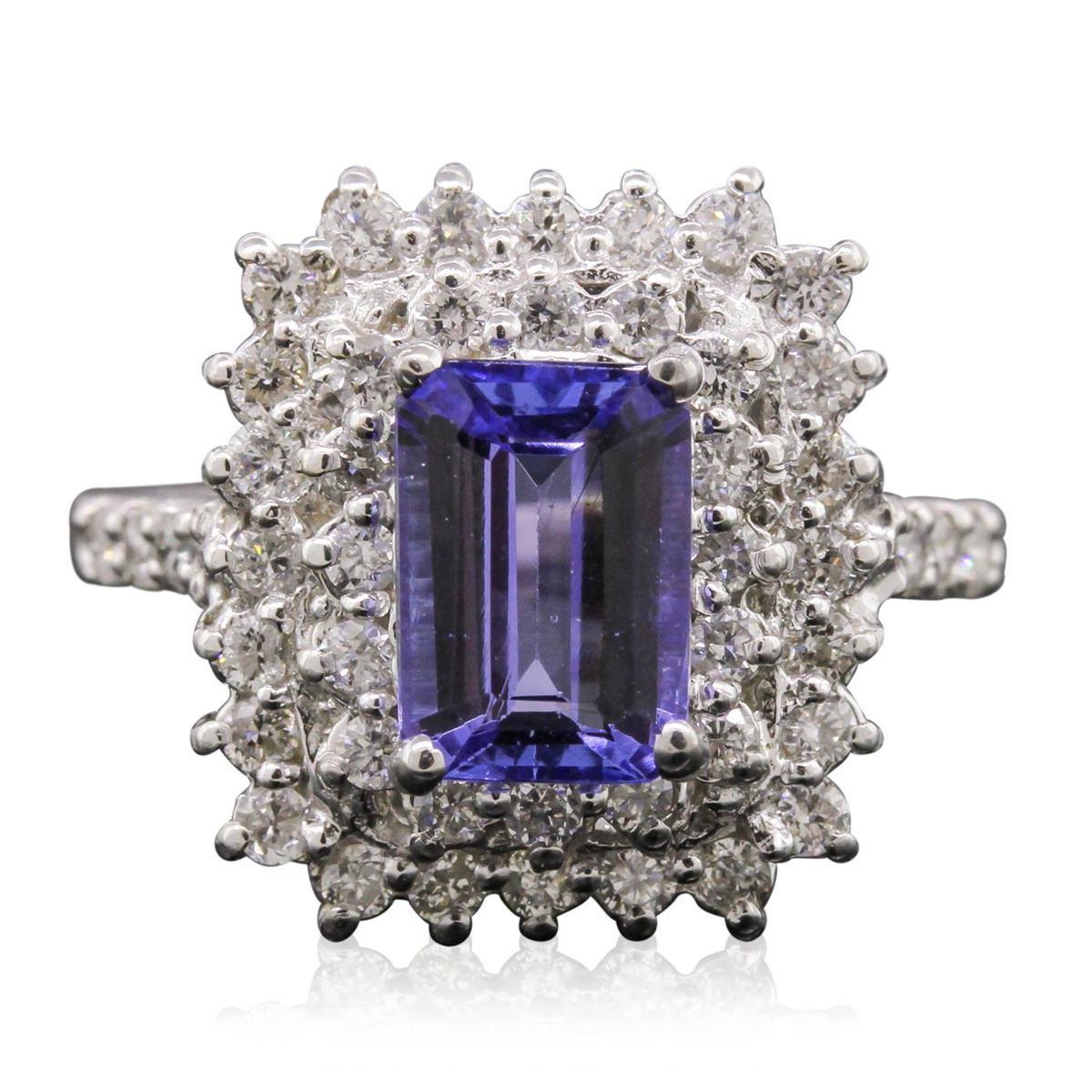 One electronically tested 14KT white gold ladies cast tanzanite and diamond ring with a bright polish finish. The featured tanzanite is set within two tiered diamond bezels supported by diamond set shoulders, completed by two millimeter wide band. Identified with markings of "K14". Condition is new, good workmanship. Containing: One prong set rectangular step cut natural tanzanite, measuring 8.70 x 6.10 x 3.70mm, approximate weight of 1.88ct., clarity is slightly included, type I, medium dark, very slightly grayish, bluish violet color, (GIA bV 6/3), cut is good. Transmitting light with no distortion, transparent. Graded in the setting.Tanzanite is a very rare gemstone that is only found in the country of Tanzania. Originally discovered in 1967. Tiffany & Company, named the stone Tanzanite. It is found in the Usumburu Mountains that border the Umba Valley of northern Tanzania. Tanzanite occurs in gray, brown, violet, blue, reddish-purple, & green. The gem is interesting because of its exceptional pleochroism. Rotated in different directions a tanzanite will exhibit multiple changes of color. Tanzanite has a low tolerance to ultrasonic cleaning, and should not be cleaned using this method.Forty-Eight prong set round brilliant cut diamonds, measuring 1.70 - 1.70 x 1.02mm (depth est.) approximate. Total Weight of 48 Stones = 0.89ct. Graded in the setting. Clarity: SI-1 to I-1 . Color: G - I. Total Weight of Colored Stones 1.88ct. Total Weight of Diamonds 0.89ct. Total Weight of Ring 6.01gm. AIG Appraised at $7,455.00.