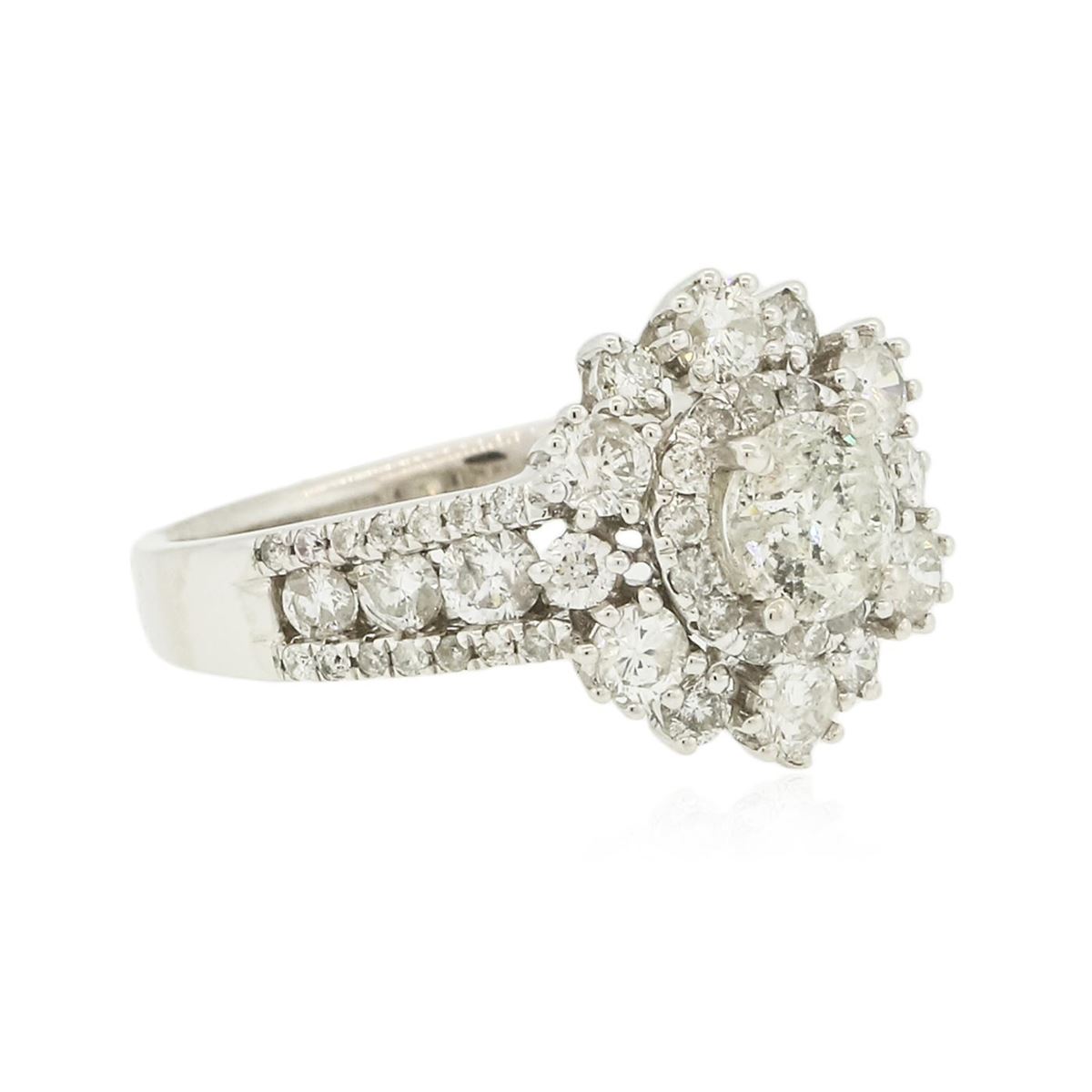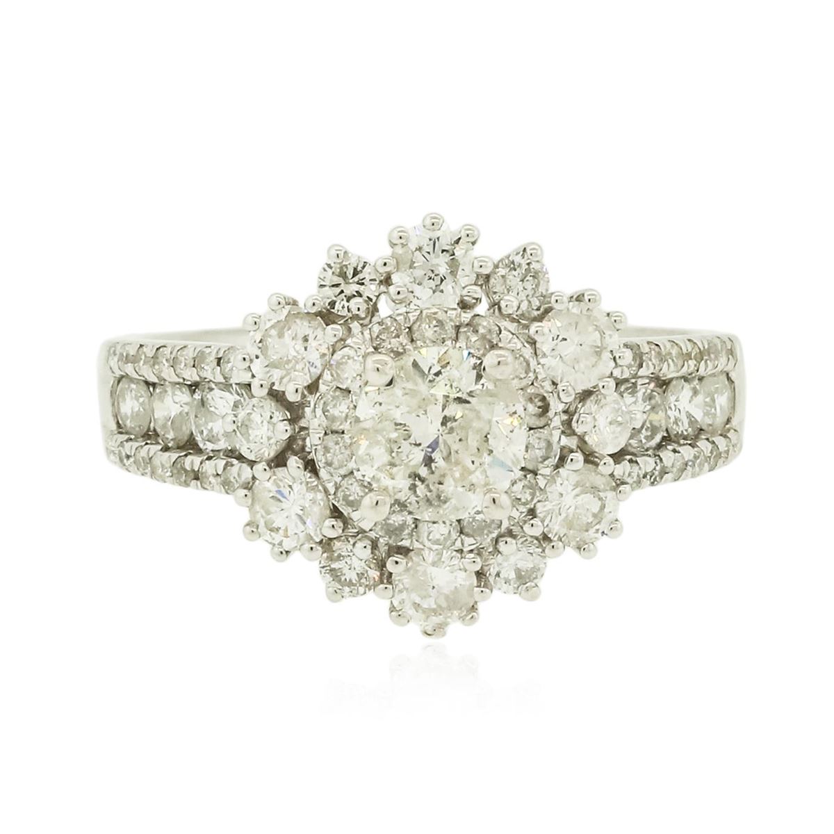 One electronically tested 14KT white gold ladies combination cast & assembled engagement ring with a split shank with a bright polish finish. Identified with markings of "14K". Condition is new. Containing: One prong set round brilliant cut diamond, measuring 5.38 - 5.37 x 3.19mm (depth est.) approximate weight of 0.56ct. Clarity: I-3. Color: K, Cut is Good. Eighteen prong set round brilliant cut diamonds, measuring 2.90 - 2.10 x 1.50mm (depth est.) approximate total weight of 18 Stones = 1.03ct. Clarity: SI-1 to I-1. Color: I - J, Cut is Good. Forty-Two prong set round brilliant cut diamonds, measuring 1.40 - 1.10 x 0.75mm (depth est.) approximate total weight of 42 Stones = 0.30ct. Clarity: SI-1 to I-1. Color: I - J, Cut is Good. All diamonds are graded in the mounting, unless otherwise stated. Total Weight of Diamonds 1.89ct. Total Weight of Ring 4.40 grams. GGL Appraised at $6,640.00.