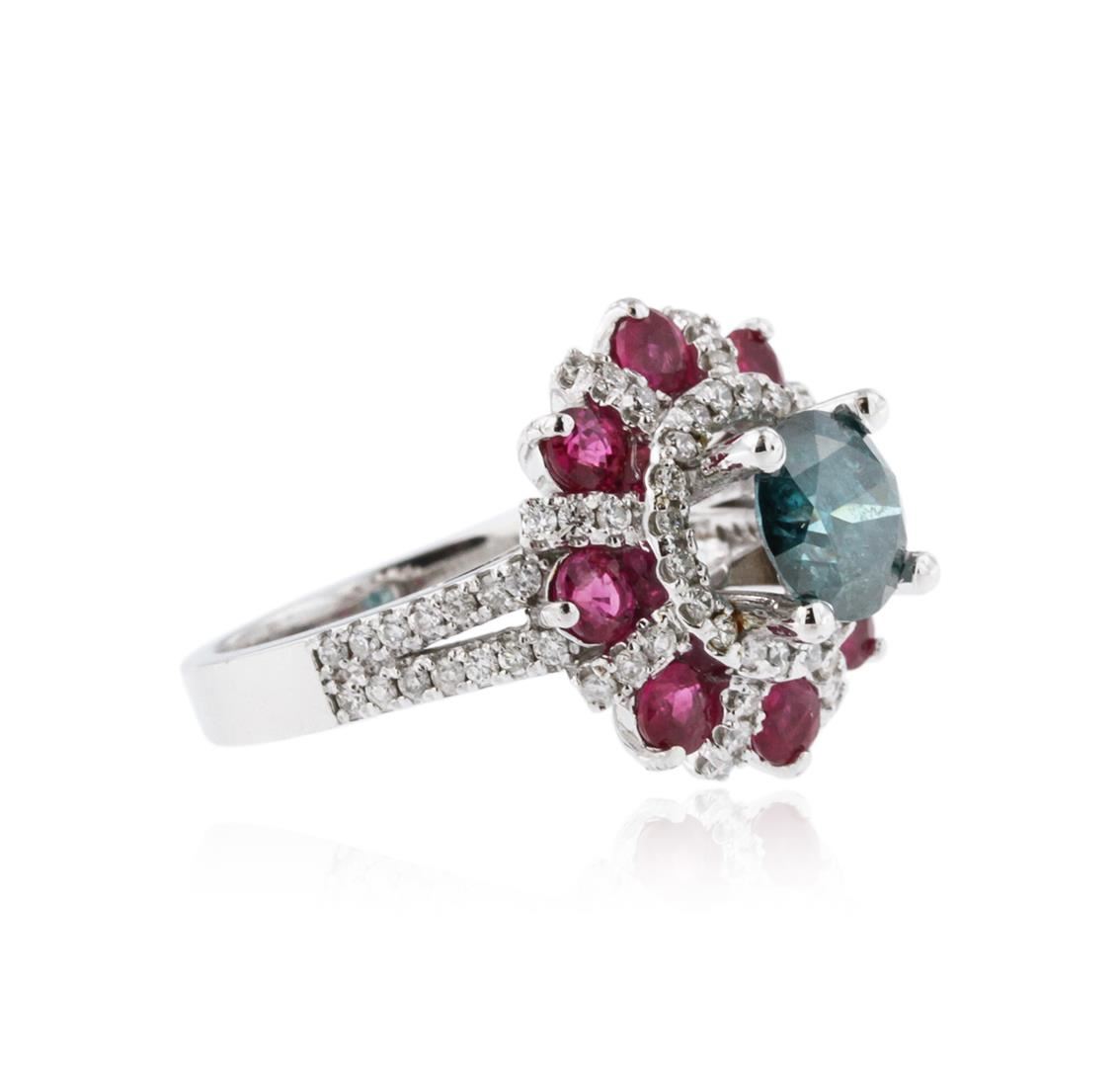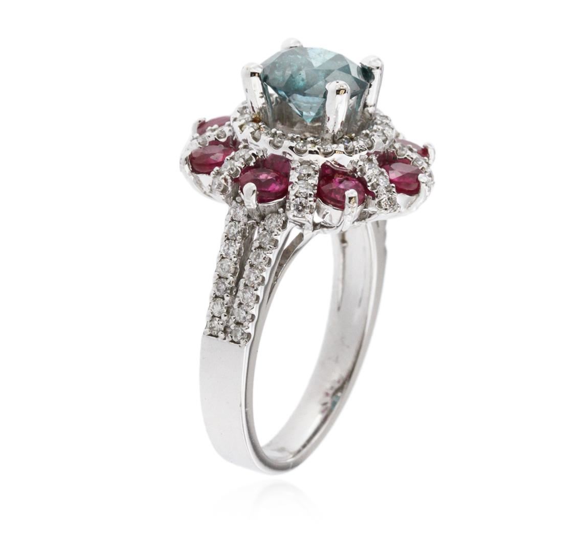 One electronically tested 14KT white gold ladies cast diamond and ruby ring with a bright polish finish. Identified with markings of "K14". Condition is new. Containing: One prong set round brilliant cut diamond, measuring 7.10 - 7.10 x 4.26mm (depth est.) approximate weight of 1.31ct. Clarity: I-3, Cut is Good. Seventy-Three prong set round brilliant cut diamonds, measuring 1.30 - 1.30 x 0.78mm (depth est.) approximate total weight of 73 Stones = 0.58ct. Clarity: SI-2 to I-1. Color: I - J, Cut is Good. Eight prong set round modified brilliant cut natural rubies, measuring 3.20 - 3.20 x 2.08 mm, approximate total weight of 1.36ct., clarity is heavily included, medium light, moderately strong, strongly purplish red color, (GIA stpR 4/4), cut is good. Colored gemstones are presumed to have been subjected to commonly used enhancement processes. All diamonds and colored gemstones are graded in the mounting, unless otherwise stated. Total Weight of Colored Stones 1.36ct. Total Weight of Diamonds 1.89ct. Total Weight of Ring 7.00 grams. GGL Appraised at $5,705.00.