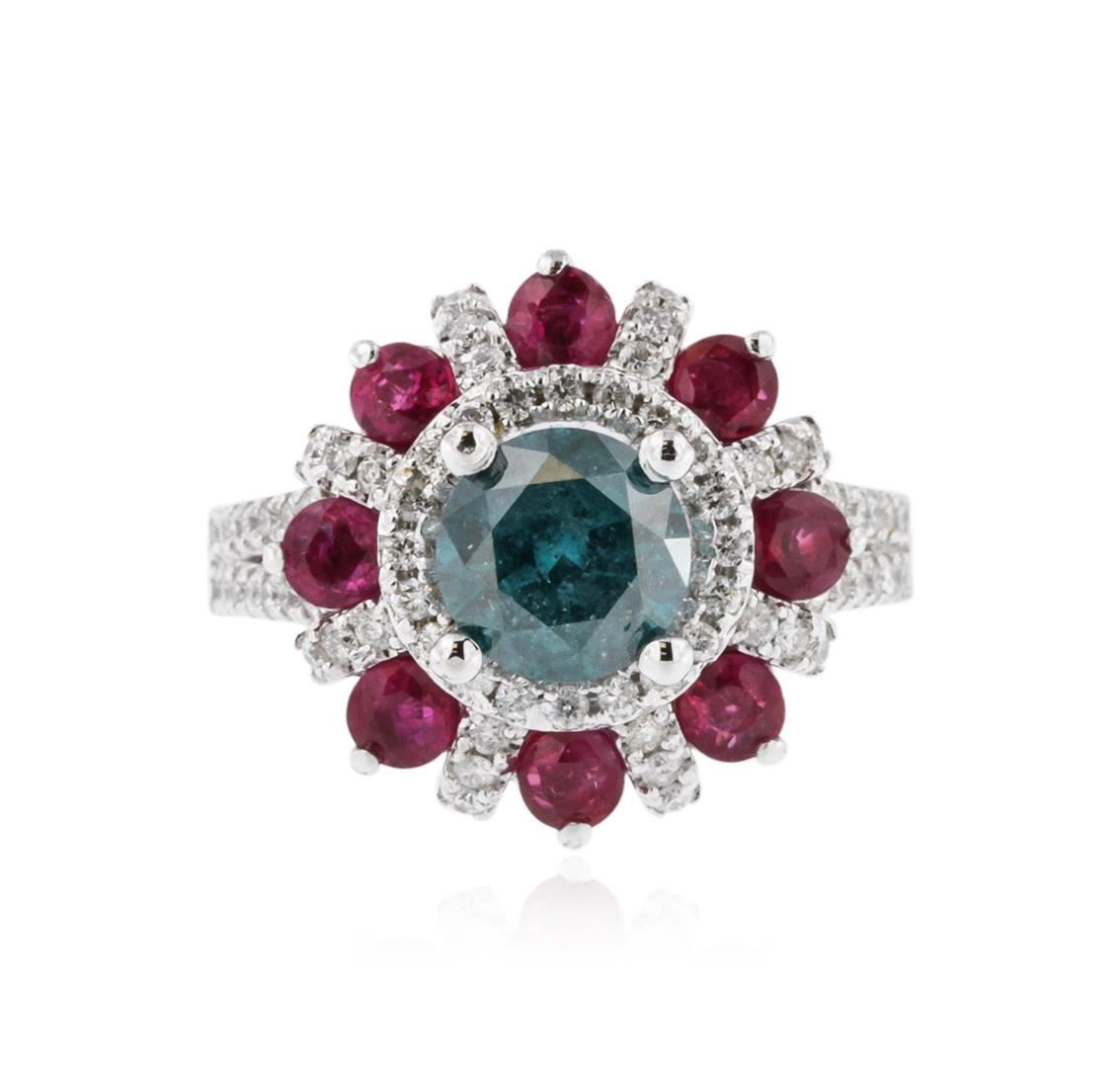 One electronically tested 14KT white gold ladies cast diamond and ruby ring with a bright polish finish. Identified with markings of "K14". Condition is new. Containing: One prong set round brilliant cut diamond, measuring 7.10 - 7.10 x 4.26mm (depth est.) approximate weight of 1.31ct. Clarity: I-3, Cut is Good. Seventy-Three prong set round brilliant cut diamonds, measuring 1.30 - 1.30 x 0.78mm (depth est.) approximate total weight of 73 Stones = 0.58ct. Clarity: SI-2 to I-1. Color: I - J, Cut is Good. Eight prong set round modified brilliant cut natural rubies, measuring 3.20 - 3.20 x 2.08 mm, approximate total weight of 1.36ct., clarity is heavily included, medium light, moderately strong, strongly purplish red color, (GIA stpR 4/4), cut is good. Colored gemstones are presumed to have been subjected to commonly used enhancement processes. All diamonds and colored gemstones are graded in the mounting, unless otherwise stated. Total Weight of Colored Stones 1.36ct. Total Weight of Diamonds 1.89ct. Total Weight of Ring 7.00 grams. GGL Appraised at $5,705.00.