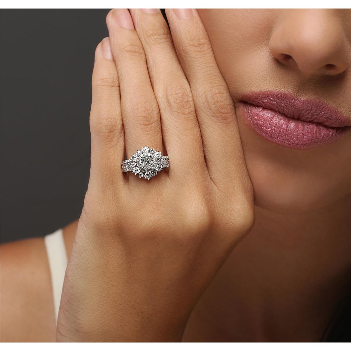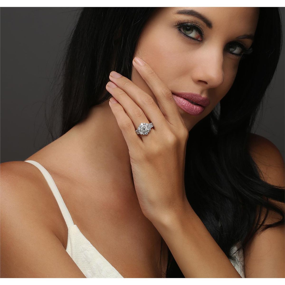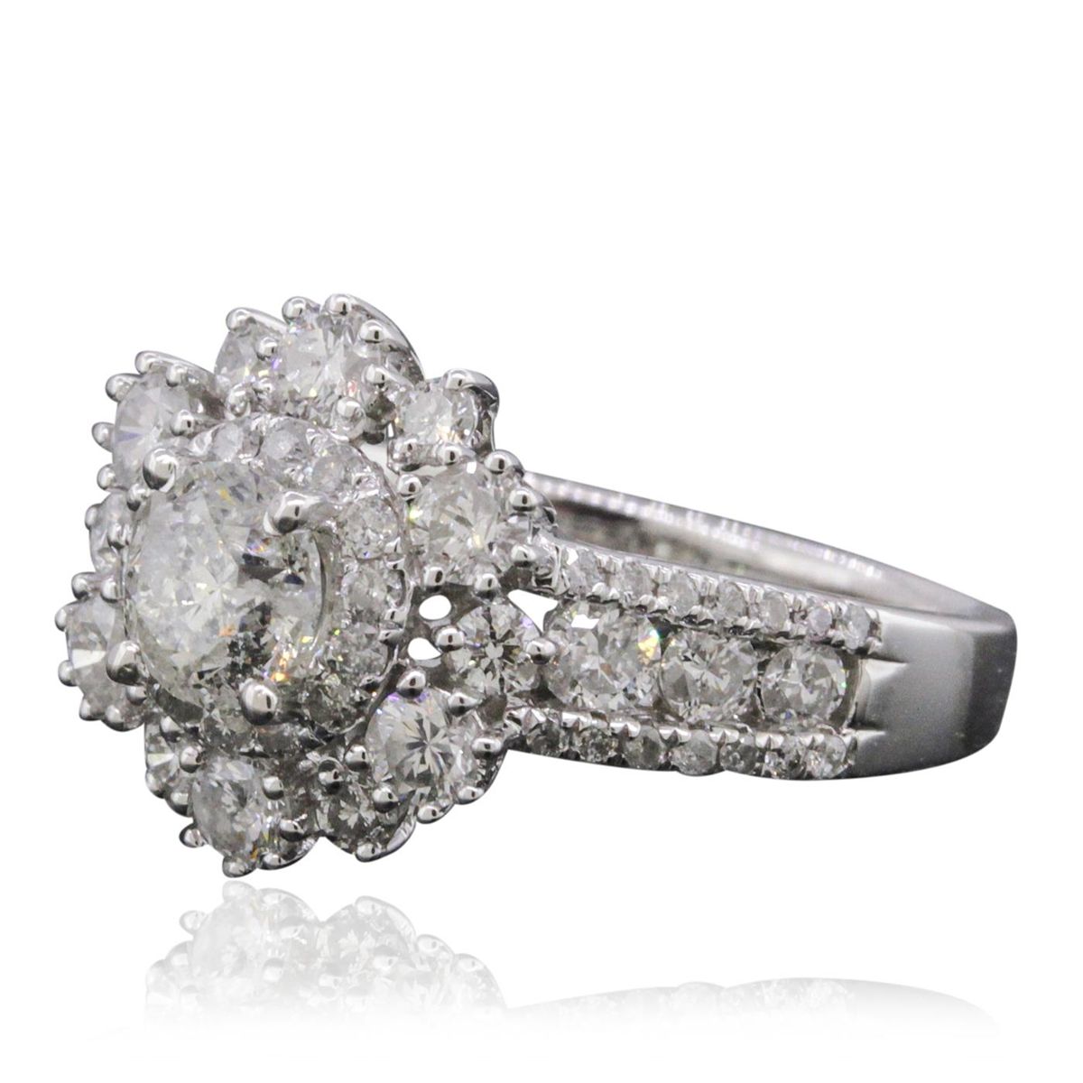 One electronically tested 14KT white gold ladies combination cast & assembled engagement ring with a split shank with a bright polish finish. Identified with markings of "14K". Condition is new. Containing: One prong set round brilliant cut diamond, measuring 5.38 - 5.37 x 3.19mm (depth est.) approximate weight of 0.56ct. Clarity: I-3. Color: K, Cut is Good. Eighteen prong set round brilliant cut diamonds, measuring 2.90 - 2.10 x 1.50mm (depth est.) approximate total weight of 18 Stones = 1.03ct. Clarity: SI-1 to I-1. Color: I - J, Cut is Good. Forty-Two prong set round brilliant cut diamonds, measuring 1.40 - 1.10 x 0.75mm (depth est.) approximate total weight of 42 Stones = 0.30ct. Clarity: SI-1 to I-1. Color: I - J, Cut is Good. All diamonds are graded in the mounting, unless otherwise stated. Total Weight of Diamonds 1.89ct. Total Weight of Ring 4.40 grams. GGL Appraised at $6,640.00.