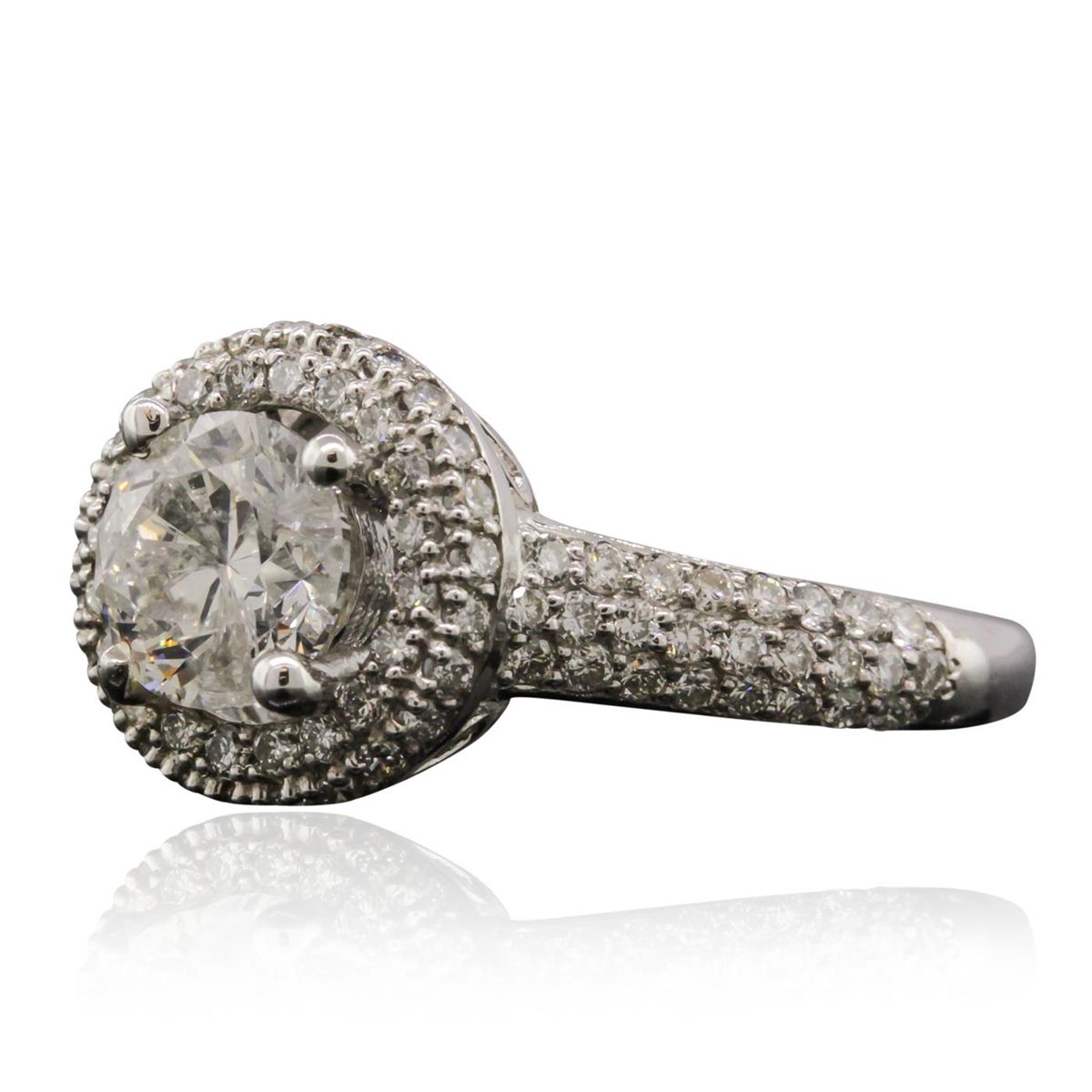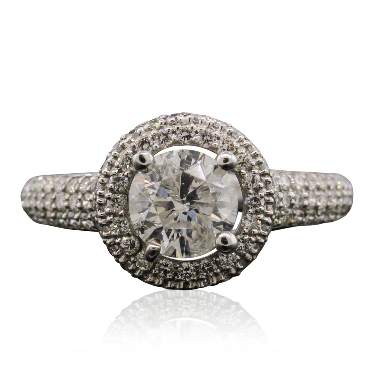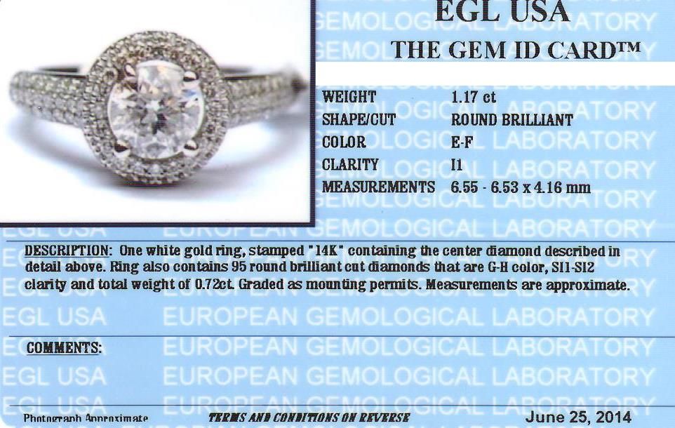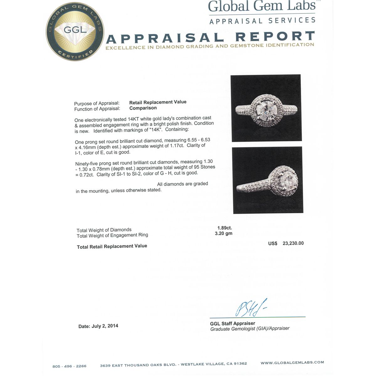 One electronically tested 14KT white gold Ladies combination cast & assembled engagement ring with a bright polish finish. Condition is new. Identified with markings of "14K". Containing: One prong set round brilliant cut diamond, measuring 6.55 - 6.53 x 4.16mm (depth est.) approximate weight of 1.17ct. Clarity: I-1. Color: E, Cut is Good. Ninety-Five prong set round brilliant cut diamonds, measuring 1.30 - 1.30 x 0.78mm (depth est.) approximate. Total Weight of 95 Stones = 0.72ct. Clarity: SI-1 to SI-2. Color: G - H, Cut is Good. EGL USA GEM ID# US 911348419D. All diamonds are graded in the mounting, unless otherwise stated. Total Weight of Diamonds 1.89ct. Total Weight of Engagement Ring 3.20 grams. GGL Appraised at $23,230.00.