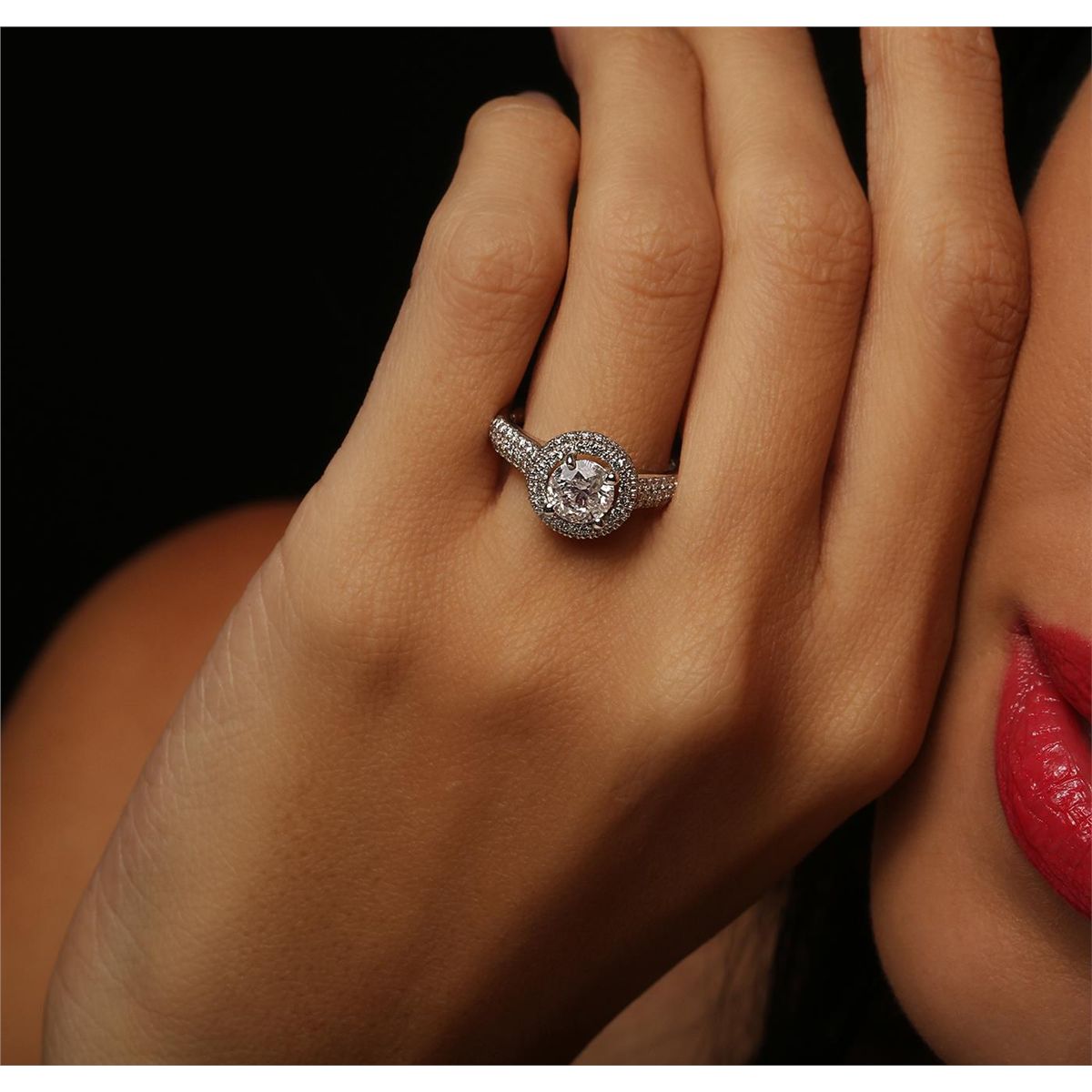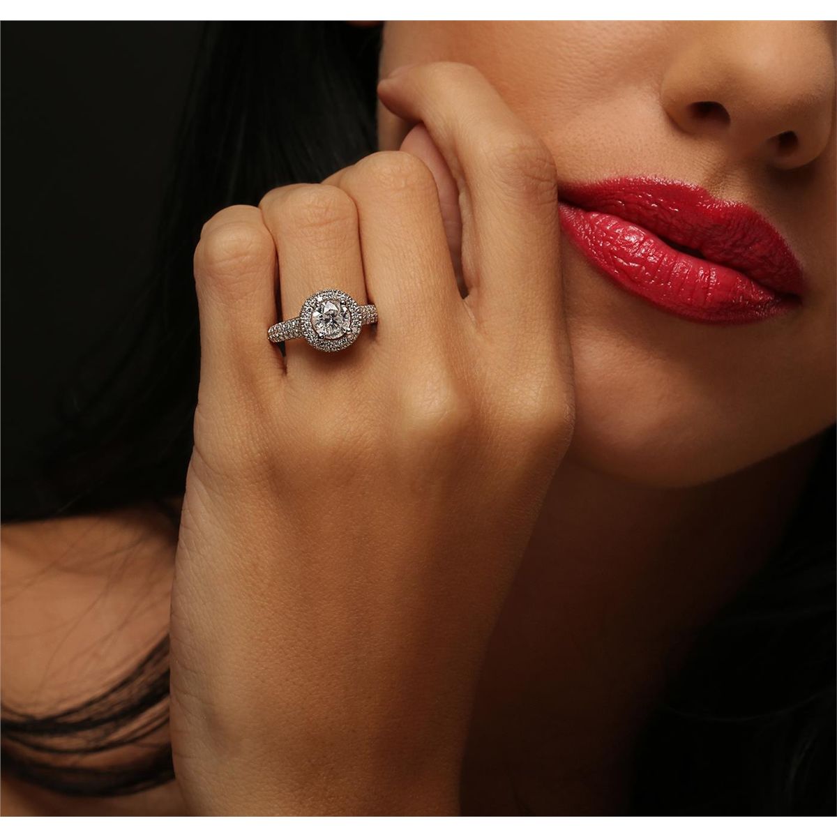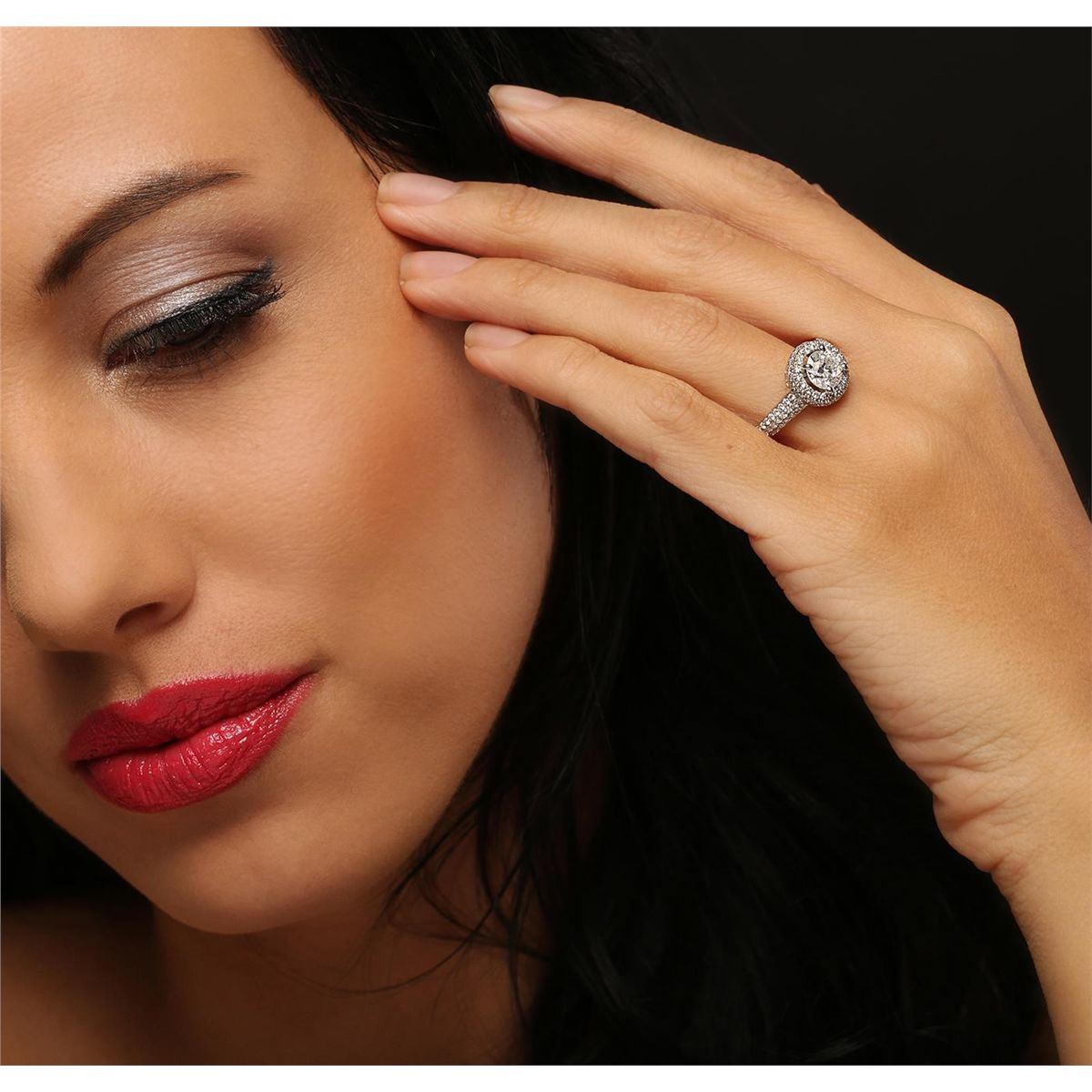 One electronically tested 14KT white gold Ladies combination cast & assembled engagement ring with a bright polish finish. Condition is new. Identified with markings of "14K". Containing: One prong set round brilliant cut diamond, measuring 6.55 - 6.53 x 4.16mm (depth est.) approximate weight of 1.17ct. Clarity: I-1. Color: E, Cut is Good. Ninety-Five prong set round brilliant cut diamonds, measuring 1.30 - 1.30 x 0.78mm (depth est.) approximate. Total Weight of 95 Stones = 0.72ct. Clarity: SI-1 to SI-2. Color: G - H, Cut is Good. EGL USA GEM ID# US 911348419D. All diamonds are graded in the mounting, unless otherwise stated. Total Weight of Diamonds 1.89ct. Total Weight of Engagement Ring 3.20 grams. GGL Appraised at $23,230.00.