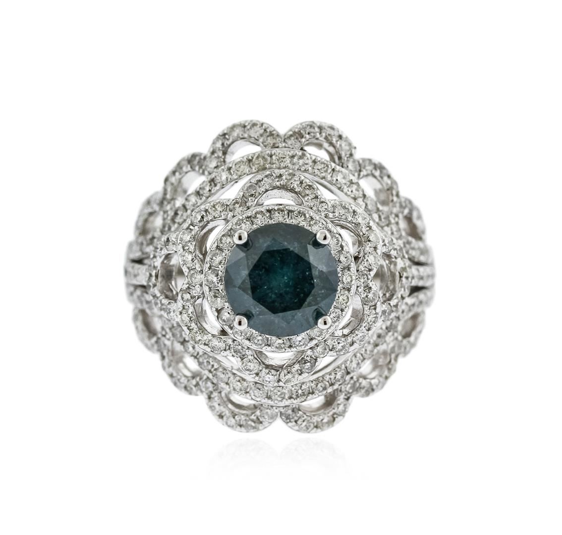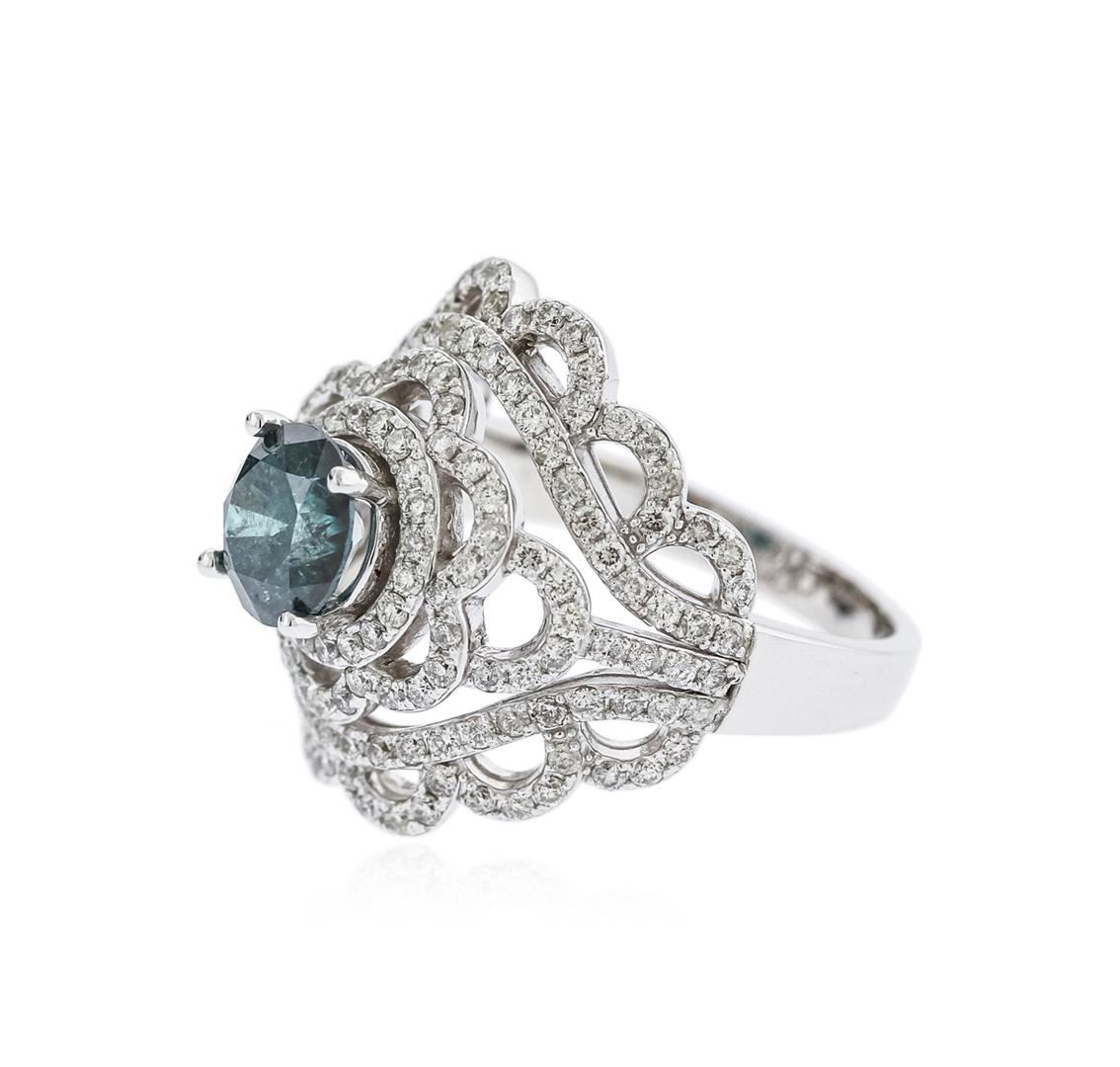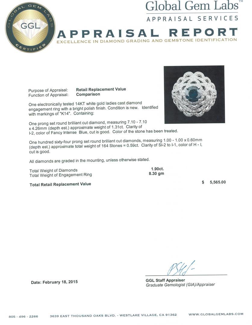 One electronically tested 14KT white gold ladies cast diamond engagement ring with a bright polish finish. Identified with markings of "K14". Condition is new. Containing: One prong set round brilliant cut diamond, measuring 7.10 - 7.10 x 4.26mm (depth est.) approximate weight of 1.31ct. Clarity: I-2, Cut is Good. Color of the stone has been treated. One Hundred Sixty-Four prong set round brilliant cut diamonds, measuring 1.00 - 1.00 x 0.60mm (depth est.) approximate total weight of 164 Stones = 0.59ct. Clarity: SI-2 to I-1. Color: H - I, Cut is Good. All diamonds are graded in the mounting, unless otherwise stated. Total Weight of Diamonds 1.90ct. Total Weight of Engagement Ring 8.30 grams. GGL Appraised at $5,565.00.