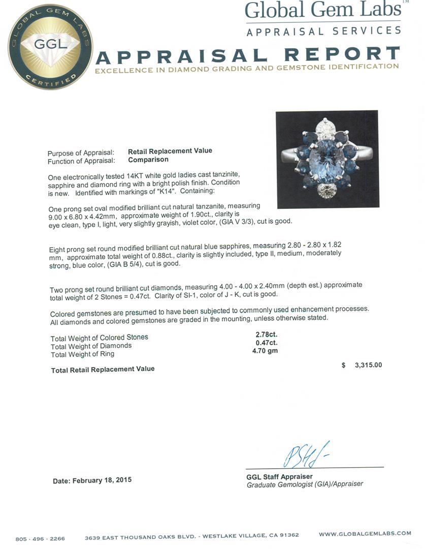 One electronically tested 14KT white gold ladies cast tanzinite, sapphire and diamond ring with a bright polish finish. Identified with markings of "K14". Condition is new. Containing: One prong set oval modified brilliant cut natural tanzanite, measuring 9.00 x 6.80 x 4.42mm, approximate weight of 1.90ct., clarity is eye clean, type I, light, very slightly grayish, violet color, (GIA V 3/3), cut is good. Eight prong set round modified brilliant cut natural blue sapphires, measuring 2.80 - 2.80 x 1.82 mm, approximate total weight of 0.88ct., clarity is slightly included, type II, medium, moderately strong, blue color, (GIA B 5/4), cut is good. Two prong set round brilliant cut diamonds, measuring 4.00 - 4.00 x 2.40mm (depth est.) approximate total weight of 2 Stones = 0.47ct. Clarity: SI-1. Color: J - K, Cut is Good. Colored gemstones are presumed to have been subjected to commonly used enhancement processes. All diamonds and colored gemstones are graded in the mounting, unless otherwise stated. Total Weight of Colored Stones 2.78ct. Total Weight of Diamonds 0.47ct. Total Weight of Ring 4.70 grams. GGL Appraised at $3,315.00.