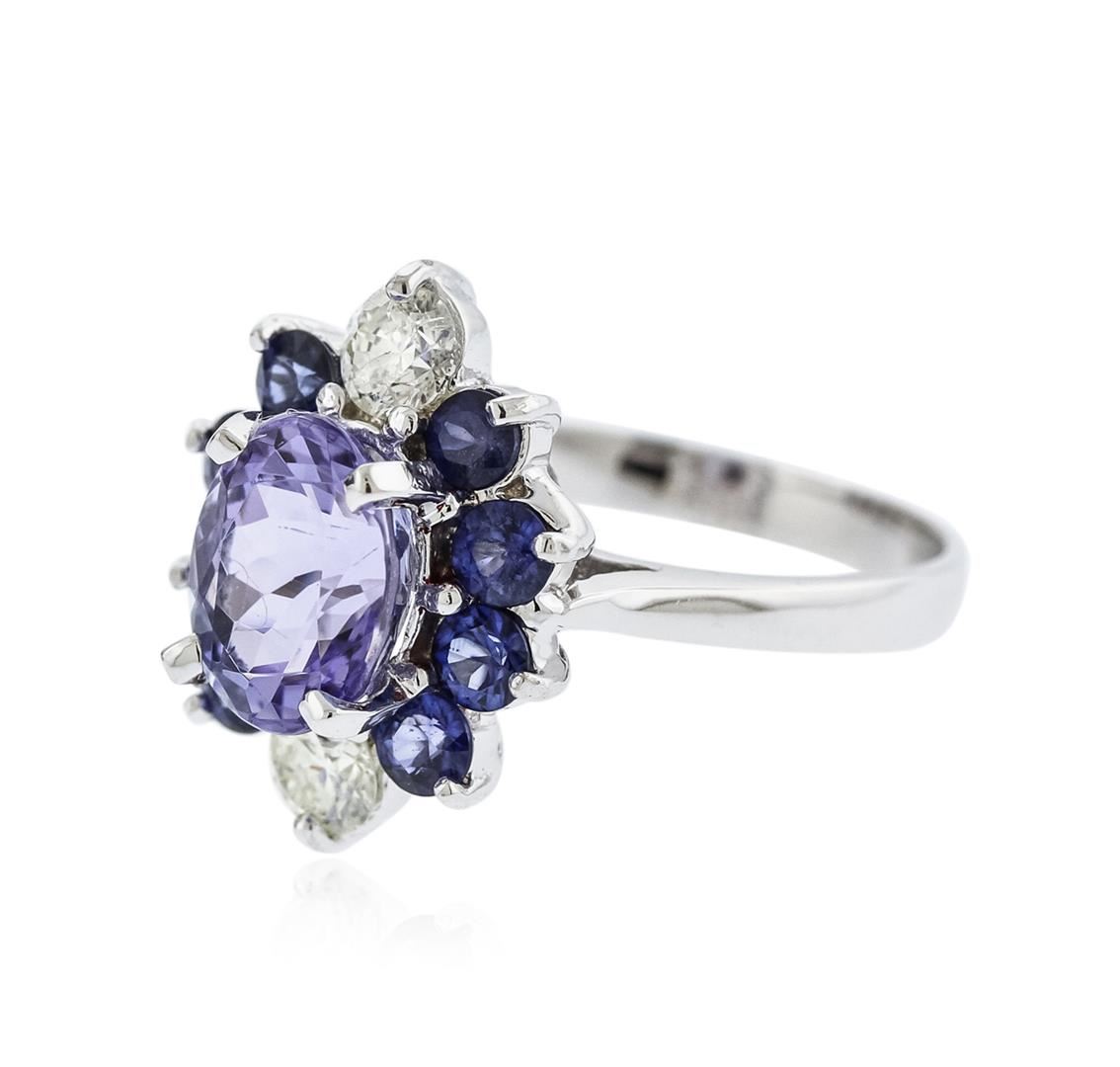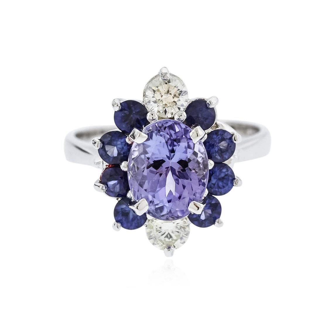One electronically tested 14KT white gold ladies cast tanzinite, sapphire and diamond ring with a bright polish finish. Identified with markings of "K14". Condition is new. Containing: One prong set oval modified brilliant cut natural tanzanite, measuring 9.00 x 6.80 x 4.42mm, approximate weight of 1.90ct., clarity is eye clean, type I, light, very slightly grayish, violet color, (GIA V 3/3), cut is good. Eight prong set round modified brilliant cut natural blue sapphires, measuring 2.80 - 2.80 x 1.82 mm, approximate total weight of 0.88ct., clarity is slightly included, type II, medium, moderately strong, blue color, (GIA B 5/4), cut is good. Two prong set round brilliant cut diamonds, measuring 4.00 - 4.00 x 2.40mm (depth est.) approximate total weight of 2 Stones = 0.47ct. Clarity: SI-1. Color: J - K, Cut is Good. Colored gemstones are presumed to have been subjected to commonly used enhancement processes. All diamonds and colored gemstones are graded in the mounting, unless otherwise stated. Total Weight of Colored Stones 2.78ct. Total Weight of Diamonds 0.47ct. Total Weight of Ring 4.70 grams. GGL Appraised at $3,315.00.