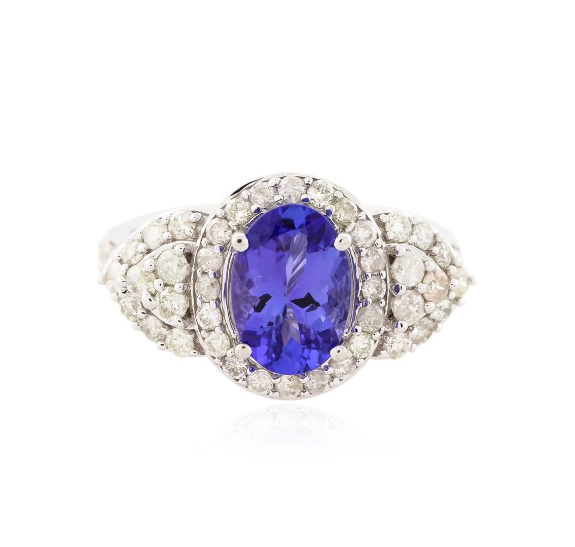One electronically tested 14KT white gold ladies cast tanzanite and diamond ring with a bright polish finish. Identified with markings of "14K". Condition is new. Containing: One prong set oval modified brilliant cut natural tanzanite, measuring 9.53 x 6.60 x 4.29mm, approximate weight of 1.90ct., clarity is eye clean, type I, medium light, very slightly grayish, violet color, (GIA V 4/3), cut is good. Forty-Eight prong set round brilliant cut diamonds, measuring 1.60 - 1.60 x 0.96mm (depth est.) approximate total weight of 48 Stones = 0.72ct. Clarity: I-1 to I-2. Color: I - J. Colored gemstones are presumed to have been subjected to commonly used enhancement processes. All diamonds and colored gemstones are graded in the mounting, unless otherwise stated. Total Weight of Colored Stones 1.90ct. Total Weight of Diamonds 0.72ct. Total Weight of Ring 5.50 grams. GGL Appraised at $4,020.00.